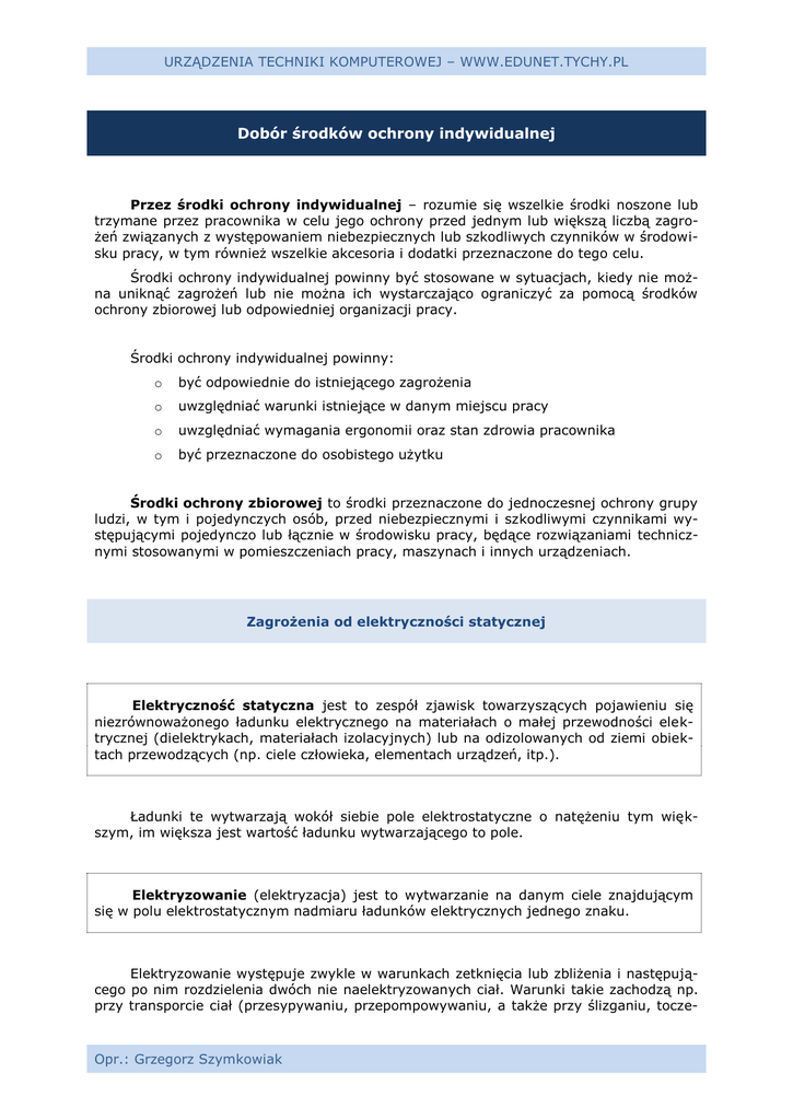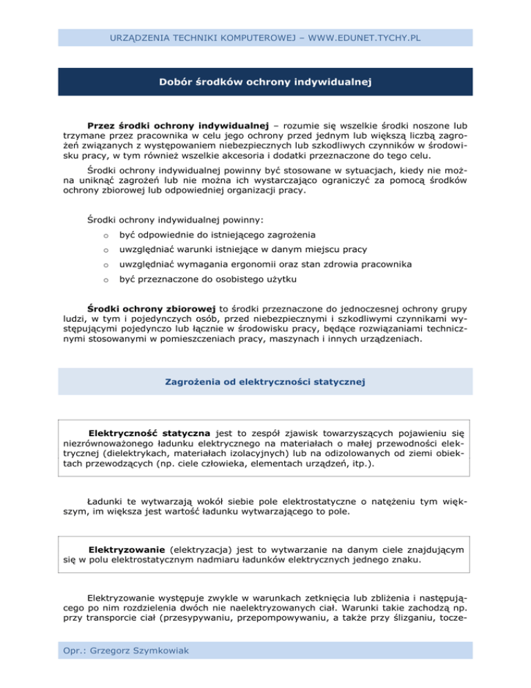 URZĄDZENIA TECHNIKI KOMPUTEROWEJ – WWW.EDUNET.TYCHY.PL Dobór środków ochrony indywidualnej Przez środki ochrony indywidualnej – rozumie się wszelkie środki noszone lub trzymane przez pracownika w celu jego ochrony przed jednym lub większą liczbą zagrożeń związanych z występowaniem niebezpiecznych lub szkodliwych czynników w środowisku pracy, w tym również wszelkie akcesoria i dodatki przeznaczone do tego celu. Środki ochrony indywidualnej powinny być stosowane w sytuacjach, kiedy nie można uniknąć zagrożeń lub nie można ich wystarczająco ograniczyć za pomocą środków ochrony zbiorowej lub odpowiedniej organizacji pracy. Środki ochrony indywidualnej powinny: o być odpowiednie do istniejącego zagrożenia o uwzględniać warunki istniejące w danym miejscu pracy o uwzględniać wymagania ergonomii oraz stan zdrowia pracownika o być przeznaczone do osobistego użytku Środki ochrony zbiorowej to środki przeznaczone do jednoczesnej ochrony grupy ludzi, w tym i pojedynczych osób, przed niebezpiecznymi i szkodliwymi czynnikami występującymi pojedynczo lub łącznie w środowisku pracy, będące rozwiązaniami technicznymi stosowanymi w pomieszczeniach pracy, maszynach i innych urządzeniach. Zagrożenia od elektryczności statycznej Elektryczność statyczna jest to zespół zjawisk towarzyszących pojawieniu się niezrównoważonego ładunku elektrycznego na materiałach o małej przewodności elektrycznej (dielektrykach, materiałach izolacyjnych) lub na odizolowanych od ziemi obiektach przewodzących (np. ciele człowieka, elementach urządzeń, itp.). Ładunki te wytwarzają wokół siebie pole elektrostatyczne o natężeniu tym większym, im większa jest wartość ładunku wytwarzającego to pole. Elektryzowanie (elektryzacja) jest to wytwarzanie na danym ciele znajdującym się w polu elektrostatycznym nadmiaru ładunków elektrycznych jednego znaku. Elektryzowanie występuje zwykle w warunkach zetknięcia lub zbliżenia i następującego po nim rozdzielenia dwóch nie naelektryzowanych ciał. Warunki takie zachodzą np. przy transporcie ciał (przesypywaniu, przepompowywaniu, a także przy ślizganiu, tocze- Opr.: Grzegorz Szymkowiak URZĄDZENIA TECHNIKI KOMPUTEROWEJ – WWW.EDUNET.TYCHY.PL niu, uderzaniu, rozdrabnianiu, przepływie), jak również ich mieszaniu. Możliwe też jest przy zmianach stanu skupienia, przy ich jonizacji, przy oddziaływaniu indukcyjnym czy mechanicznym powodującym efekt piezoelektryczny, jak i w różnych procesach elektrochemicznych. Wyróżnia się trzy rodzaje zagrożeń elektrycznością statyczną: - niekorzystne oddziaływanie na człowieka - zakłócenia procesów technologicznych - pożarowo-wybuchowe Ładunki elektrostatyczne mogą powstawać na ludziach drogą kontaktową w czasie chodzenia, zdejmowania odzieży albo wykonywania czynności domowych lub zawodowych. Elektryzacja ludzi może również nastąpić przez indukcję. Ciało człowieka może gromadzić ładunki elektryczne, jeśli jest odpowiednio odizolowane od ziemi, np. przez nieprzewodzące obuwie lub podłogę. Energia związana z naładowaniem elektrostatycznym człowieka wynosi od kilku do kilkudziesięciu mJ. Oddziaływanie elektryczności statycznej na ludzi jest następujące: o przebywanie pod wpływem pola elektrostatycznego przez dłuższy czas ma ujemny wpływ na stan zdrowia i samopoczucie ludzi o wyładowania elektrostatyczne powstają przy zbliżeniu do uziemionego obiektu; poza niemiłym lub groźnym uczuciem, wyładowania mogą prowadzić do urazów mechanicznych przy występujących odruchach. Wyładowanie zwykle jest słabo odczuwalne lub nieodczuwalne, a przy wyższych poziomach napięcia i energii (o energii ok. 250 mJ) może spowodować wystąpienie ciężkiego szoku. Ponieważ wartości te znacznie przekraczają minimalne energie zapłonu wielu mieszanin wybuchowych, zachodzi też niebezpieczeństwo inicjacji wybuchu przy wyładowaniu z człowieka w warunkach zagrożenia wybuchowego lub pożarowego. Silne pola elektrostatyczne mogą powodować zakłócenia w działaniu aparatury kontrolno-pomiarowej, komputerów oraz we wszelkich urządzeniach elektronicznych zawierających elementy półprzewodnikowe. Wyładowania elektryczności statycznej prowadzą też do trwałych uszkodzeń elementów półprzewodnikowych. Może je powodować sam człowiek, kiedy jest naładowany i dotyka tych elementów, np. w trakcie procesu produkcji czy przy montażu. Środki ochrony przed elektrycznością statyczną Środki ochrony przed elektrycznością statyczną powinny eliminować możliwość elektryzacji obiektów lub, jeżeli to niemożliwe, zapewniać bezpieczne odprowadzanie ładunków elektrycznych. Opr.: Grzegorz Szymkowiak URZĄDZENIA TECHNIKI KOMPUTEROWEJ – WWW.EDUNET.TYCHY.PL W celu odprowadzania ładunków elektryczności statycznej z metalowych i przewodzących części i urządzeń stosuje się uziemienia i połączenia wyrównawcze. Uziemianie powinno zapewnić spływ ładunków bez wystąpienia zagrożenia wybuchowego lub pożarowego. Czasem zdarza się, że uziemienie nie spełnia roli odprowadzania ładunków elektrostatycznych do ziemi, np. jeżeli spływ ładunków występuje tylko z warstwy cieczy przylegającej do ścianek zbiornika. W celu ochrony przed elektrycznością statyczną stosuje się powszechnie antystatyzację tkanin i odzieży. Antystatyzacja polega na zmianie właściwości materiałów i substancji w celu zmniejszenia ich elektryzacji i gromadzenia się ładunków. o Antystatyzacja trwała tkanin uzyskiwana przez odpowiedni dobór struktury włókien mieszanin tworzyw sztucznych z bawełną lub lnem o Antystatyzacja okresowa otrzymana się przez preparację powierzchniową włókien w procesie produkcji. Po kilkunastu praniach (co najmniej 10) właściwości antystatyczne okresowe zanikają i tkaniny podlegają znowu elektryzacji. Powszechna jest również antystatyzacja doraźna, uzyskiwana przez płuk