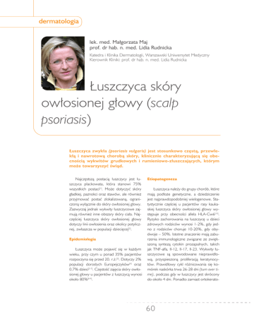 dermatologia lek. med. Małgorzata Maj prof. dr hab. n. med. Lidia Rudnicka Katedra i Klinika Dermatologii, Warszawski Uniwersytet Medyczny Kierownik Kliniki: prof. dr hab. n. med. Lidia Rudnicka Łuszczyca skóry owłosionej głowy (scalp psoriasis) Łuszczyca zwykła (psoriasis vulgaris) jest stosunkowo częstą, przewlekłą i nawrotową chorobą skóry, klinicznie charakteryzującą się obecnością wykwitów grudkowych i rumieniowo-złuszczających, którym może towarzyszyć świąd. Najczęstszą postacią łuszczycy jest łuszczyca plackowata, która stanowi 75% wszystkich postaci[1]. Może dotyczyć skóry gładkiej, paznokci oraz stawów, ale również przyjmować postać zlokalizowaną, ograniczoną wyłącznie do skóry owłosionej głowy. Zazwyczaj jednak wykwity łuszczycowe zajmują również inne obszary skóry ciała. Najczęściej łuszczyca skóry owłosionej głowy dotyczy linii owłosienia oraz okolicy potylicznej, zwłaszcza w populacji dziecięcej[2]. Epidemiologia Łuszczyca może pojawić się w każdym wieku, przy czym u ponad 35% pacjentów rozpoczyna się przed 20. r.ż.[3]. Dotyczy 2% populacji dorosłych Europejczyków[4] oraz 0,7% dzieci[5-7]. Częstość zajęcia skóry owłosionej głowy u pacjentów z łuszczycą wynosi około 80%[8-9]. Etiopatogeneza Łuszczyca należy do grupy chorób, które mają podłoże genetyczne, a dziedziczenie jest najprawdopodobniej wielogenowe. Statystycznie częściej u pacjentów rasy kaukaskiej łuszczyca skóry owłosionej głowy występuje przy obecności allela HLA-Cw6[10]. Ryzyko zachorowania na łuszczycę u dzieci zdrowych rodziców wynosi 1-2%, gdy jedno z rodziców choruje 10-20%, gdy obydwoje – 50%. Istotne znaczenie mają zaburzenia immunologiczne związane ze zwiększoną syntezą cytokin prozapalnych, takich jak TNF-alfa, Il-12, Il-17, Il-23. Wykwity łuszczycowe są spowodowane nieprawidłową, przyspieszoną proliferacją keratynocytów. Prawidłowy cykl różnicowania się komórek naskórka trwa 26-28 dni (turn over time), podczas gdy w łuszczycy jest skrócony do około 4 dni. Ponadto zamiast ortokerato- 60 zy, czyli prawidłowego dojrzewania i różnicowania się keratynocytów, dochodzi do parakeratozy, czyli zjawiska, w którym powstają nieprawidłowo zróżnicowane komórki. W warstwie rogowej nie tracą one jąder komórkowych i nie złuszczają się prawidłowo, dlatego powstaje łuska. Czynniki zaostrzające Łuszczyca charakteryzuje się częstymi zaostrzeniami i nawrotami. Czynnikami, które sprzyjają zaostrzeniom choroby mogą być: stres, nikotyna, alkohol, urazy, infekcje dróg oddechowych, zakażenia układu moczowego, próchnica zębów, zaburzenia hormonalne, niekiedy ciąża oraz niektóre leki: beta-adrenolityki, preparaty stosowane w leczeniu malarii, lit, niesteroidowe leki przeciwzapalne (NLPZ). Objawy kliniczne Łuszczyca skóry owłosionej głowy charakteryzuje się obecnością stanu zapalnego z rumieniowymi plamami i tarczkami oraz wykwitów grudkowych pokrytych srebrzystobiałą łuską. Może im towarzyszyć wzmożone wypadanie włosów, czyli łysienie, świąd oraz ból (scalp dysesthesia). Łysienie wynika z obecności przewlekłego stanu zapalnego i drażnienia. Aby uniknąć tego procesu, należy jak najszybciej podjąć skuteczne leczenie i profilaktykę nawrotów. Łuszczycę skóry owłosionej głowy można ocenić według skali Psoriasis Scalp Severity Index (PSSI), w której określamy stopień nasilenia rumienia, nacieku i łuski[11]. Diagnostyka różnicowa i metody diagnostyczne Metodami, którymi możemy posłużyć się w celu ustalenia rozpoznania, są: trichoskopia (dermoskopia skóry owłosionej głowy), badanie mikrobiologiczne (w tym mykologiczne bezpośrednie i hodowla) oraz badanie histopatologiczne wycinka skóry. Charakterystyczne struktury dla łuszczycy w trichoskopii to: • w małym powiększeniu (w dermoskopii): czerwone kropki i globulki (red dots and globules), obecność białej łuski (white interfollicular scalling), czerwone globulki układające się w pierścienie (dots and globules in circulararrangement), czerwone globulki układające się w linie (dots and globules in lineararrangements), rumieniowe tło (erythematous background), • w dużym powiększaniu (>50x, wideodermoskopia): naczynia kłębuszkowate o układzie linii lub pierścieni (glomerular vessels arranged in lines orrings), grupy homogennych naczyń np. linijne, pętle, przecinkowate, przypominające koronkę (clusters of multiple vessles arranged in a homogenous pattern: linear, looped, comma-like, lace-like), wynaczynienia (blood extravasations)[12]. Łuszczycę skóry owłosionej głowy najczęściej różnicujemy z łojotokowym zapaleniem skóry, charakteryzującym się obecnością w trichoskopii: cienkich naczyń drzewkowatych, żółtej łuski, naczyń krwionośnych o nieregularnym układzie i rzadko obserwowanych wynaczynień[12]. W badaniu histopatologicznym widoczne są: parakeratoza, nacieki z leukocytów wielojądrzastych i mikroropnie Munro, nacieki z limfocytów T w górnych warstwach skóry właściwej oraz poszerzone i poskręcane pętle włośniczkowe w brodawkach skóry. Leczenie W diagnostyce różnicowej należy uwzględnić przede wszystkim łojotokowe zapalenie skóry owłosionej głowy i grzybicę. W leczeniu łuszczycy skóry owłosionej głowy lekami pierwszego wyboru są leki 62 miejscowe[13]. Zastosowanie w terapii znajdują środki keratolityczne zawierające kwas salicylowy, mocznik i kwas mlekowy. Ich celem jest usunięcie nawarstwionych, złuszczających się warstw naskórka. Kwas salicylowy, dzięki temu, że wykazuje zdolności bakteriostatyczne, przenikające przez warstwę sebum i wnikające w głąb mieszków włosowo-łojowych, jest w szczególności polecany osobom z nadmiernym wydzielaniem sebum. Zalecane są również preparaty przeciwzapalne glikokortykosteroidowe, takie jak: hydrokortyzon (płyn, emulsja, lotio), mometazon w po