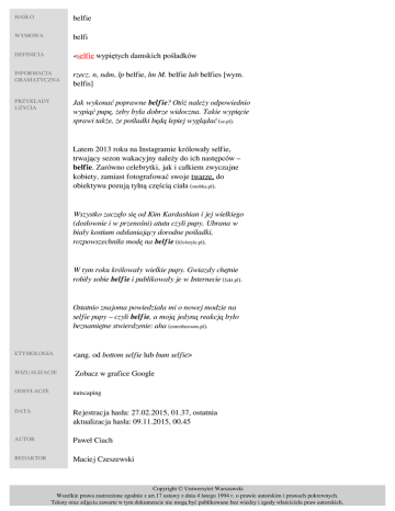 HASŁO belfie WYMOWA belfi DEFINICJA «selfie wypiętych damskich pośladków» INFORMACJA GRAMATYCZNA rzecz. n, ndm, lp belfie, lm M. belfie lub belfies [wym. belfis] PRZYKŁADY UŻYCIA Jak wykonać poprawne belfie? Otóż należy odpowiednio wypiąć pupę, żeby była dobrze widoczna. Takie wypięcie sprawi także, że pośladki będą lepiej wyglądać (se.pl). Latem 2013 roku na Instagramie królowały selfie, trwający sezon wakacyjny należy do ich następców – belfie. Zarówno celebrytki, jak i całkiem zwyczajne kobiety, zamiast fotografować swoje twarze, do obiektywu pozują tylną częścią ciała (snobka.pl). Wszystko zaczęło się od Kim Kardashian i jej wielkiego (dosłownie i w przenośni) atutu czyli pupy. Ubrana w biały kostium odsłaniający dorodne pośladki, rozpowszechniła modę na belfie (life4style.pl). W tym roku królowały wielkie pupy. Gwiazdy chętnie robiły sobie belfie i publikowały je w Internecie (fakt.pl). Ostatnio znajoma powiedziała mi o nowej modzie na selfie pupy – czyli belfie, a moją jedyną reakcją było beznamiętne stwierdzenie: aha (entertheroom.pl). ETYMOLOGIA WIZUALIZACJE <ang. od bottom selfie lub bum selfie> Zobacz w grafice Google ODSYŁACZE nutscaping DATA Rejestracja hasła: 27.02.2015, 01.37, ostatnia aktualizacja hasła: 09.11.2015, 00.45 AUTOR Paweł Ciach REDAKTOR Maciej Czeszewski Copyright © Uniwersytet Warszawski Wszelkie prawa zastrzeżone zgodnie z art.17 ustawy z dnia 4 lutego 1994 r. o prawie autorskim i prawach pokrewnych. Teksty oraz zdjęcia zawarte w tym dokumencie nie mogą być publikowane bez wiedzy i zgody właściciela praw autorskich. Copyright © Uniwersytet Warszawski Wszelkie prawa zastrzeżone zgodnie z art.17 ustawy z dnia 4 lutego 1994 r. o prawie autorskim i prawach pokrewnych. Teksty oraz zdjęcia zawarte w tym dokumencie nie mogą być publikowane bez wiedzy i zgody właściciela praw autorskich. Powered by TCPDF (www.tcpdf.org)
