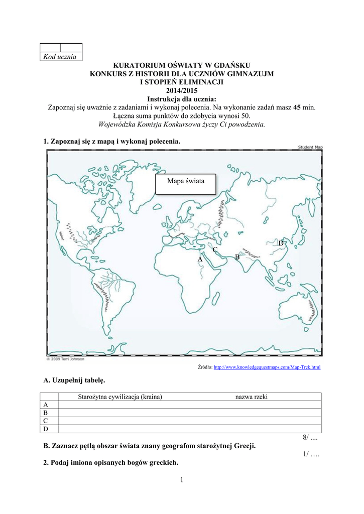 Kod ucznia KURATORIUM OŚWIATY W GDAŃSKU KONKURS Z HISTORII DLA UCZNIÓW GIMNAZUJM I STOPIEŃ ELIMINACJI 2014/2015 Instrukcja dla ucznia: Zapoznaj się uważnie z zadaniami i wykonaj polecenia. Na wykonanie zadań masz 45 min. Łączna suma punktów do zdobycia wynosi 50. Wojewódzka Komisja Konkursowa życzy Ci powodzenia. 1. Zapoznaj się z mapą i wykonaj polecenia. Mapa świata C A B D d Źródło: http://www.knowledgequestmaps.com/Map-Trek.html A. Uzupełnij tabelę. Starożytna cywilizacja (kraina) nazwa rzeki A B C D 8/ .... B. Zaznacz pętlą obszar świata znany geografom starożytnej Grecji. 1/ …. 2. Podaj imiona opisanych bogów greckich. 1 lp. A. B. C. D. bóg opis Najstarszy syn Rei i Kronosa, władca mórz i oceanów mieszkający w pałacu otoczonym przez nereidy i delfiny. Syn Rei i Kronosa, wychowany przez nimfy górskie i kozę Amalteę, władca błyskawic. Córka Zeusa i Demeter, opiekunka dusz zmarłych, porwana przez Hadesa do świata podziemnego. Syn Zeusa i Hery, patron szpiegów, katów i bezwzględnych dowódców, bóg odwagi i męstwa. 4/ …. 3. Zapoznaj się z pismem i odpowiedz na pytania. Źródło: http://codex99.com/typography/21.html A. Podaj, jak nazywa się to pismo. …………………………………………………………. 1/ …. B. Podaj, kraj w którym najwcześniej je wprowadzono. …………………………………………………………. 1/ …. 4. Wymień trzech pierwszych królów Polski. ………………………………… ………………………………… ………………………………… 3/ …. 5. Zapoznaj się z rysunkami i wykonaj polecenia. rys. 1 rys. 2 Źródło: http://historia_sztuki3.republika.pl/struktura_kosciola.html A. Nazwij rodzaje sklepień. Rys. 1 - ………………………………… Rys. 2 - ………………………………… 2/ …. B. Podaj nazwę stylu architektonicznego w średniowieczu, które te sklepienia charakteryzują. …………………………………………… 1/ …. 2 6. Wymień trzy zakony rycerskie założone w Ziemi Świętej w czasie wypraw krzyżowych. ……………………………….. ……………………………….. ……………………………….. 3/ …. 7. Przyporządkuj żonę do odpowiedniego władcy Polski. A. B. C. D. Maria Kazimiera d’Arquien Dobrawa Przemyślidka Jadwiga Andegaweńska Anna Jagiellonka A - …. B - …. C - …. 1. 2. 3. 4. 5. Mieszko I Władysław Jagiełło Stefan Batory Jan III Sobieski Stanisław August Poniatowski D - …. 4/ …. 8. Przeczytaj poniższy tekst źródłowy i odpowiedz na pytania. […] Ponieważ prawa ogólne i ustawy dotyczą nie pojedynczego człowieka, ale ogółu narodu, przeto na tym walnym sejmie radomskim wraz ze wszystkimi Królestwa naszego prałatami, radami i posłami ziemskimi za słuszne i sprawiedliwe uznaliśmy, jakoż postanowiliśmy, iż odtąd na potomne czasy nic nowego (nihil novi) stanowionym być nie ma przez nas i naszych następców, bez wspólnego zezwolenia senatorów i posłów ziemskich, co było ujmą i ku uciążeniu Rzeczypospolitej oraz ze szkodą i krzywdą czyjąśkolwiek, tudzież zmierzało ku zmianie prawa ogólnego i wolności publicznej. Źródło: Wiek XVI-XVIII w źródłach, opr. M. Sobańska-Bondaruk, S. B. Lenard, Warszawa 1997, s. 95. A. Podaj miejsce i rok ustanowienia opisanego prawa. ………………………………………………… B. Wymień dwie izby parlamentu uprawnione Rzeczypospolitej. …………………………………….. …………………………………….. do stanowienia 1/ …. prawa w 1/ …. 9. Zapoznaj się z obrazem i wykonaj polecenia. A. Podaj imię i nazwisko autora obrazu. ……………………………………………………………………. 1/ …. B. Podaj tytuł obrazu i wiek, w którym został namalowany. ……………………………………………………………………. 1/ …. 10. Uzupełnij tabelę dotyczącą odkryć geograficznych w XV-XVI w. 3 data podróżnik 1492 A. …………………………… C. ………… D. …………………………… 1519-1522 Ferdynand Magellan osiągnięcie B. ………………………………………….. odkrycie morskiej drogi do Indii E. ………………………………………….. 5/ .... 11. Przyporządkuj do liter elementu stroju szlacheckiego spośród podanych. baczmagi, karabela, kołpak, kontusz, żupan A. B. C. D. B A ………………………… ………………………… ………………………… ………………………… 4/ …. C D Źródło: http://grafik.rp.pl/g4a/725033,352265,9.jpg 12. Przeczytaj i uzupełnij tekst. Od początków …… wieku zaczęły powstawać w Ameryce angielskie osady. Najwięcej emigrantów przybywało z Anglii, Szkocji, Irlandii i Niemiec. Nakładanie przez metropolię nowych ………………… na kolonistów wywoływało jednak liczne protesty. Najważniejszy z nich miał miejsce w 1773 r. i przeszedł do historii jako „……………….. ………………. ………………….”. W czasie kilkuletniej wojny, trzynaście zbuntowanych stanów ogłosiło Deklarację niepodległości. Na czele wojsk kolonistów stanął ……… ……………… . Wojna zakończyła się klęską Wielkiej Brytanii uznaniem niepodległości Stanów Zjednoczonych. 4/ …. 13. Zapoznaj się ze zdjęciem i wykonaj polecenia. A. Podaj imię i nazwisko władcy, który ustanowił powyższe odznaczenie. ………………………………………………………… 1/ …. B. Podaj rok i nazwę wydarzenia historycznego, w czasie którego ustanowiono to odznaczenie. ………………………………………………………… 1/ …. Źródło: http://wolna-polska.pl/wiadomosci/w-rocznice-ustanowienia-krzyza-virtuti-militari-4-2012-06 14. W 1805 r. pod miejscowością Austerlitz (Sławków) doszło do starcia wojsk francuskich z III koalicją antyfrancuską. Bit