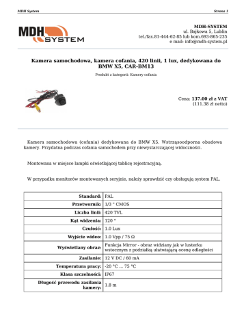MDH System Strona 1 MDH-SYSTEM ul. Bajkowa 5, Lublin tel./fax.81-444-62-85 lub kom.693-865-235 e mail: [email protected] Kamera samochodowa, kamera cofania, 420 linii, 1 lux, dedykowana do BMW X5, CAR-BM13 Produkt z kategorii: Kamery cofania Cena: 137.00 zł z VAT (111.38 zł netto) Kamera samochodowa (cofania) dedykowana do BMW X5. Wstrząsoodporna obudowa kamery. Przydatna podczas cofania samochodem przy niewystarczającej widoczności. Montowana w miejsce lampki oświetlającej tablicę rejestracyjną. W przypadku monitorów montowanych seryjnie, należy sprawdzić czy obsługują system PAL. Standard: PAL Przetwornik: 1/3 " CMOS Liczba linii: 420 TVL Kąt widzenia: 120 ° Czułość: 1.0 Lux Wyjście wideo: 1.0 Vpp / 75 Ω Wyświetlany obraz: Funkcja Mirror - obraz widziany jak w lusterku wstecznym z podziałką ułatwiającą ocenę odległości Zasilanie: 12 V DC / 60 mA Temperatura pracy: -20 °C ... 75 °C Klasa szczelności: IP67 Długość przewodu zasilania 1.8 m kamery: MDH System Strona 2 Długość dołączonego przewodu 6m wideo: Wymiary: 37 x 36 x 36 mm Wymiary kamery: MDH System Strona 3 W zestawie: Zrzut obrazu z kamery (funkcja Mirror). Obraz widziany jak w lusterku wstecznym z podziałką ułatwiającą ocenę odległości: MDH System Strona 4 Zapraszamy do naszego sklepu internetowego www.mdh-system.pl Dokument wygenerowany 2017-03-02 o godzinie 11:59