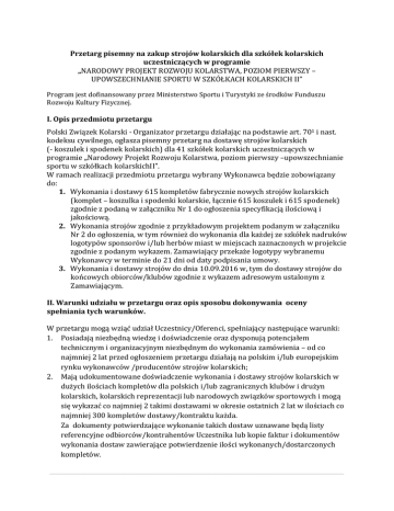 Przetarg pisemny na zakup strojów kolarskich dla szkółek kolarskich uczestniczących w programie „NARODOWY PROJEKT ROZWOJU KOLARSTWA, POZIOM PIERWSZY – UPOWSZECHNIANIE SPORTU W SZKÓŁKACH KOLARSKICH II” Program jest dofinansowany przez Ministerstwo Sportu i Turystyki ze środków Funduszu Rozwoju Kultury Fizycznej. I. Opis przedmiotu przetargu Polski Związek Kolarski - Organizator przetargu działając na podstawie art. 701 i nast. kodeksu cywilnego, ogłasza pisemny przetarg na dostawę strojów kolarskich (- koszulek i spodenek kolarskich) dla 41 szkółek kolarskich uczestniczących w programie „Narodowy Projekt Rozwoju Kolarstwa, poziom pierwszy –upowszechnianie sportu w szkółkach kolarskichII”. W ramach realizacji przedmiotu przetargu wybrany Wykonawca będzie zobowiązany do: 1. Wykonania i dostawy 615 kompletów fabrycznie nowych strojów kolarskich (komplet – koszulka i spodenki kolarskie, łącznie 615 koszulek i 615 spodenek) zgodnie z podaną w załączniku Nr 1 do ogłoszenia specyfikacją ilościową i jakościową. 2. Wykonania strojów zgodnie z przykładowym projektem podanym w załączniku Nr 2 do ogłoszenia, w tym również do wykonania dla każdej ze szkółek nadruków logotypów sponsorów i/lub herbów miast w miejscach zaznaczonych w projekcie zgodnie z podanym wykazem. Zamawiający przekaże logotypy wybranemu Wykonawcy w terminie do 21 dni od daty podpisania umowy. 3. Wykonania i dostawy strojów do dnia 10.09.2016 w, tym do dostawy strojów do końcowych obiorców/klubów zgodnie z wykazem adresowym ustalonym z Zamawiającym. II. Warunki udziału w przetargu oraz opis sposobu dokonywania oceny spełniania tych warunków. W przetargu mogą wziąć udział Uczestnicy/Oferenci, spełniający następujące warunki: 1. Posiadają niezbędną wiedzę i doświadczenie oraz dysponują potencjałem technicznym i organizacyjnym niezbędnym do wykonania zamówienia – od co najmniej 2 lat przed ogłoszeniem przetargu działają na polskim i/lub europejskim rynku wykonawców /producentów strojów kolarskich; 2. Mają udokumentowane doświadczenie wykonania i dostawy strojów kolarskich w dużych ilościach kompletów dla polskich i/lub zagranicznych klubów i drużyn kolarskich, kolarskich reprezentacji lub narodowych związków sportowych i mogą się wykazać co najmniej 2 takimi dostawami w okresie ostatnich 2 lat w ilościach co najmniej 300 kompletów dostawy/kontraktu każda. Za dokumenty potwierdzające wykonanie takich dostaw uznawane będą listy referencyjne odbiorców/kontrahentów Uczestnika lub kopie faktur i dokumentów wykonania dostaw zawierające potwierdzenie ilości wykonanych/dostarczonych kompletów. ____________________________________________________________________________________________________ Realizacja w/w dostaw może być wykazana kopiami dokumentów, faktur, pisemnymi potwierdzeniami realizacji dostaw od kontrahentów lub na zasadzie pisemnego oświadczenia Uczestnika/Oferenta, w którym należy podać nazwy i adresy odbiorców, terminy i wielkości dostaw oraz kontakty do osób reprezentujących odbiorców, które mogłyby potwierdzić realizację takich dostaw. 3. Nie zalegają z zapłatą podatków i składek na ubezpieczenie społeczne i przedstawią aktualne (wydane nie później niż 3 miesiące przed datą przetargu) zaświadczenie właściwego Urzędu Skarbowego oraz właściwego oddziału Zakładu Ubezpieczeń Społecznych lub Kasy Rolniczego Ubezpieczenia Społecznego potwierdzające odpowiednio, że Uczestnik nie zalega z opłacaniem podatków, opłat oraz składek na ubezpieczenie zdrowotne lub społeczne. 4. Przedstawią aktualny odpis z właściwego rejestru albo aktualne zaświadczenie o wpisie do ewidencji działalności gospodarczej. 5. Akceptują warunki umowy, która stanowi załącznik Nr 3 do ogłoszenia. Warunki opisane w pkt. 1 – 3 będą oceniane przez Organizatora na podstawie przedstawionych dokumentów według zasady spełnia /nie spełnia. Oferta Uczestnika nie spełniającego któregokolwiek z tych warunków zostanie odrzucona. Organizator zastrzega możliwość zmiany zarówno warunków jak i treści ogłoszenia. III. Informacje o sposobie porozumiewania się stron. W niniejszym przetargu wszelkie oświadczenia, wnioski, zawiadomienia oraz informacje przekazywane są przez strony pisemnie. Zawiadomienie o odrzuceniu ofert, wyborze oferty ewentualnie unieważnieniu postępowania, będą przesyłane również faksem. Informacje o wyborze oferty, ewentualnie o unieważnieniu postepowania będą również zamieszczone na stronie internetowej Organizatora. Osobą uprawnioną przez Organizatora do kontaktowania się z Uczestnikami jest: - p. Arkadiusz Bęcek – Sekretarz Generalny PZKol tel. 22 738 83 82, mobile 660 503 077, e-mail: [email protected] Pytania i uwagi można również kierować na adres e-mail: [email protected] IV. Termin związania ofertą. Termin związania ofertą wynosi 30 dni. V. Opis sposobu przygotowania oferty oraz oświadczeń i dokumentów załączonych do oferty. 1. Treść oferty musi odpowiadać treści ogłoszenia. W ofercie należy podać: - cenę netto i cenę brutto z VAT za 1 komplet strojów kolarskich (koszulka i spodenki). Cena podana w ofercie musi uwzględniać wszystkie koszty jakie ponosi Uczestnik w związku z realizacją zamówienia (w tym koszty wykonania logotypów oraz koszty dostawy do wskazanych odbiorców). - dokładną specyfikację materiałową oferowanych strojów – materiał z jakiego są wykonane koszulki i spodenki oraz materiał wkładki w spodenkach (dodatkowo należy zamieścić zdjęcia oferowanego modelu koszulki i spodenek) ____________________________________________________________________________________________________ 2. 3. 4. 5. 6. 7. 8. 9. - opis ogólnych warunków gwarancji jakiej Uczestnik udzieli na zakupione u niego stroje (w szczególności na nadruki). - podpisane przez Uczestnika 2 egzemplarze „ślepej umowy”. 
