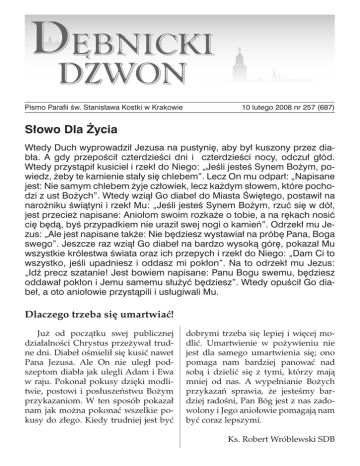 Pismo Parafii św. Stanisława Kostki w Krakowie 10 lutego 2008 nr 257 (687) Słowo Dla Życia Wtedy Duch wyprowadził Jezusa na pustynię, aby był kuszony przez diabła. A gdy przepościł czterdzieści dni i czterdzieści nocy, odczuł głód. Wtedy przystąpił kusiciel i rzekł do Niego: „Jeśli jesteś Synem Bożym, powiedz, żeby te kamienie stały się chlebem”. Lecz On mu odparł: „Napisane jest: Nie samym chlebem żyje człowiek, lecz każdym słowem, które pochodzi z ust Bożych”. Wtedy wziął Go diabeł do Miasta Świętego, postawił na narożniku świątyni i rzekł Mu: „Jeśli jesteś Synem Bożym, rzuć się w dół, jest przecież napisane: Aniołom swoim rozkaże o tobie, a na rękach nosić cię będą, byś przypadkiem nie uraził swej nogi o kamień”. Odrzekł mu Jezus: „Ale jest napisane także: Nie będziesz wystawiał na próbę Pana, Boga swego”. Jeszcze raz wziął Go diabeł na bardzo wysoką górę, pokazał Mu wszystkie królestwa świata oraz ich przepych i rzekł do Niego: „Dam Ci to wszystko, jeśli upadniesz i oddasz mi pokłon”. Na to odrzekł mu Jezus: „Idź precz szatanie! Jest bowiem napisane: Panu Bogu swemu, będziesz oddawał pokłon i Jemu samemu służyć będziesz”. Wtedy opuścił Go diabeł, a oto aniołowie przystąpili i usługiwali Mu. Dlaczego trzeba się umartwiać! Już od początku swej publicznej działalności Chrystus przeżywał trudne dni. Diabeł ośmielił się kusić nawet Pana Jezusa. Ale On nie uległ podszeptom diabła jak ulegli Adam i Ewa w raju. Pokonał pokusy dzięki modlitwie, postowi i posłuszeństwu Bożym przykazaniom. W ten sposób pokazał nam jak można pokonać wszelkie pokusy do złego. Kiedy trudniej jest być dobrymi trzeba się lepiej i więcej modlić. Umartwienie w pożywieniu nie jest dla samego umartwienia się; ono pomaga nam bardziej panować nad sobą i dzielić się z tymi, którzy mają mniej od nas. A wypełnianie Bożych przykazań sprawia, że jesteśmy bardziej radośni, Pan Bóg jest z nas zadowolony i Jego aniołowie pomagają nam być coraz lepszymi. Ks. Robert Wróblewski SDB SŁOWO PASTERSKIE METROPOLITY KRAKOWSKIEGO NA WIELKI POST 2008 ROKU Drodzy Bracia i Siostry! Zwracam się do Was na progu Wielkiego Postu. Moje słowo jest skierowane do wszystkich należących do wspólnoty Kościoła krakowskiego. Chociaż w tak wielkiej wspólnocie reprezentujemy różne oczekiwania, różny stopień wrażliwości i uczestnictwa w życiu Kościoła, to jednak zwracam się do wszystkich, również do stojących z dala, bo przecież łączy nas jedna wiara. Moje dzisiejsze słowo pasterskie składa się z siedmiu punktów, stanowiących fundament naszego chrześcijańskiego życia i powołania. Każdy z tych punktów domaga się od nas osobistej odpowiedzi. 1. Nasze źródła są w Bogu. Jak mówi obrazowo Księga Rodzaju, Bóg „ulepił człowieka z prochu ziemi i tchnął w jego nozdrza tchnienie życia” (Rdz 2,7). Co więcej, stworzył On człowieka na swój obraz. Obdarzył go wolnością i uczynił zdolnym do miłości. Bóg umieścił człowieka na szczycie stworzenia i oddał mu do dyspozycji ziemię, by czynił ja sobie poddaną. Wszystko, co mamy i kim jesteśmy, zawdzięczamy Bogu. W nim są nasze źródła. Od Niego wyszliśmy i do Niego zmierzamy. Prawda o tym powinna w sposób decydujący kształtować naszą świadomość. Dlatego rodzą się pierwsze pytania: czy Bóg rzeczywiście zajmuje centralne miej- 2 sce w moim życiu? Czy odwołuję się do Boga w moich codziennych wyborach i decyzjach? Czy każdego dnia znajduję czas na modlitwę – synowską rozmowę z Ojcem, który jest w niebie? 2. Dramat wolności. Nasi prarodzice nie zdali egzaminu z daru wolności. Wbrew zakazowi Bożemu spożyli owoce z drzewa poznania dobra i zła, choć zostali ostrzeżeni, że przez to sprowadzą na siebie śmierć. Chcieli dorównać Bogu. Ulegli tej pokusie. Pokusa dorównania Bogu lub uniezależnienia się od Niego towarzyszy dziejom człowieka na ziemi. Jakże często człowiek zapomina, że miara jego godności i wielkości jest fakt, że jest stworzeniem i dzieckiem Bożym. Odrywając się od swych źródeł, skazuje się na wewnętrzne rozdarcie, na nicość i bezsens. Dlatego trzeba postawić pytania: czy zdaję sobie sprawę, że w każdym z nas toczy się duchowa walka pomiędzy dobrem a złem, między wiernością Bogu i pokusą chodzenia błędnymi drogami, między miłością i wieloma odmianami egoizmu? Czy ta prawda przypomina mi o obowiązku czuwania, opanowania złych skłonności i o potrzebie uczciwego rachunku sumienia prowadzącego do nawrócenia? 3. Ocalenie człowieka. Dzieje człowieka na ziemi to nie tylko dzieje niewierności i grzechu. Są to również i przede wszystkim dzieje zbawienia. Sam Bóg postanowił ocalić człowieka. Uczynił to w sposób niewyobrażalny. Syn Boży stał się człowiekiem. W swojej osobie połączył niebo z ziemią. Utożsamił się nie tylko z godnością i wielkością człowieka, ale również z jego słabościami, lękami, zranieniami i śmiercią. Mocą swego zmartwychwstania odmienił radykalnie nasz los, otwierając przed nami bramy prawdziwego, wiecznego życia. Oto najważniejsze przesłanie Ewangelii. Oto fundament naszych wszystkich nadziei. Wiążą się z tym pytania: Czy przyznaję się do Jezusa Chrystusa? Czy mogę powiedzieć, że jestem Jego uczniem, chociaż słabym i nieudolnym? Czy moje życie świadczy o przynależności do Niego? 4. Nasza odpowiedź. Boża inicjatywa zbawienia człowieka domaga się naszej odpowiedzi. Na czym polega ta odpowiedź? Przede wszystkim na tym, byśmy spojrzeli na siebie w całej prawdzie. Zapytajmy jeszcze raz: jakie miejsce zajmuje Bóg w moim życiu, w moich planach zamierzeniach? Co mnie od Niego oddala? Co w moim życiu wymaga uporządkowania? Tu musimy dotknąć spraw bardzo konkretnych, dotyczących naszego życia osobistego, małżeńskiego, rodzinnego czy t