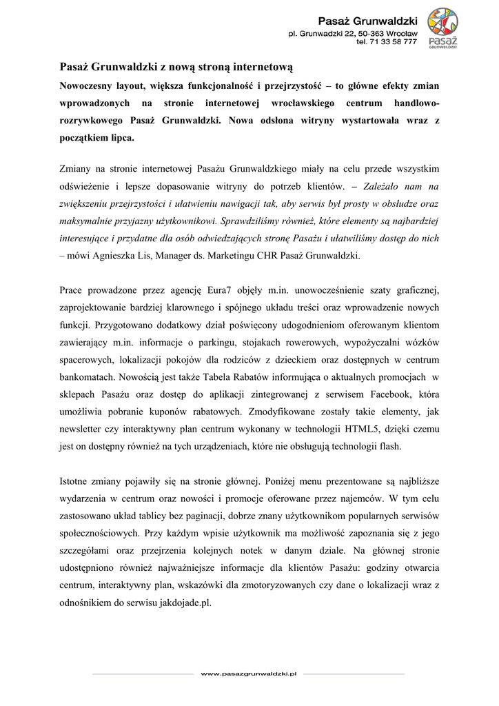 Pasaż Grunwaldzki z nową stroną internetową Nowoczesny layout, większa funkcjonalność i przejrzystość – to główne efekty zmian wprowadzonych na stronie internetowej wrocławskiego centrum handlowo- rozrywkowego Pasaż Grunwaldzki. Nowa odsłona witryny wystartowała wraz z początkiem lipca. Zmiany na stronie internetowej Pasażu Grunwaldzkiego miały na celu przede wszystkim odświeżenie i lepsze dopasowanie witryny do potrzeb klientów. – Zależało nam na zwiększeniu przejrzystości i ułatwieniu nawigacji tak, aby serwis był prosty w obsłudze oraz maksymalnie przyjazny użytkownikowi. Sprawdziliśmy również, które elementy są najbardziej interesujące i przydatne dla osób odwiedzających stronę Pasażu i ułatwiliśmy dostęp do nich – mówi Agnieszka Lis, Manager ds. Marketingu CHR Pasaż Grunwaldzki. Prace prowadzone przez agencję Eura7 objęły m.in. unowocześnienie szaty graficznej, zaprojektowanie bardziej klarownego i spójnego układu treści oraz wprowadzenie nowych funkcji. Przygotowano dodatkowy dział poświęcony udogodnieniom oferowanym klientom zawierający m.in. informacje o parkingu, stojakach rowerowych, wypożyczalni wózków spacerowych, lokalizacji pokojów dla rodziców z dzieckiem oraz dostępnych w centrum bankomatach. Nowością jest także Tabela Rabatów informująca o aktualnych promocjach w sklepach Pasażu oraz dostęp do aplikacji zintegrowanej z serwisem Facebook, która umożliwia pobranie kuponów rabatowych. Zmodyfikowane zostały takie elementy, jak newsletter czy interaktywny plan centrum wykonany w technologii HTML5, dzięki czemu jest on dostępny również na tych urządzeniach, które nie obsługują technologii flash. Istotne zmiany pojawiły się na stronie głównej. Poniżej menu prezentowane są najbliższe wydarzenia w centrum oraz nowości i promocje oferowane przez najemców. W tym celu zastosowano układ tablicy bez paginacji, dobrze znany użytkownikom popularnych serwisów społecznościowych. Przy każdym wpisie użytkownik ma możliwość zapoznania się z jego szczegółami oraz przejrzenia kolejnych notek w danym dziale. Na głównej stronie udostępniono również najważniejsze informacje dla klientów Pasażu: godziny otwarcia centrum, interaktywny plan, wskazówki dla zmotoryzowanych czy dane o lokalizacji wraz z odnośnikiem do serwisu jakdojade.pl. Nowoczesne rozwiązania technologiczne zastosowano też przy wprowadzaniu zmian na stronie przeznaczonej dla użytkowników korzystających z urządzeń mobilnych. – Dla serwisu osobno stworzona została nowa wersja mobilna, jest on więc zoptymalizowany pod kątem użyteczności na małych ekranach. Zawiera podstawowe, wyselekcjonowane informacje, najbardziej przydatne osobie, która wchodzi na stronę z urządzenia mobilnego. Dzięki temu jest lekka i ładuje się znacznie szybciej niż pełna strona – zapewnia Łukasz Wołek z agencji Eura 7. Nowa wersja strony dostępna jest dla użytkowników od początku lipca. Efekty prac można zobaczyć pod adresem: www.pasazgrunwaldzki.pl Pasaż Grunwaldzki – to najwyżej oceniane w niezależnych rankingach wrocławskie centrum rozrywkowo-handlowe. Powstał w 2007 roku. Na 130 000 mkw. powierzchni miejsce znalazło blisko 200 sklepów, punktów usługowych i restauracji oraz 11-salowe Multikino i supermarket. Kontakt dla mediów: Kamila Paliwoda Agencja Royal Brand PR tel.: (71) 723 72 70 [email protected]