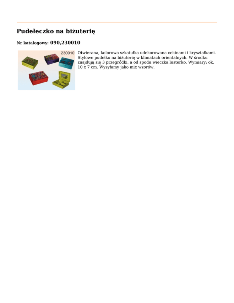 Pudełeczko na biżuterię Nr katalogowy: 090,230010 Otwierana, kolorowa szkatułka udekorowana cekinami i kryształkami. Stylowe pudełko na biżuterię w klimatach orientalnych. W środku znajdują się 3 przegródki, a od spodu wieczka lusterko. Wymiary: ok. 10 x 7 cm. Wysyłamy jako mix wzorów.
