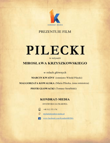 PREZENTUJE FILM w reżyserii MIROSŁAWA KRZYSZKOWSKIEGO w rolach głównych MARCIN KWAŚNY (rotmistrz Witold Pilecki) MAŁGORZATA KOWALSKA (Maria Pilecka, żona rotmistrza) PIOTR GŁOWACKI (Tomasz Serafiński) KONDRAT-MEDIA DYSTRYBUCJA FILMOWA +48 512 375 176 [email protected] www.facebook.com/KondratMEDIA Film ,,Pilecki” to polski fabularyzowany dokument w reżyserii Mirosława Krzyszkowskiego przedstawiający historię rotmistrza Witolda Pileckiego od czasów jego młodości, poprzez działania w czasie II wojny światowej, aż do uwięzienia i śmierci w maju 1948 roku. Producentem filmu jest Stowarzyszenie Auschwitz Memento. Środki pozyskano w ramach zbiórki publicznej dzięki akcji "Projekt: Pilecki". Twórcy i producenci filmu oparli się na społecznej aktywności, czyli na czymś, co było bliskie Witoldowi Pileckiemu i co okazało się bliskie również jego rodzinie. Dzięki temu udawało się pokonywać kolejne trudności mnożone przez instytucje i środowiska, które choćby z racji swoich statutowych zadań powinny pomagać, a tego nie czyniły. Od 2009 roku Stowarzyszenie regularnie poszukiwało pieniędzy na film o Pileckim – słało prośby, składało wnioski, brało udział w konkursach grantowych. Mimo, że w międzyczasie zrealizowało siedem dokumentalnych filmów historycznych, które były emitowane w telewizji publicznej oraz telewizjach komercyjnych, to jednak na film o jednym z największych polskich bohaterów nie mogło znaleźć środków ani w agendach Ministerstwa Kultury i Dziedzictwa Narodowego, ani w Ministerstwie Obrony Narodowej, ani w urzędach marszałkowskich. Film „Pilecki” udało się jednak zrealizować dzięki ponad dwóm tysiącom indywidualnych darczyńców i wsparciu Stowarzyszenia Weteranów Armii Polskiej z Nowego Jorku. W produkcję filmu, którą rozpoczęto w 2014 roku, zaangażowało się czynnie ponad 300 osób różnych profesji i zainteresowań, zafascynowanych postacią Witolda Pileckiego, liczne grupy rekonstrukcyjne oraz kilka instytucji: Muzeum Tatrzańskie w Zakopanem, Krakowska Szkoła Filmowa, Państwowa Wyższa Szkoła Teatralna w Krakowie, Aeroklub Polski, Muzeum Koryznówka w Nowym Wiśniczu. Bezpośrednio przy realizacji filmu pomagała także rodzina rotmistrza począwszy od syna Andrzeja na prawnukach skończywszy. Dzięki tym wszystkim ludziom i instytucjom możemy 67 lat po śmierci Witolda Pileckiego, wyjątkowego człowieka i bohatera, opowiedzieć Państwu jego historię... (1901 – 1948) to jedna z bardziej fascynujących postaci w najnowszej historii Polski. Swoje życie poświęcił walce ze zbrodniczymi dyktaturami XX wieku - niemieckim narodowym socjalizmem i sowieckim komunizmem. Brytyjski historyk prof. Michael Foot zaliczył go do sześciu najodważniejszych ludzi ruchu oporu II wojny światowej. Losy Pileckiego dobitnie świadczą o jedności planów niemieckich i sowieckich okupantów w stosunku do elity polskiego społeczeństwa. WITOLD PILECKI Witold Pilecki typowy przedstawiciel kresowej inteli gencji polskiej pochodzenia ziemiańskiego – urodził się 13 maja 1901 roku w ówczesnej północnej Rosji, gdzie jego ojciec był leśnikiem. Wychowany przez matkę w duchu żarliwego patriotyzmu, wykształcony w Wilnie, dokąd rodzina przeniosła się w 1910 roku, czynnie działa w zakazanym przez władze zaborcze harcerstwie, a następnie jako ochotnik bierze udział w wyzwoleniu i samoobronie Wilna na przełomie 1918 i 1919 roku. Walczy w obronie Grodna, a później w szeregach 211 Pułku Ułanów w bitwie warszawskiej latem 1920 roku. Dwukrotnie odznaczony Krzyżem Walecznych. W czasie pokoju zdaje maturę, rozpoczyna studia na Wydziale Sztuk Pięknych Uniwersytetu im. Stefana Batorego w Wilnie, ale przerywa je z powodu kłopotów materialnych. Osiada w podupadłym majątku Sukurcze w pobliżu Lidy, modernizuje go i rozwija. Zakłada kółko rolnicze i spółdzielnię mleczarską, udziela się w harcerstwie i ochotniczej straży pożarnej. Jako entuzjasta przysposobienia obronnego zakłada dwa szwadrony konne przysposobienia obronnego złożone z miejscowych ochotników. W 1931 roku żeni się z Marią Ostrowską, nauczycielką miejscowej szkoły. W Sukurczach rodzą się ich dzieci – Andrzej i Zofia. We wrześniu 1939 roku Pilecki bierze udział w wojnie obronnej przeciwko niemieckim agresorom. Po inwazji Sowietów na Polskę nie może wrócić w okolice Lidy. Przedziera się do Warszawy i włącza się od razu w nurt walki podziemnej. Jest jednym z organizatorów powołanej w listopadzie 1939 roku Tajnej Armii Polskiej, która później zostanie włączona w struktury Armii Krajowej. Latem 1940 roku Pilecki prosi swoich przełożonych o zgodę na realizację misji polegającej na przedostaniu się do obozu koncentracyjnego KL Auschwitz w celu założenia w nim organizacji konspiracyjnej. Po otrzymaniu zgody, pod fałszywym nazwiskiem, jako Tomasz Serafiński 19 września 1940 r. daje się pojmać Niemcom w łapance, a dwa dni później jako więzień nr 4859 trafia do Auschwitz. W obozie tworzy tajny Związek Organizacji Wojskowej, strukturę konspiracyjną, która ma pomagać w podtrzymywaniu morale więźniów, przekazywać informacje spoza obozu, wysyłać raporty o tym, co dzieje się w Auschwitz, przygotować plany powstania w obozie. Za pośrednictwem uciekinierów oraz przez zorganizowaną siatkę pracowników pralni Pilecki przesyła meldunki do swojego dowództwa. To dzięki niemu Zachód mógł dowiedzieć się o skali ludobójstwa dokonywanego w KL Auschwitz. 26 kwietnia 1943 roku wraz z Edwardem Ciesielskim i Janem Redzejem Witold Pilecki ucieka z obozu. Kilka miesięcy spędza w oddziale AK w okolicach Nowego Wiśnicza, gdzie pisze pierwszy obszerny Raport z KL Auschwitz. Przedostaje się do Warszawy, pracuje w Kedywie. Wiosną 1944 roku na rozkaz gen. Fieldorfa współorganizuje mocno zakonspirowaną „NIE”, strukturę, która ma działać na wypadek spodziewanej okupacji 