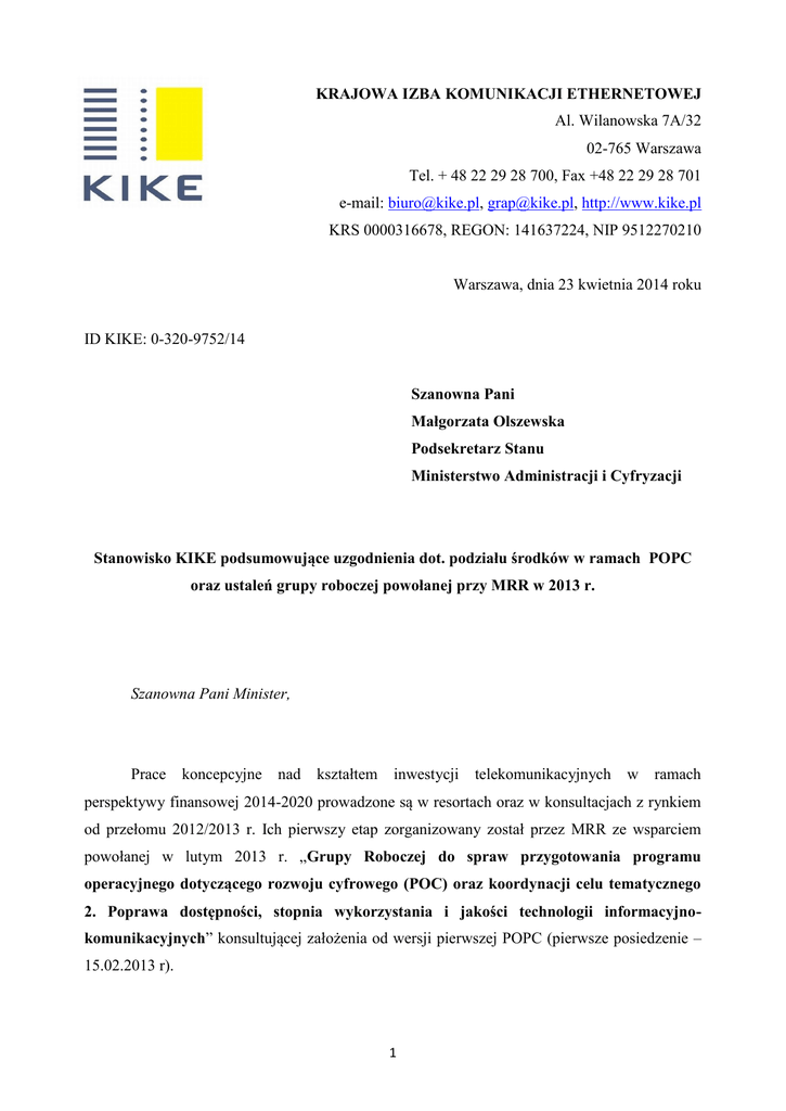 KRAJOWA IZBA KOMUNIKACJI ETHERNETOWEJ Al. Wilanowska 7A/32 02-765 Warszawa Tel. + 48 22 29 28 700, Fax +48 22 29 28 701 e-mail: [email protected], [email protected], http://www.kike.pl KRS 0000316678, REGON: 141637224, NIP 9512270210 Warszawa, dnia 23 kwietnia 2014 roku ID KIKE: 0-320-9752/14 Szanowna Pani Małgorzata Olszewska Podsekretarz Stanu Ministerstwo Administracji i Cyfryzacji Stanowisko KIKE podsumowujące uzgodnienia dot. podziału środków w ramach POPC oraz ustaleń grupy roboczej powołanej przy MRR w 2013 r. Szanowna Pani Minister, Prace koncepcyjne nad kształtem inwestycji telekomunikacyjnych w ramach perspektywy finansowej 2014-2020 prowadzone są w resortach oraz w konsultacjach z rynkiem od przełomu 2012/2013 r. Ich pierwszy etap zorganizowany został przez MRR ze wsparciem powołanej w lutym 2013 r. „Grupy Roboczej do spraw przygotowania programu operacyjnego dotyczącego rozwoju cyfrowego (POC) oraz koordynacji celu tematycznego 2. Poprawa dostępności, stopnia wykorzystania i jakości technologii informacyjnokomunikacyjnych” konsultującej założenia od wersji pierwszej POPC (pierwsze posiedzenie – 15.02.2013 r). 1 I. Prace nad POPC w MRR. Zgodnie z zaproszeniem przekazanym na początku lutego ub.r. przez MRR: „W dniu 15 stycznia br. Rada Ministrów przyjęła Założenia Umowy Partnerstwa wyznaczające kierunki interwencji ze środków Unii Europejskiej w kolejnej perspektywie finansowej, w tym liczbę i zakres programów operacyjnych przewidzianych do realizacji w latach 2014-2020. Jednym z nich jest krajowy program operacyjny dotyczący rozwoju cyfrowego, którego celem jest stworzenie warunków do powszechnego wykorzystania technologii cyfrowych w taki sposób, aby stały się one kołem zamachowym gospodarki. W celu zapewnienia spójności i koordynacji procesu programowania oraz partnerskiej współpracy pomiędzy szerokim gronem interesariuszy w przygotowaniu programów operacyjnych realizujących Umowę Partnerstwa 2014-2020, w dniu 4 lutego br. została podjęta uchwała Międzyresortowego Zespołu do spraw Programowania i Wdrażania Funduszy Strukturalnych i Funduszu Spójności Unii Europejskiej w sprawie powołania grup roboczych wspierających prace nad przygotowaniem ww. programów, w tym Grupy do spraw przygotowania programu operacyjnego dotyczącego rozwoju cyfrowego (POC) oraz koordynacji celu tematycznego 2. Poprawa dostępności, stopnia wykorzystania i jakości technologii informacyjno-komunikacyjnych. Do zadań Grupy będzie należał udział w pracach nad przygotowaniem projektu POC oraz zapewnienie koordynacji interwencji w ramach celu tematycznego 2, w tym m.in. wypracowanie propozycji jego celów i zakresu, z uwzględnieniem krajowych i europejskich dokumentów strategicznych; wypracowywanie, omawianie, analizowanie i konsultowanie rozwiązań w zakresie zagadnień horyzontalnych, finansowych, instytucjonalnych i innych oraz opiniowanie, analizowanie i omawianie wniosków płynących z dokumentów związanych z przeprowadzeniem ewaluacji ex-ante i oceną oddziaływania na środowisko POC.” W pracach prowadzony w MRR od początku uczestniczą przedstawiciele MAC, m.in. w pierwszym posiedzeniu udział wzięli: Pan Paweł Orłowski, Podsekretarz Stanu w Ministerstwie rozwoju Regionalnego, Pani Małgorzata Olszewska, Podsekretarz Stanu w Ministerstwie Administracji i Cyfryzacji 2 Grupa robocza przy MRR pracowała do jesieni 2013 r., gdy zawieszono czasowo jej prace w związku ze skierowaniem wypracowanej wersji POPC do Komisje Europejskiej. Jej ponowne zwołanie zaplanowane jest po zatwierdzenie Programu przez KE z założeniem prowadzenia dalszych prac nad regulacjami szczegółowymi, dla których zatwierdzona wersja POPC jest punktem wyjścia. Stanowisko to podtrzymuje MIR w konsultacjach z Izbami oraz ekspertami również w roku bieżącym. Zadania powołanego przy MRR Zespołu Roboczego opisane są ponadto w sekcji 7.2 POPC. Podsumowując – wedle informacji MIR – resort oczekuje z dalszymi pracami Zespołu/Grupy Roboczej na finalną wersję Programu zatwierdzoną przez Komisję. Wróćmy jednak do poczynionych dotąd ustaleń. Prace w MRR prowadzone zarówno w podzespołach roboczych poświęconych poszczególnym osiom, jak i na posiedzeniach wspólnych przygotowały i przedyskutowały szereg uwag oraz postulatów do POPC również w zakresie „Osi priorytetowej I. Powszechny dostęp do szybkiego Internetu”. Zbiorczym efektem prac były arkusze konsultacyjne zawierające: treść zgłaszanych uwag, stanowisko MRR i uzasadnienie. W toku prac przyjęto szereg założeń dot. nowej perspektywy finansowej – z których część znalazła się w treści POPC, część zaś przyjęta została do uwzględnienia w aktach niższego rzędu. MRR wyjaśnił, iż powodem takiego stanu rzeczy są: względy celowościowe związane z zapewnieniem POPC elastyczności przez cały 7-letni okres realizacji Programu; ograniczenia techniczne dot. ilości znaków, jakie może zawierać opis poszczególnych sekcji Programu. W związku z powyższym por. wyżej arkusz konsultacyjny przyjął status „uwzględnienia uwagi” również do punktów nie ujętych wprost w treści POPC. Postanowienia te mają jednak charakter uzgodniony w toku prac z rynkiem, a najważniejsze z nich dla osi pierwszej KIKE por. w swoich stanowiskach z dn. 25.07 i 30.10.2013 r. (kopie w załączeniu). Należą do nich: Lp Część PO Treść uwagi 42 2.1 I oś Powszechny dostęp do szybkiego internetu Zakończenia sieci. Ilość podpisanych umów jest wskaźnikiem rezultatu dla obecnego POIG 8.4 i per analogiam może być wskaźnikiem w POC 2.1. Beneficjenci nie mają wpływu na proces akwizycji umów z abonentami. Wskazanym jest dopuszczenie jako wskaźnika ilości HP – czyli zakończeń sieci 3 Stanowisk o MRR Uwaga uwzględnio na Uzasadnienie Na chwilę obecną nie przewidujemy mierzenia liczby faktycznych abonentów, ale 43 2.1 I oś Powszechny dostęp do szybki