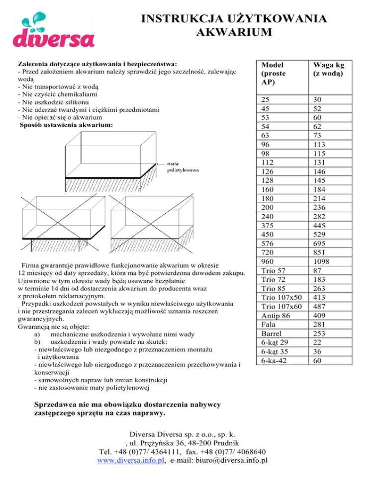 INSTRUKCJA UŻYTKOWANIA AKWARIUM Zalecenia dotyczące użytkowania i bezpieczeństwa: - Przed założeniem akwarium należy sprawdzić jego szczelność, zalewając wodą - Nie transportować z wodą - Nie czyścić chemikaliami - Nie uszkodzić silikonu - Nie uderzać twardymi i ciężkimi przedmiotami - Nie opierać się o akwarium Sposób ustawienia akwarium: Firma gwarantuje prawidłowe funkcjonowanie akwarium w okresie 12 miesięcy od daty sprzedaży, która ma być potwierdzona dowodem zakupu. Ujawnione w tym okresie wady będą usuwane bezpłatnie w terminie 14 dni od dostarczenia akwarium do producenta wraz z protokołem reklamacyjnym. Przypadki uszkodzeń powstałych w wyniku niewłaściwego użytkowania i nie przestrzegania zaleceń wykluczają możliwość uznania roszczeń gwarancyjnych. Gwarancją nie są objęte: a) mechaniczne uszkodzenia i wywołane nimi wady b) uszkodzenia i wady powstałe na skutek: - niewłaściwego lub niezgodnego z przeznaczeniem montażu i użytkowania - niewłaściwego lub niezgodnego z przeznaczeniem przechowywania i konserwacji - samowolnych napraw lub zmian konstrukcji - nie zastosowanie maty polietylenowej Model (proste AP) Waga kg (z wodą) 25 45 53 54 63 96 98 112 126 128 160 180 200 240 375 450 576 720 960 Trio 57 Trio 72 Trio 85 Trio 107x50 Trio 107x60 Antip 86 Fala Barrel 6-kąt 29 6-kąt 35 6-ka-42 30 52 60 62 73 113 115 131 146 145 184 214 236 282 445 529 695 851 1098 87 183 263 413 487 409 281 253 22 36 60 Sprzedawca nie ma obowiązku dostarczenia nabywcy zastępczego sprzętu na czas naprawy. Diversa Diversa sp. z o.o., sp. k. , ul. Prężyńska 36, 48-200 Prudnik Tel. +48 (0)77/ 4364111, fax. +48 (0)77/ 4068640 www.diversa.info.pl, e-mail: [email protected]