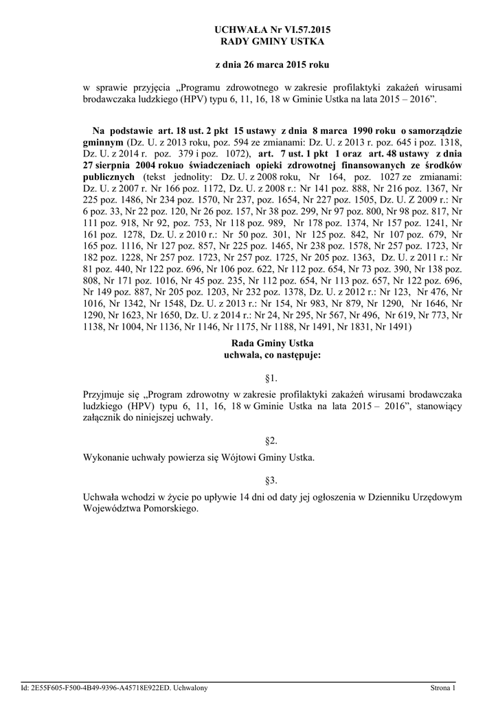 UCHWAŁA Nr VI.57.2015 RADY GMINY USTKA z dnia 26 marca 2015 roku w sprawie przyjęcia „Programu zdrowotnego w zakresie profilaktyki zakażeń wirusami brodawczaka ludzkiego (HPV) typu 6, 11, 16, 18 w Gminie Ustka na lata 2015 – 2016”. Na podstawie art. 18 ust. 2 pkt 15 ustawy z dnia 8 marca 1990 roku o samorządzie gminnym (Dz. U. z 2013 roku, poz. 594 ze zmianami: Dz. U. z 2013 r. poz. 645 i poz. 1318, Dz. U. z 2014 r. poz. 379 i poz. 1072), art. 7 ust. 1 pkt 1 oraz art. 48 ustawy z dnia 27 sierpnia 2004 rokuo świadczeniach opieki zdrowotnej finansowanych ze środków publicznych (tekst jednolity: Dz. U. z 2008 roku, Nr 164, poz. 1027 ze zmianami: Dz. U. z 2007 r. Nr 166 poz. 1172, Dz. U. z 2008 r.: Nr 141 poz. 888, Nr 216 poz. 1367, Nr 225 poz. 1486, Nr 234 poz. 1570, Nr 237, poz. 1654, Nr 227 poz. 1505, Dz. U. Z 2009 r.: Nr 6 poz. 33, Nr 22 poz. 120, Nr 26 poz. 157, Nr 38 poz. 299, Nr 97 poz. 800, Nr 98 poz. 817, Nr 111 poz. 918, Nr 92, poz. 753, Nr 118 poz. 989, Nr 178 poz. 1374, Nr 157 poz. 1241, Nr 161 poz. 1278, Dz. U. z 2010 r.: Nr 50 poz. 301, Nr 125 poz. 842, Nr 107 poz. 679, Nr 165 poz. 1116, Nr 127 poz. 857, Nr 225 poz. 1465, Nr 238 poz. 1578, Nr 257 poz. 1723, Nr 182 poz. 1228, Nr 257 poz. 1723, Nr 257 poz. 1725, Nr 205 poz. 1363, Dz. U. z 2011 r.: Nr 81 poz. 440, Nr 122 poz. 696, Nr 106 poz. 622, Nr 112 poz. 654, Nr 73 poz. 390, Nr 138 poz. 808, Nr 171 poz. 1016, Nr 45 poz. 235, Nr 112 poz. 654, Nr 113 poz. 657, Nr 122 poz. 696, Nr 149 poz. 887, Nr 205 poz. 1203, Nr 232 poz. 1378, Dz. U. z 2012 r.: Nr 123, Nr 476, Nr 1016, Nr 1342, Nr 1548, Dz. U. z 2013 r.: Nr 154, Nr 983, Nr 879, Nr 1290, Nr 1646, Nr 1290, Nr 1623, Nr 1650, Dz. U. z 2014 r.: Nr 24, Nr 295, Nr 567, Nr 496, Nr 619, Nr 773, Nr 1138, Nr 1004, Nr 1136, Nr 1146, Nr 1175, Nr 1188, Nr 1491, Nr 1831, Nr 1491) Rada Gminy Ustka uchwala, co następuje: §1. Przyjmuje się „Program zdrowotny w zakresie profilaktyki zakażeń wirusami brodawczaka ludzkiego (HPV) typu 6, 11, 16, 18 w Gminie Ustka na lata 2015 – 2016”, stanowiący załącznik do niniejszej uchwały. §2. Wykonanie uchwały powierza się Wójtowi Gminy Ustka. §3. Uchwała wchodzi w życie po upływie 14 dni od daty jej ogłoszenia w Dzienniku Urzędowym Województwa Pomorskiego. Id: 2E55F605-F500-4B49-9396-A45718E922ED. Uchwalony Strona 1 Załącznik nr 1 do Uchwały nr VI.57.2015 Rady Gminy Ustka z dnia 26 marca 2015 roku „Program zdrowotny w zakresie profilaktyki zakażeń wirusami brodawczaka ludzkiego (HPV) typu 6, 11,16,18 w Gminie Ustka na lata 2015-2016” I. Wstęp Zaspokajanie zbiorowych potrzeb wspólnoty samorządowej w zakresie ochrony zdrowia jest jednym z najważniejszych zadań własnych gminy wymienionych w art.7 ustawy z dnia 8 marca 1990 roku o samorządzie gminnym (tekst jednolity: Dz. U. z 2013 poz. 594 ze zm.). Do zadań własnych gminy w zakresie zapewnienia równego dostępu do świadczeń opieki zdrowotnej należy w szczególności opracowywanie i realizacja oraz ocena efektów programów zdrowotnych wynikających z rozpoznanych potrzeb zdrowotnych i stanu zdrowia mieszkańców, co wynika z art.7 ust.1 i art.48 ustawy z dnia 27 sierpnia 2004r. O świadczeniach opieki zdrowotnej finansowanych ze środków publicznych (Tekst jednolity: Dz. U. z 2008 Nr 164, poz.1027 ze. zm.). Zapobieganie chorobom cywilizacyjnym możliwe jest poprzez stosowanie odpowiedniej profilaktyki, jak również poprzez podejmowanie wszelkich działań i środków w celu przeciwdziałania czynnikom ryzyka wywołującym wiele chorób w tym nowotworów. II. Opis problemu zdrowotnego Problem, stanowiący motyw i podstawę do przygotowania i realizacji niniejszego programu, to zwiększająca się liczba zachorowań na raka szyjki macicy (wykrytego w stadium uniemożliwiającym skuteczne leczenie), w konsekwencji powodująca wysoką śmiertelność. Mimo, że rak szyjki macicy jest nowotworem, któremu można skutecznie zapobiec, jest jednym z najczęściej występujących u polskich kobiet. Główną przyczyną tego zjawiska jest niska efektywność działań profilaktycznych w tym zakresie. Aktywna profilaktyka, mająca na celu identyfikację pierwszych oznak, sugerujących początek choroby jest skuteczną metodą ochrony. Obecny system profilaktyki funkcjonujący w kraju jest nieefektywny, co wynika z braku zintegrowanego systemu profilaktyki, ograniczeń finansowych instytucji odpowiedzialnych za profilaktykę, niskiego zainteresowania społecznego programami profilaktycznym i braku informacji o zagrożeniu. Problem jest szczególnie dotkliwy na terenie małych miast, obszarów wiejskich. 1. Epidemiologia Rak szyjki macicy jest drugim co do częstości występowania nowotworem u kobiet do 45 roku życia na świecie. Globalnie, co roku odnotowuje się około 530.000 nowych zachorowań, z czego około 275 000 kobiet umiera. Najmłodsze pacjentki ze zdiagnozowanym nowotworem trafiają do szpitali już w wieku 25 lat. Liczba zachorowań w Polsce jest niezmienna od ponad 25 lat i według statystyk, każdego roku zapada na ten typ raka prawie 3200 kobiet, z czego umiera co roku ok. 1800 – to 5 Polek każdego dnia (wg Rekomendacji Polskiej Koalicji na Rzecz Walki z Rakiem Szyjki Macicy, Warszawa 2012r.). Główną przyczyną zachorowania na raka szyjki macicy jest zakażenie wirusem brodawczaka ludzkiego (HPV). Jest to wirus z rodziny Papilloma wirusów. Istnieje ponad 100 typów wirusa, z których część może być przyczyną łagodnych zmian, a część nowotworów złośliwych. Przyjmuje się, że nawet około 50% populacji ludzkiej w ciągu swojego życia przechodzi zakażenie HPV. Wirus jest przenoszony przede wszystkim drogą płciową, tak więc na zakażenie nim narażone są głównie osoby aktywne seksualnie. Niemniej jednak, w niektórych przypadkach może dojść np. do zakażenia dziecka przez matkę podczas porodu. U wielu osób HPV nie ujawnia się, a dzięki działaniu układu immunologicznego zakażenie ustępuje samoistnie. W prz