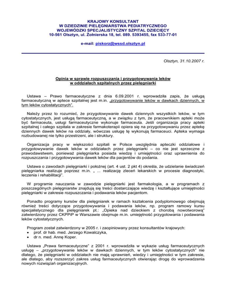 KRAJOWY KONSULTANT W DZIEDZINIE PIELĘGNIARSTWA PEDIATRYCZNEGO WOJEWÓDZKI SPECJALISTYCZNY SZPITAL DZIECIĘCY 10-561 Olsztyn, ul. Żołnierska 18, tel. 089. 5393455, fax 533-77-01 e-mail: [email protected] Olsztyn, 31.10.2007 r. Opinia w sprawie rozpuszczania i przygotowywania leków w oddziałach szpitalnych przez pielęgniarki Ustawa – Prawo farmaceutyczne z dnia 6.09.2001 r. wprowadziła zapis, że usługą farmaceutyczną w aptece szpitalnej jest m.in. „przygotowywanie leków w dawkach dziennych, w tym leków cytostatycznych”. Należy przez to rozumieć, że przygotowywanie dawek dziennych wszystkich leków, w tym cytostatycznych, jest usługą farmaceutyczną, a w związku z tym, że pracownikiem apteki może być farmaceuta, usługi farmaceutyczne wykonuje farmaceuta. Jeśli organizacja pracy apteki szpitalnej i całego szpitala w zakresie farmakoterapii opiera się na przygotowywaniu przez aptekę dziennych dawek leków na oddziały, wówczas usługę tę wykonują farmaceuci. Apteka wymaga rozbudowanej nie tylko przestrzeni, ale i struktury. Organizacja pracy w większości szpitali w Polsce uwzględnia apteczki oddziałowe i przygotowywanie dawek leków w oddziałach przez pielęgniarki – co nie jest sprzeczne z prawodawstwem, ponieważ pielęgniarka posiada wiedzę i umiejętności oraz uprawnienia do rozpuszczania i przygotowywania dawek leków dla pacjentów do podania. Ustawa o zawodach pielęgniarki i położnej (art. 4 ust. 2 pkt 4) określa, że udzielanie świadczeń pielęgniarka realizuje poprzez m.in. „ ... realizację zleceń lekarskich w procesie diagnostyki, leczenia i rehabilitacji”. W programie nauczania w zawodzie pielęgniarki jest farmakologia, a w programach z poszczególnych pielęgniarstw znajdują się treści dostarczające wiedzę i kształtujące umiejętności pielęgniarki w zakresie rozpuszczania i podawania leków pacjentom. Ponadto programy kursów dla pielęgniarek w ramach kształcenia podyplomowego obejmują również treści dotyczące przygotowywania i podawania leków, np. program ramowy kursu specjalistycznego dla pielęgniarek pt.: „Opieka nad dzieckiem z chorobą nowotworową” zatwierdzony przez CKPPiP w Warszawie obejmuje m.in. umiejętność przygotowania i podawania leków cytostatycznych. Program został zatwierdzony w 2005 r. i zaopiniowany przez konsultantów krajowych: • prof. dr hab. med. Jerzego Kowalczyka, • dr n. med. Annę Koper. Ustawa „Prawa farmaceutyczne” z 2001 r. wprowadziła w wykazie usług farmaceutycznych usługę – „przygotowywanie leków w dawkach dziennych, w tym leków cytostatycznych” nie dlatego, że pielęgniarki w oddziałach nie mają uprawnień, wiedzy i umiejętności w tym zakresie, ale dlatego, aby rozszerzyć zakres usług farmaceutycznych otwierając drogę do wprowadzenia nowych rozwiązań organizacyjnych. Podsumowując: Właściwe prawnie są oba rozwiązania: 1. Rozpuszczanie i przygotowywanie dziennych dawek leków ( w tym cytostatycznych) w aptece przez osobę uprawnioną. 2. Rozpuszczanie i przygotowywanie dziennych dawek leków w oddziale przez pielęgniarkę. Niewłaściwym byłoby, gdyby pielęgniarka była zatrudniona w aptece szpitalnej i przygotowywała dzienne dawki leków. W aptece mogą pracować tylko osoby uprawnione. Poza apteką czyli np. w oddziale szpitalnym, pielęgniarka może rozpuszczać i przygotowywać dawki leków. W odniesieniu do leków cytostatycznych, powinny być spełnione odpowiednie warunki w pracowni zgodnie z Rozporządzeniem Ministra Zdrowia z 19.04.1996 r., ze zmianą 31.08.2000 r.