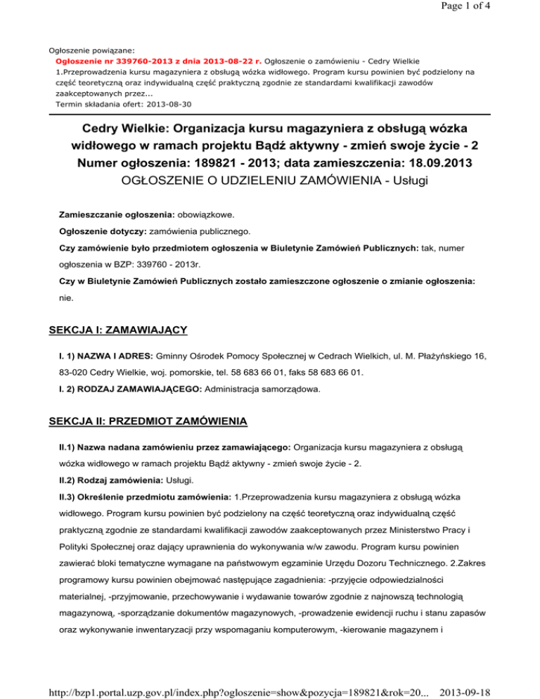 Page 1 of 4 Ogłoszenie powiązane: Ogłoszenie nr 339760-2013 z dnia 2013-08-22 r. Ogłoszenie o zamówieniu - Cedry Wielkie 1.Przeprowadzenia kursu magazyniera z obsługą wózka widłowego. Program kursu powinien być podzielony na część teoretyczną oraz indywidualną część praktyczną zgodnie ze standardami kwalifikacji zawodów zaakceptowanych przez... Termin składania ofert: 2013-08-30 Cedry Wielkie: Organizacja kursu magazyniera z obsługą wózka widłowego w ramach projektu Bądź aktywny - zmień swoje Ŝycie - 2 Numer ogłoszenia: 189821 - 2013; data zamieszczenia: 18.09.2013 OGŁOSZENIE O UDZIELENIU ZAMÓWIENIA - Usługi Zamieszczanie ogłoszenia: obowiązkowe. Ogłoszenie dotyczy: zamówienia publicznego. Czy zamówienie było przedmiotem ogłoszenia w Biuletynie Zamówień Publicznych: tak, numer ogłoszenia w BZP: 339760 - 2013r. Czy w Biuletynie Zamówień Publicznych zostało zamieszczone ogłoszenie o zmianie ogłoszenia: nie. SEKCJA I: ZAMAWIAJĄCY I. 1) NAZWA I ADRES: Gminny Ośrodek Pomocy Społecznej w Cedrach Wielkich, ul. M. PłaŜyńskiego 16, 83-020 Cedry Wielkie, woj. pomorskie, tel. 58 683 66 01, faks 58 683 66 01. I. 2) RODZAJ ZAMAWIAJĄCEGO: Administracja samorządowa. SEKCJA II: PRZEDMIOT ZAMÓWIENIA II.1) Nazwa nadana zamówieniu przez zamawiającego: Organizacja kursu magazyniera z obsługą wózka widłowego w ramach projektu Bądź aktywny - zmień swoje Ŝycie - 2. II.2) Rodzaj zamówienia: Usługi. II.3) Określenie przedmiotu zamówienia: 1.Przeprowadzenia kursu magazyniera z obsługą wózka widłowego. Program kursu powinien być podzielony na część teoretyczną oraz indywidualną część praktyczną zgodnie ze standardami kwalifikacji zawodów zaakceptowanych przez Ministerstwo Pracy i Polityki Społecznej oraz dający uprawnienia do wykonywania w/w zawodu. Program kursu powinien zawierać bloki tematyczne wymagane na państwowym egzaminie Urzędu Dozoru Technicznego. 2.Zakres programowy kursu powinien obejmować następujące zagadnienia: -przyjęcie odpowiedzialności materialnej, -przyjmowanie, przechowywanie i wydawanie towarów zgodnie z najnowszą technologią magazynową, -sporządzanie dokumentów magazynowych, -prowadzenie ewidencji ruchu i stanu zapasów oraz wykonywanie inwentaryzacji przy wspomaganiu komputerowym, -kierowanie magazynem i http://bzp1.portal.uzp.gov.pl/index.php?ogloszenie=show&pozycja=189821&rok=20... 2013-09-18 Page 2 of 4 personelem magazynowym zgodnie z obowiązującymi normami i przepisami, -sporządzanie dokumentów kasowych, prowadzenie ewidencji ruchu i stanu zapasu oraz wykonywanie inwentaryzacji, -obsługa komputerowych programów uŜytkowych w magazynie, -obsługa wózków widłowych (typy stosowanych wózków, budowa wózków, czynności operatora przy obsłudze wózka widłowego [przed podjęciem pracy, w czasie pracy i po zakończeniu pracy], wiadomości z zakresu ładunkoznawstwa, BHP w zawodzie, wiadomości o dozorze technicznym, praktyczna nauka jazdy i manewrowania osprzętem.). 3.Szkolenie musi być zakończone egzaminem wewnętrznym (część pisemna + część praktyczna). Po pozytywnie zdanym egzaminie wewnętrznym Wykonawca zgłasza uczestnika kursu do Państwowej Komisji Egzaminacyjnej celem przystąpienia do egzaminu państwowego, którego zaliczenie będzie uprawniało do kierowania i operowania wózkiem widłowym. Koszt tego egzaminu pokrywa Wykonawca i powinien go wliczyć w cenę oferty. 4.Szkolenie powinno zakończyć się przeprowadzeniem egzaminu sprawdzającego oraz wydaniem stosownego: -zaświadczenia o ukończeniu szkolenia na podstawie §18 ust. 2 rozporządzenia MEN z dnia 11 stycznia 2012r. w sprawie kształcenia ustawicznego w formach pozaszkolnych (Dz.U. poz. 186 z późn. zm.) -zaświadczenia kwalifikacyjnego z Urzędu Dozoru Technicznego o którym mowa w rozporządzeniu Ministra Gospodarki z dnia 18 lipca 2001r. w sprawie trybu sprawdzania kwalifikacji wymaganych przy obsłudze i konserwacji urządzeń technicznych (Dz.U. z 2001r. Nr 79, poz. 849 ze zmianami). 5.Wykonawca w pierwszym dniu, przed rozpoczęciem kursu jest zobowiązany zapoznać uczestników z jego szczegółowym programem oraz przekazać im harmonogram realizowanych zajęć 6.Wykonawca pokrywa wszelkie koszty związane z przeprowadzeniem kursu. 7.W przypadku konieczności posiadania przez uczestników badań lekarskich, przed rozpoczęciem kursu Wykonawca zobowiązany jest do ich skierowania na badania lekarskie przed rozpoczęciem kursu oraz do sfinansowania tych badań i zobowiązany jest do przekazania Zamawiającemu informacji o wynikach badań niezwłocznie po ich otrzymaniu. 8.W przypadku braku wskazań do uczestniczenia w przedmiotowym szkoleniu wynikającego z przeprowadzonych badań lekarskich Wykonawca otrzyma tylko wynagrodzenie za wykonane badania lekarskie. 9.Wykonawca jest zobowiązany do przeprowadzenia wśród uczestników kursu oceny merytorycznej przebiegu kursu-ewaluacji na podstawie przeprowadzonych ankiet na początku i na zakończenie kursu. Wyniki oceny merytorycznej przebiegu kursu-ewaluacji Wykonawca przekaŜe w formie pisemnej Zamawiającemu po zakończeniu kursu. 10.Wykonawca dostarcza Zamawiającemu dokumentację fotograficzną z prowadznego kursu, po uzyskaniu pisemnej zgody uczestników kursu. 11.Miejsce szkolenia: W miejscu wskazanym przez Wykonawcę. Wykonawca zobowiązany jest zapewnić realizację zajęć zgodnie z przepisami BHP, w pomieszczeniach odpowiednio dostosowanych do prowadzenia zajęć szkoleniowych, z zapewnionym zapleczem, posiadających odpowiednie warunki sanitarne, bezpieczeństwa i higieny pracy, których powierzchnia, ilość stanowisk oraz wyposaŜenie w sprzęt i pomoce dydaktyczne dostosowana jest do zakresu szkolenia oraz liczby uczestników szkolenia. WYKŁADY - sala dydaktyczna przystosowana do liczby uczestników, w której kaŜdy kursant będzie mieć zapewnione miejsce siedzące (stolik/ławka bądź krzesło z przystawką) umoŜliwiające swo
