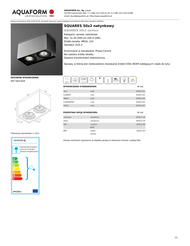 AQUAFORM Inc. Sp. z o.o 32-070 Czernichów 465, T: (+48) (12) 270-21-22, F:(+48) (12) 270-23-88 email: [email protected], http://www.aquaform.pl Ostatnia aktualizacja 2016-10-06 09:26. Szczegóły dotyczące oprawy dostępne pod adresem http://www.aquaform.pl/45912 SQUARES 50x2 natynkowy SQUARES 50x2 surface Kategoria: oprawy natynkowe Moc: 2x 20-35W (2x LED 4-10W) Źródło światła: MR16, 12V Oprawka: GU5.3 Ściemnianie w standardzie: Phase-Control Nie zawiera źródła światła. Zawiera transformator elektroniczny. Oprawa, w której jest niedozwolone stosowanie źródeł COOL BEAM (oddających ciepło do tyłu). DOSTĘPNE WYKOŃCZENIA: MAT W&B B&W 1 WYKOŃCZENIA STANDARDOWE: Nr kat. ALU mat 45912-01 CZARNY mat 45912-02 BIAŁY mat 45912-03 CZERWONY mat 45912-05 ECRU mat 45912-07 POZOSTAŁE OPCJE WYKOŃCZEŃ: Nr kat. antracyt struktura 45912-18 złoty struktura 45912-19 BW czarno- 45912-62 45912-63 biały BW Tolerancja wymariowa ± 1mm białoczarny Istnieje możliwość wykonania za dopłatą oprawy w dowolnym kolorze z palety RAL. 1/1