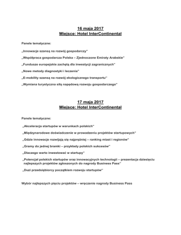 16 maja 2017 Miejsce: Hotel InterContinental Panele tematyczne: „Innowacje szansą na rozwój gospodarczy” „Współpraca gospodarcza Polska – Zjednoczone Emiraty Arabskie” „Fundusze europejskie zachętą dla inwestycji zagranicznych” „Nowe metody diagnostyki i leczenia” „E-mobility szansą na rozwój ekologicznego transportu” „Wymiana turystyczna siłą napędową rozwoju gospodarczego” 17 maja 2017 Miejsce: Hotel InterContinental Panele tematyczne: „Akceleracja startupów w warunkach polskich” „Międzynarodowe doświadczenie w prowadzeniu projektów startupowych” „Gdzie innowacje rozwijają się najprężniej – ranking miast i regionów” „Gramy do jednej bramki – przykłady polskich sukcesów” „Dlaczego warto inwestować w startupy” „Potencjał polskich startupów oraz innowacyjnych technologii – prezentacja dziesięciu najlepszych projektów zgłoszonych do nagrody Business Pass” „Duzi przedsiębiorcy początkiem rozwoju startupów” Wybór najlepszych pięciu projektów – wręczenie nagrody Business Pass