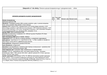 Załącznik nr 1 do oferty: Dostawa sprzętu komputerowego i oprogramowania – oferta minimalne wymagania na sprzęt i oprogramowanie Zestaw komputerowy deklaracja zgodności CE Obudowa: 2 działające gniazda USB w panelu przednim u góry i z przodu komputera, kolor czarny (możliwe małe dodatki w innym kolorze) zasilacz 400W, aktywny PFC, zabezpieczenia UVP (Undervoltage protection) / OVP (Overvoltage protection) / SCP (Short-circuit protection) / OPP (Overload protection) / OCP (Overcurrent protection) / OTP (Over Temperature Protection) / AFC (Automatic Fanspeed Control),sprawność 85% przy obciążeniu 50%, wentylator 12 cm pamięć RAM DDR3 dwukanałowa 4GB procesor dwurdzeniowy o wydajności min. 4300 pkt wg testu PassMark CPU Mark (www.cpubenchmark.net) dysk wewnętrzny HDD SATA II 320GB, 7200rpm nagrywarka DVD +/-R,+RW DL w kolorze obudowy i z programem nagrywającym płyta główna: 1slot PCI-E 2.0 1x, 1slot PCI-E 2.0 16x, 1 x PS2, 4xUSB 2.0, 2xUSB 3.0, dual-chanel, 4 porty SATA II; gigabitowa karta sieciowa karta graficzna: zintegrowana, gniazda DVI/D-Sub ilość Cena jedn. [szt.] Netto Wartość netto Wartość brutto 2 karta dźwiękowa: zintegrowana klawiatura czarna/grafit/szary; wydzielony blok klawiszy numerycznych, wydzielony blok klawiszy kursorów; wbudowane gniazdo USB mysz optyczna usb: 3 przyciski, rolka, rozdzielczość co najmniej 800dpi monitor: LCD 22”, podświetlenie LED, czas reakcji matrycy do 5ms, nominalna rozdzielczość 1680 x 1050, jasność 250 cd/m2, głośniki, gniazdo DVI, D-Sub, spełniane normy TCO 6.0; kolor czarny system operacyjny: MS Windows 10 Pro PL OEM lub równoważny (system operacyjny w jęz. polskim, musi umożliwiać podłączenie komputera do usług katalogowych Active Directory oraz uruchamianie programów Besti@, SJOBesti@, programów firmy Vulcan sp. z o.o.(Sigma, Płace, Finanse) oraz programów GIS firmy Geobid sp. z o.o.) Strona 1 z 2 Nazwa Urządzenie wielofunkcyjne laserowe A4 + kabel USB + zapasowy toner o maksymalnej pojemności zalecany przez producenta urządzenia Funkcje: drukowanie, skanowanie, kopiowanie, faksowanie Drukowanie: Szybkość drukowania w A4 28 str./min Rozdzielczość drukowania: 600 x 600 dpi, 1200 x 600 dpi Cykl roboczy: 20 000 wydruków miesięcznie Drukowanie dwustronne: Automatyczne Żródlo zasilania: 220 - 240 V, 50/60 Hz Skanowanie: Rozdzielczość skanowania 300 dpi Sterowniki standardowe: Sieciowy TWAIN Skanuj do: E-mail, Folder, FTP Kopiowanie: Kopiowanie wielokrotne: Do 99 kopii Rozdzielczość: 600 x 600 dpi Zoom: Od 25% do 400% co 1% Obsługiwany papier: Zalecany rozmiar papieru: A4, A5, A6, B5, B6 Pojemność wejściowa papieru: Maksymalnie: 300 arkuszy 1 Pojemność wyjściowa papieru: Maksymalnie: 125/125/50/50 arkuszy Gramatura papieru: Standardowa/e kaseta/y na papier: 52 - 162 g/m2 Taca ręczna: 52 - 162 g/m² Dupleks: 60 - 105 g/m² Pozostałe cechy: Język drukarki: PCL5e, PCL6 Interfejs: USB 2.0, Karta sieciowa 10 base-T/100 base-TX Protokół sieciowy: TCP/IP, IPP Sterownik zgodny z systemem operacyjnym zestawu komputerowego. RAZEM WYKONAWCA: Strona 2 z 2