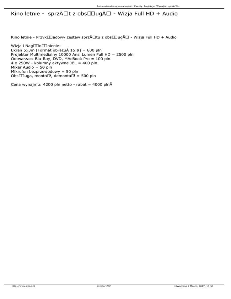 Audio wizualna oprawa imprez. Eventy. Projekcje. Wynajem sprzÄ™tu Kino letnie - sprzÄ™t z obsÅ‚ugÄ… - Wizja Full HD + Audio Kino letnie - PrzykÅ‚adowy zestaw sprzÄ™tu z obsÅ‚ugÄ… - Wizja Full HD + Audio Wizja i NagÅ‚oÅ›nienie: Ekran 5x3m (Format obrazu 16:9) = 600 pln Projektor Multimedialny 10000 Ansi Lumen Full HD = 2500 pln Odtwarzacz Blu-Ray, DVD, MAcBook Pro = 100 pln 4 x 250W - kolumny aktywne JBL = 400 pln Mixer Audio = 50 pln Mikrofon bezprzewodowy = 50 pln ObsÅ‚uga, montaÅź, demontaÅź = 500 pln Cena wynajmu: 4200 pln netto - rabat = 4000 pln http://www.ation.pl Kreator PDF Utworzono 2 March, 2017, 10:59