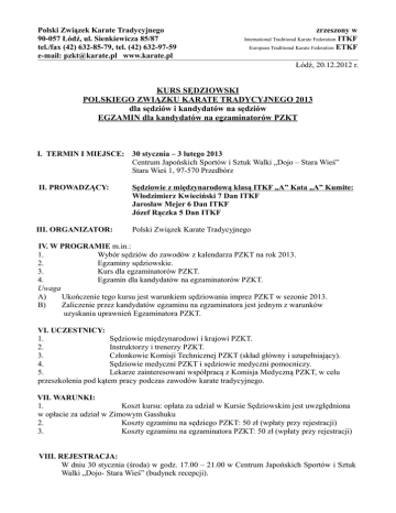 Polski Związek Karate Tradycyjnego 90-057 Łódź, ul. Sienkiewicza 85/87 tel./fax (42) 632-85-79, tel. (42) 632-97-59 e-mail: [email protected] www.karate.pl zrzeszony w ITKF European Traditional Karate Federation ETKF International Traditional Karate Federation Łódź, 20.12.2012 r. KURS SĘDZIOWSKI POLSKIEGO ZWIĄZKU KARATE TRADYCYJNEGO 2013 dla sędziów i kandydatów na sędziów EGZAMIN dla kandydatów na egzaminatorów PZKT I. TERMIN I MIEJSCE: 30 stycznia – 3 lutego 2013 Centrum Japońskich Sportów i Sztuk Walki „Dojo – Stara Wieś” Stara Wieś 1, 97-570 Przedbórz II. PROWADZĄCY: III. ORGANIZATOR: Sędziowie z międzynarodową klasą ITKF „A” Kata „A” Kumite: Włodzimierz Kwieciński 7 Dan ITKF Jarosław Mejer 6 Dan ITKF Józef Rączka 5 Dan ITKF Polski Związek Karate Tradycyjnego IV. W PROGRAMIE m.in.: 1. Wybór sędziów do zawodów z kalendarza PZKT na rok 2013. 2. Egzaminy sędziowskie. 3. Kurs dla egzaminatorów PZKT. 4. Egzamin dla kandydatów na egzaminatorów PZKT. Uwaga A) Ukończenie tego kursu jest warunkiem sędziowania imprez PZKT w sezonie 2013. B) Zaliczenie przez kandydatów egzaminu na egzaminatora jest jednym z warunków uzyskania uprawnień Egzaminatora PZKT. VI. UCZESTNICY: 1. Sędziowie międzynarodowi i krajowi PZKT. 2. Instruktorzy i trenerzy PZKT. 3. Członkowie Komisji Technicznej PZKT (skład główny i uzupełniający). 4. Sędziowie medyczni PZKT i sędziowie medyczni pomocniczy. 5. Lekarze zainteresowani współpracą z Komisja Medyczną PZKT, w celu przeszkolenia pod kątem pracy podczas zawodów karate tradycyjnego. VII. WARUNKI: 1. Koszt kursu: opłata za udział w Kursie Sędziowskim jest uwzględniona w opłacie za udział w Zimowym Gasshuku 2. Koszty egzaminu na sędziego PZKT: 50 zł (wpłaty przy rejestracji) 3. Koszty egzaminu na egzaminatora PZKT: 50 zł (wpłaty przy rejestracji) VIII. REJESTRACJA: W dniu 30 stycznia (środa) w godz. 17.00 – 21.00 w Centrum Japońskich Sportów i Sztuk Walki „Dojo- Stara Wieś” (budynek recepcji). IX. NALEŻY ZABRAĆ m.in.: 1. Karate-gi 2. Gwizdek 3. Notatnik i długopis 4. Przepisy sędziowskie ITKF 5. Klapki 6. Rękawiczki (ITKF Kumite Gloves) 7. Hakama X. INFORMACJA DLA KOMISJI MEDYCZNEJ: Należy zabezpieczyć kurs w sprzęt medyczny w takim zakresie, jak na zawody. XI. WARUNKI UZYSKANIA UPRAWNIEŃ: 1. Wszystkie informacje dotyczące warunków uzyskania uprawnień egzaminatora dostępne są na stronie www.karate.pl: aktualności – komunikaty. A. Instruktor PKZT – aktualna licencja (Uchwała w sprawie punktacji dotyczącej utrzymania licencji instruktora PZKT) B. Egzaminator PZKT (Regulamin przeprowadzania egzaminów na stopnie szkoleniowe PZKT) Uwaga! Uchwałą Zarządu z dnia 06.12.2009 r. został zmieniony wymagany wiek dla egzaminatora PZKT – ukończone 21 lat. 2. Sędzia PZKT. A. Sędzią jest instruktor PZKT z ważną licencją, po zdaniu egzaminu na sędziego. B. Uprawnienia do sędziowania: 1. Sędzia z klasą C – zawody klubowe 2. Sędzia z klasą B – zawody klubowe, okręgowe 3. Sędzia z klasą A – zawody klubowe, okręgowe, krajowe Włodzimierz Kwieciński Prezes