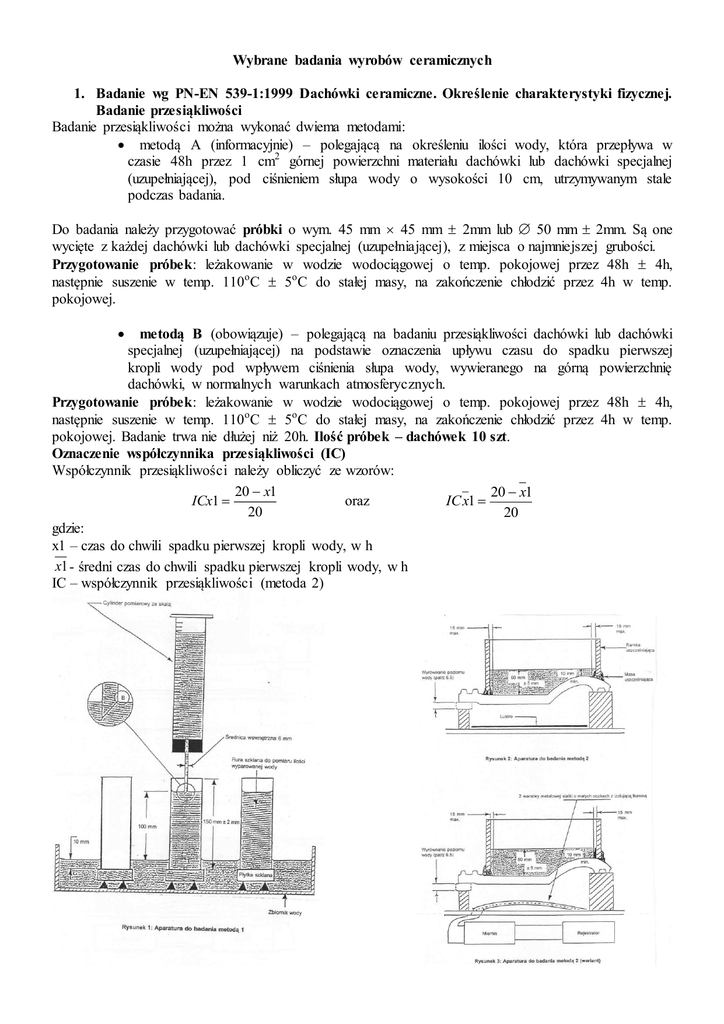 Wybrane badania wyrobów ceramicznych 1. Badanie wg PN-EN 539-1:1999 Dachówki ceramiczne. Określenie charakterystyki fizycznej. Badanie przesiąkliwości Badanie przesiąkliwości można wykonać dwiema metodami: metodą A (informacyjnie) – polegającą na określeniu ilości wody, która przepływa w czasie 48h przez 1 cm2 górnej powierzchni materiału dachówki lub dachówki specjalnej (uzupełniającej), pod ciśnieniem słupa wody o wysokości 10 cm, utrzymywanym stale podczas badania. Do badania należy przygotować próbki o wym. 45 mm 45 mm 2mm lub 50 mm 2mm. Są one wycięte z każdej dachówki lub dachówki specjalnej (uzupełniającej), z miejsca o najmniejszej grubości. Przygotowanie próbek: leżakowanie w wodzie wodociągowej o temp. pokojowej przez 48h 4h, następnie suszenie w temp. 110o C 5o C do stałej masy, na zakończenie chłodzić przez 4h w temp. pokojowej. metodą B (obowiązuje) – polegającą na badaniu przesiąkliwości dachówki lub dachówki specjalnej (uzupełniającej) na podstawie oznaczenia upływu czasu do spadku pierwszej kropli wody pod wpływem ciśnienia słupa wody, wywieranego na górną powierzchnię dachówki, w normalnych warunkach atmosferycznych. Przygotowanie próbek: leżakowanie w wodzie wodociągowej o temp. pokojowej przez 48h 4h, następnie suszenie w temp. 110o C 5o C do stałej masy, na zakończenie chłodzić przez 4h w temp. pokojowej. Badanie trwa nie dłużej niż 20h. Ilość próbek – dachówek 10 szt. Oznaczenie współczynnika przesiąkliwości (IC) Współczynnik przesiąkliwości należy obliczyć ze wzorów: 20 x1 20 x1 oraz ICx1 IC x1 20 20 gdzie: x1 – czas do chwili spadku pierwszej kropli wody, w h x1 - średni czas do chwili spadku pierwszej kropli wody, w h IC – współczynnik przesiąkliwości (metoda 2) Przebieg procesu badania przesiąkliwości dachówek ceramicznych karpiówek wg PN-EN 539-1:1999 - metoda B Fot. 1. Dachówki ceramiczne karpiówki w trakcie badania przesiąkliwości – w ramkach szczelnie umocowanych na min. 50% powierzchni licowej znajduje się woda o wysokości 605 mm (fot. T. Rucińska) Fot. 2. Dachówki ceramiczne karpiówki po badaniu przesiąkliwości – po 20 godzinach badania spodnia powierzchnia dachówek jest sucha (fot. T. Rucińska) Fot. 3. Dachówki ceramiczne karpiówki po badaniu przesiąkliwości – po 20 godzinach badania spodnia powierzchnia dachówek jest sucha (fot. T. Rucińska) 2. Badanie wg PN-EN 538:1999 Dachówki ceramiczne. Badanie nośności na zginanie Zasada badania - określenie nośności na zginanie wyrobu podpartego na dwóch prostych podporach, pod działaniem obciążenia przyłożonego centralnie. Ilość próbek – 10 szt. (całych dachówek w stanie powietrzno-suchym), jeżeli są zawilgocone należy je przed badaniem wysuszyć w warunkach laboratoryjnych w temp. 10 – 40o C i wilgotności względnej poniżej 90%. Szybkość obciążania 0,05 kN/s Przebieg procesu badania nośności na zginanie dachówek ceramicznych karpiówek wg PN-EN 538:1999. Fot. 4. Dachówki ceramiczne karpiówki w trakcie obciążania (fot. T. Rucińska) Fot. 5. Dachówki ceramiczne karpiówki po badaniu nośności na zginanie – moment zniszczenia (fot. T. Rucińska) Fot. 6. Dachówki ceramiczne karpiówki po badaniu nośności na zginanie – moment zniszczenia (fot. T. Rucińska)