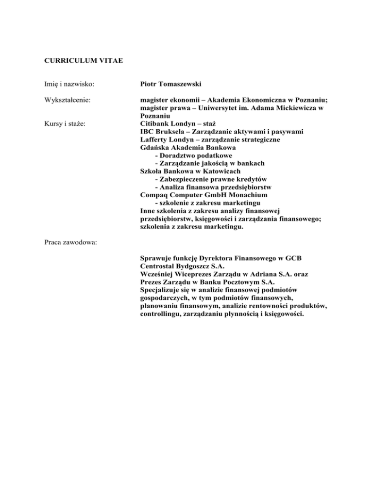 CURRICULUM VITAE Imię i nazwisko: Piotr Tomaszewski Wykształcenie: magister ekonomii – Akademia Ekonomiczna w Poznaniu; magister prawa – Uniwersytet im. Adama Mickiewicza w Poznaniu Citibank Londyn – staż IBC Bruksela – Zarządzanie aktywami i pasywami Lafferty Londyn – zarządzanie strategiczne Gdańska Akademia Bankowa - Doradztwo podatkowe - Zarządzanie jakością w bankach Szkoła Bankowa w Katowicach - Zabezpieczenie prawne kredytów - Analiza finansowa przedsiębiorstw Compaq Computer GmbH Monachium - szkolenie z zakresu marketingu Inne szkolenia z zakresu analizy finansowej przedsiębiorstw, księgowości i zarządzania finansowego; szkolenia z zakresu marketingu. Kursy i staże: Praca zawodowa: Sprawuje funkcję Dyrektora Finansowego w GCB Centrostal Bydgoszcz S.A. Wcześniej Wiceprezes Zarządu w Adriana S.A. oraz Prezes Zarządu w Banku Pocztowym S.A. Specjalizuje się w analizie finansowej podmiotów gospodarczych, w tym podmiotów finansowych, planowaniu finansowym, analizie rentowności produktów, controllingu, zarządzaniu płynnością i księgowości.