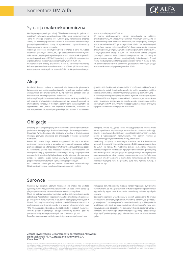 Komentarz DM Alfa Zarządzanie Aktywami Sytuacja makroekonomiczna Według wstępnego odczytu inflacji CPI w kwietniu nastąpiło głębsze od oczekiwań rynkowych spowolnienie cen dóbr i usług konsumpcyjnych (z -0,9% r/r miesiąc wcześniej do -1,1%r/r; przy konsensusie prognoz -1%r/r). Za silniejszy spadek wskaźnika CPI można winić obniżenie taryf gazowych przez URE oraz niższy, niż wynikałoby to z dynamiki cen ropy Brent na rynkach, wzrost cen paliw. Produkcja sprzedana przemysłu wzrosła w marcu o 0,5% r/r, wobec oczekiwań rynkowych rzędu 3,9%, a po odsezonowaniu wzrost wyniósł tylko 0,8% r/r, czyli najwolniej od sierpnia 2014 r. Silny spadek aktywności nastąpił w górnictwie (-16,3% r/r) i produkcji energii (-6,1% r/r), natomiast w przetwórstwie zaobserwowano rachityczny wzrost (1,8% r/r). Rozczarowaniem okazały się również dane nt. sprzedaży detalicznej, która w ujęciu realnym wzrosła w marcu o 3,0% r/r (6,2% r/r w lutym) wobec prognoz rynkowych na poziomie 5,8% r/r. W ujęciu nominalnym wzrost sprzedaży wyniósł 0,8% r/r. W marcu zaobserwowano wzrost zatrudnienia w sektorze przedsiębiorstw 2,7% r/r (powyżej oczekiwań rynkowych rzędu 2,5%), co w ujęciu miesięcznym oznaczało dodanie 15,5 tys. miejsc pracy. Poza tym wzrost zatrudnienia o 100 tys. w całym I kwartale b.r. był najsilniejszy od 5 lat a (sam marzec najlepszy od 2007 r.). Dane pokazują, że popyt na pracę nie słabnie, a wręcz uległ wzmocnieniu w pierwszym kwartale 2016 r. Wynagrodzenia urosły o 3,3% r/r, nieznacznie poniżej prognoz rynkowych (3,4% r/r) oraz odczytu lutowego (3,9% r/r) , co należy w głównej mierze łączy z efektem mniejszej liczby dni roboczych. Z kolei realny fundusz płac w sektorze przedsiębiorstw wzrósł w marcu o 7,0% r/r. Solidne tempo wzrostu dochodów gospodarstw domowych sprzyja wzrostowi konsumpcji prywatnej w całym 2016 r. Akcje Po dwóch bardzo udanych miesiącach dla inwestorów giełdowych, kwiecień stał pod znakiem realizacji zysków i wyraźnego spadku indeksu warszawskich blue-chip’ów (WIG20 -5,1%), który nie poradził sobie ze sforsowaniem lokalnego oporu na poziomie 2000 pkt. Jednym z głównych hamulcowych okazał się sektor bankowy, nad którym cały czas stoi groźba niekorzystnej propozycji tzw. ustawy frankowej. Na chwile obecną temat żyje w mediach a politycy partii rządzącej chętnie się wypowiadają nań, jednak bez większych konkretów, natomiast do czerwca powinien się pojawić prezydencki projekt ustawy. W konsekwen- cji indeks WIG Banki stracił w kwietniu 8%. W odróżnieniu od kursów akcji największych spółek lepiej zachowywały się indeks grupujące spółki o średniej (mWIG40 bez zmian m/m) i małej kapitalizacji (sWIG80 +1,2%). W minionym miesiącu rozpoczął się sezon wyników finansowych spółek za I kwartał 2016 r. Poprzeczka oczekiwań powieszona jest stosunkowo nisko i inwestorzy spodziewają się spadku wyniku operacyjnego spółek notowanych na GPW o ok. 10% r/r, do czego w głównej mierze przyczynią się spółki surowcowe i energetyczne oraz banki. Obligacje Światowy rynek długu skupiony był w kwietniu na dwóch wydarzeniach – posiedzeniu Europejskiego Banku Centralnego i Federalnego Komitetu Otwartego Rynku. Ponieważ oba spotkania wypadały w drugiej połowie miesiąca, pierwsze kilkanaście dni przebiegało w bardzo spokojnych nastrojach. Prezes EBC, Mario Draghi, wskazał na gotowość do użycia wszelkich dostępnych instrumentów w wypadku konieczności luzowania polityki pieniężnej (co jest już „standardowym” stwierdzeniem), jednak zaprzeczył na konferencji jakoby Rada Prezesów rozważała wprowadzenia tzw. helicopter money tj. wprowadzania darmowych dotacji dla gospodarstw domowych. Rynek nie mógł być zaskoczony taką retoryką, gdyż darmowe dotacje to obecnie raczej wymysł analityków prześcigających się w proponowaniu alternatywnych stymulantów gospodarczych. Bez zaskoczeń zakończyło się również posiedzenie amerykańskiego FOMC, gdzie utrzymane zostały podstawowe parametry polityki pieniężnej. Prezes FED, Janet Yellen, nie zasygnalizowała również kiedy można spodziewać się kolejnego wzrostu kosztu pieniądza wskazując jedynie, że pod uwagę będzie brany „szeroki zakres informacji” – co było spójne z wcześniejszymi komunikatami. Tym samym również w amerykańskiej polityce monetarnej mamy „status quo”. Polski dług, podążając za światowymi trendami, tracił w kwietniu na wartości. Rentowność 10-cio latków wzrosła z 2,80% na początku miesiąca do 3,05% na końcu. Na relatywnie słabsze zachowanie krajowych papierów względem niemieckich wpłynęło dyskontowanie potencjalnej obniżki ratingu (bądź perspektyw) przez agencję Moodys. Wpisuje się to w obserwowaną już od wielu miesięcy rosnącą premię za ryzyko (mierzoną spreadem między polskimi a niemieckimi rentownościami 10 letnich papierów dłużnych), która na początku 2015 roku wynosiła 1,9 p.p. a obecnie 2,8 p.p.. Surowce Kwiecień był kolejnym udanym miesiącem dla metali. Na wartości zyskiwały przede wszystkim metale szlachetne jak złoto, srebro pallad czy platyna, pozostawiając nieznacznie w tyle metale przemysłowe. Miedź po słabszym początku kwietnia z każdym kolejnym dniem radziła sobie lepiej. Po raz kolejny wsparciem okazał się chiński import czerwonego kruszywa. W marcu wyniósł 570 tys. ton co jest najlepszym odczytem w historii. Od początku roku Chiny kupiły już prawie 30% więcej miedzi niż w analogicznym okresie zeszłego roku a w samym tylko marcu było to aż 40%. Mocno zaczęła również spadać ilość miedzi w składach magazynowych na giełdzie w Szanghaju – co sygnalizowaliśmy ostatnio – gdzie na początku miesiąca zmagazynowanych było prawie 400 tys. ton. Ropa Brent odnotowała najsilniejszy miesięczny wzrost od ponad roku, zyskując aż 20%. Od początku miesiąca wzrosty napędzane były głównie o