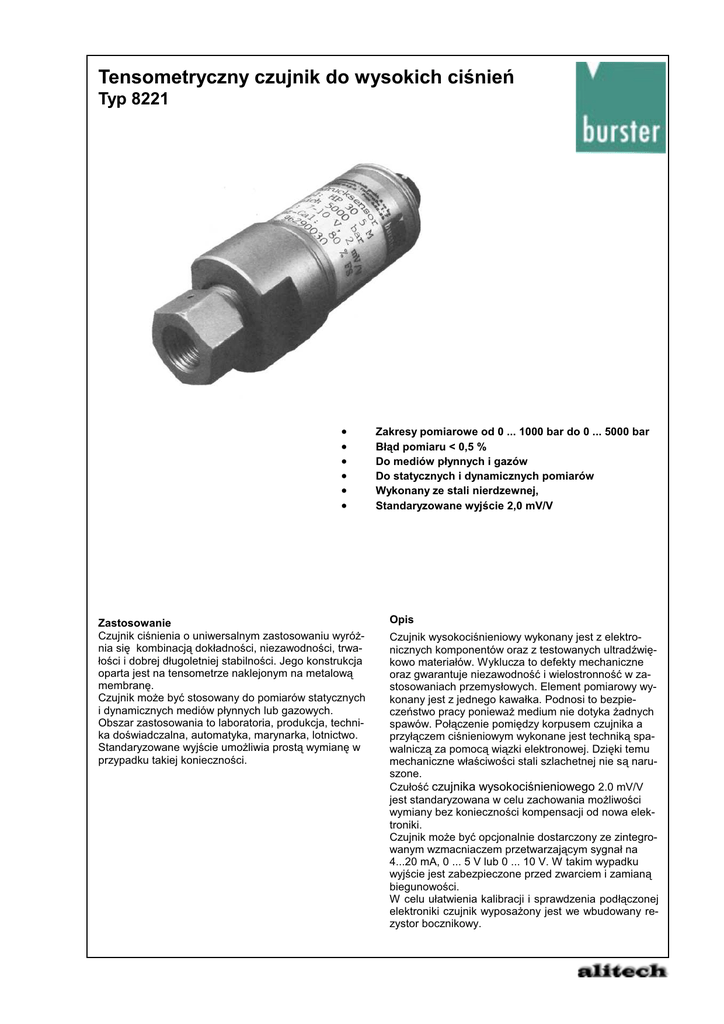 Tensometryczny czujnik do wysokich cinie Typ 822 • • • • • • Zastosowanie Czujnik cinienia o uniwersalnym zastosowaniu wyrónia si kombinacj dokadnoci, niezawodnoci, trwaoci i dobrej dugoletniej stabilnoci. Jego konstrukcja oparta jest na tensometrze naklejonym na metalow membran. Czujnik moe by stosowany do pomiarów statycznych i dynamicznych mediów pynnych lub gazowych. Obszar zastosowania to laboratoria, produkcja, technika dowiadczalna, automatyka, marynarka, lotnictwo. Standaryzowane wyjcie umoliwia prost wymian w przypadku takiej koniecznoci. Zakresy pomiarowe od 0 ... 000 bar do 0 ... 5000 bar Bd pomiaru < 0,5 % Do mediów pynnych i gazów Do statycznych i dynamicznych pomiarów Wykonany ze stali nierdzewnej, Standaryzowane wyjcie 2,0 mV/V Opis Czujnik wysokocinieniowy wykonany jest z elektronicznych komponentów oraz z testowanych ultradwikowo materiaów. Wyklucza to defekty mechaniczne oraz gwarantuje niezawodno i wielostronno w zastosowaniach przemysowych. Element pomiarowy wykonany jest z jednego kawaka. Podnosi to bezpieczestwo pracy poniewa medium nie dotyka adnych spawów. Poczenie pomidzy korpusem czujnika a przyczem cinieniowym wykonane jest technik spawalnicz za pomoc wizki elektronowej. Dziki temu mechaniczne waciwoci stali szlachetnej nie s naruszone. Czuo czujnika wysokocinieniowego 2.0 mV/V jest standaryzowana w celu zachowania moliwoci wymiany bez koniecznoci kompensacji od nowa elektroniki. Czujnik moe by opcjonalnie dostarczony ze zintegrowanym wzmacniaczem przetwarzajcym sygna na 4...20 mA, 0 ... 5 V lub 0 ... 0 V. W takim wypadku wyjcie jest zabezpieczone przed zwarciem i zamian biegunowoci. W celu uatwienia kalibracji i sprawdzenia podczonej elektroniki czujnik wyposaony jest we wbudowany rezystor bocznikowy. Dane techniczne Oznaczenie Zakres 822 -600 0 ... 000 bar 822 -6002 0 ... 2000 bar 822 -6003 0 ... 3500 bar 822 -6005 0 ... 5000 bar Wartoci elektryczne Rezystancja mostka: nominalnie 350 Rezystor kalibracyjny: wbudowany w czujniku (aktywowanie przez zmostkowanie styków E i F we wtyczce; wywoane przez zmostkowanie napicie podane jest w protokole kalibracji i wynosi 80 % zakresu ± %) Napicie zasilania: 0 V = lub ~ Warto znamionowa: standardowo; 2,0 mV/V± % Warunki rodowiskowe Uytkowy zakres temperatur: - 30 °C ... 20 °C Znamionowy zakres temperatur: 0 °C ... 00 °C Wpyw temperatury na sygna zerowy: ± 0,02 % zakresu/K. Wpyw temperatury na warto znamionow: ± 0,02 % wartoci/K. Wartoci mechaniczne Bd pomiaru: < 0,5 % zakresu Rodzaj pomiaru: wzgldem atmosfery Zakres pomiarowy: patrz tabela Przestrze bierna: 74 mm³ Przecienie: 00 % zakresu Cinienie niszczce: 300 % zakresu, max 5 kbar Czstotliwo rezonansowa: 2 kHz Obcialno dynamiczna: zalecane 70 % cinienia znamionowego moliwe 00 % cinienia znamionowego Materia: element pomiarowy nierdzewna stal 7-4PH obudowa AISI 304 Podczenie cinienia: gwint wewntrzny 9/ 6 - 8 UNF Montaowy moment obrotowy: max. 00Nm Uszczelnienie: metalowe poprzez stoek uszczelniajcy Podczenie elektryczne: 6-nókowe gniazdo VPT07RA 0-6PT2 Klasa ochrony: wg DIN 40050 IP 65 Podczenie kocówek kabli (Standard): A +wyjcie B -wyjcie C +zasilanie D -zasilanie E+F rezystor bocznikowy Wymiary: patrz rysunek Masa: ca. 420 g ... 650 g Klasa ochrony: wg DIN 40050 IP 65 Wtyczka: typ 9900-V545 Souriau 85 -06E-C- 0-6S (w dostawie) Wymiary: patrz rysunek Masa: ca.350 g Dane techniczne zespolonego wzmacniacza Napicie zasilania: 5 ... 30 VDC Pobór prdu: max. 33 mA Zakres ustawie wzmocnienia: ±5% Zakres ustawie punktu zerowego: ±5% Uytkowy zakres temperatur: - 30 °C ... 85 °C Znamionowy zakres temperatur: 0 °C ... 70 °C Maksymalny czas reakcji dla 0 ... 90 % zakresu: 8 ms Podczenie kocówek kabli: Opcja V 03: A zasilanie i wyjcie (dodatni) B zasilanie i wyjcie (ujemny) Zasilanie i wyjcie: Opcja V 06 i V 07 jak standardzie, patrz powyej Wymiary Opcje V03 zespolony wzmacniacz z wyjciem prdowym 4 ... 20 m A, podczenie 2-przewodowe V06 zespolony wzmacniacz z wyjciem napiciowym 0 ... 5V V07 zespolony wzmacniacz z wyjciem napiciowym 0 ... 0V Czujniki ze zespolonym wzmacniaczem s dusze o 0 mm . Wyposaenie Kabel przyczeniowy z wtyczk do czujnika, promie gicia > 5 mm; izolacja PVC, ekranowany, dugo 3 m - do urzdzenia 9 62 w obudowie stoowej dla czujników bez wzmacniacza lub ze wzmacniaczem V 06 i V 0, z przeskalowaniem 994-545G-050030 - do wszystkich innych urzdze w obudowie laboratoryjnej dla czujników bez wzmacniacza 994-545H-060030 - do urzdzenia 9 62 w obudowie laboratoryjnej dla czujników ze wzmacniaczem V 03, z przeskalowaniem 994-545I-050030 - do urzdzenia 97 4 w obudowie laboratoryjnej dla czujników ze wzmacniaczem V 03 994-545K-050030 - do urzdzenia 9 80 w obudowie laboratoryjnej dla czujników ze wzmacniaczem V 03 994-545L-050030 - z lunymi, kodowanymi kolorami i ocynowanymi kocówkami 994-000G-060030 Rezystancja [Ω] 900 Wykres pokazuje optymaln zaleno midzy obcieniem i napiciem zasilajcym wzmacniacza opcja V 03 200 2 25 30 Napicie zasilania [V]