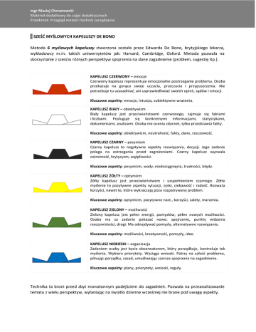 mgr Maciej Chrzanowski Materiał dodatkowy do zajęć dydaktycznych Przedmiot: Przegląd metod i technik zarządzania SZEŚĆ MYŚLOWYCH KAPELUSZY DE BONO Metoda 6 myślowych kapeluszy stworzona została przez Edwarda De Bono, brytyjskiego lekarza, wykładowcy m.in. takich uniwersytetów jak: Harvard, Cambridge, Oxford. Metoda pozwala na skorzystanie z sześciu różnych perspektyw spojrzenia na dane zagadnienie (problem, sugestię itp.). KAPELUSZ CZERWONY – emocje Czerwony kapelusz reprezentuje emocjonalne postrzeganie problemu. Osoba przekazuje na gorąco swoje uczucia, przeczucia i przypuszczenia. Nie potrzebuje tu uzasadniać, ani usprawiedliwiać swoich opinii, sądów i emocji. Kluczowe aspekty: emocje, intuicja, subiektywne wrażenia. KAPELUSZ BIAŁY – obiektywizm Biały kapelusz jest przeciwieństwem czerwonego, zajmuje się faktami i liczbami. Posługuje się konkretnymi informacjami, statystykami, dokumentami, analizami. Osoba nie ocenia zdarzeń, tylko przedstawia fakty. Kluczowe aspekty: obiektywizm, neutralność, fakty, dane, rzeczowość. KAPELUSZ CZARNY – pesymizm Czarny kapelusz to negatywne aspekty rozwiązania, decyzji. Jego zadanie polega na ostrzeganiu przed zagrożeniami. Czarny kapelusz wyzwala ostrożność, krytycyzm, wątpliwości. Kluczowe aspekty: pesymizm, wady, niedociągnięcia, trudności, błędy. KAPELUSZ ŻÓŁTY – optymizm Żółty kapelusz jest przeciwieństwem i uzupełnieniem czarnego. Żółte myślenie to pozytywne aspekty sytuacji, zyski, ciekawość i radość. Rozważa korzyści, nawet te, które wykraczają poza rozpatrywany problem. Kluczowe aspekty: optymizm, pozytywne nast., korzyści, zalety, marzenia. KAPELUSZ ZIELONY – możliwości Zielony kapelusz jest pełen energii, pomysłów, pełen nowych możliwości. Osoba ma za zadanie pokazać nowe: spojrzenie, punkty widzenia rzeczywistości, drogi. Ma odnajdywać pomysły, alternatywne rozwiązania. Kluczowe aspekty: możliwości, kreatywność, pomysły, idee. KAPELUSZ NIEBIESKI – organizacja Zadaniem osoby jest bycie obserwatorem, który porządkuje, kontroluje tok myślenia. Wybiera priorytety. Wyciąga wnioski. Patrzy na całość problemu, pilnując porządku, zasad, umożliwiając szersze spojrzenie na zagadnienie. Kluczowe aspekty: plany, priorytety, wnioski, reguły. Technika ta broni przed zbyt monotonnym podejściem do zagadnień. Pozwala na przeanalizowanie tematu z wielu perspektyw, wyłaniając na światło dzienne wcześniej nie brane pod uwagę aspekty.
