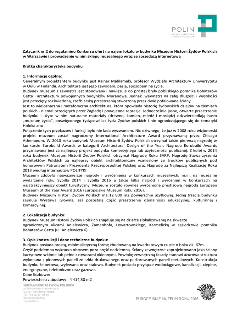 Załącznik nr 2 do regulaminu Konkursu ofert na najem lokalu w budynku Muzeum Historii Żydów Polskich w Warszawie i prowadzenie w nim sklepu muzealnego wraz ze sprzedażą internetową Krótka charakterystyka budynku 1. Informacje ogólne: Generalnym projektantem budynku jest Rainer Mahlamäki, profesor Wydziału Architektury Uniwersytetu w Oulu w Finlandii. Architektura jest jego zawodem, pasją, sposobem na życie. Budynek muzeum z zewnątrz jest stonowany i nawiązuje do prostej bryły pobliskiego pomnika Bohaterów Getta i architektury powojennych budynków Muranowa. Jednak wewnątrz na całej długości i wysokości jest przecięty rozświetloną, rzeźbiarską przestrzenią stworzoną przez dwie pofalowane ściany. Jest to wieloznaczna i metaforyczna architektura, która opowiada historię żydowskich dziejów na ziemiach polskich - niemal przeciętych przez Zagładę i powojenne represje. Jednocześnie jasne, otwarte przestrzenie budynku i użyte w nim naturalne materiały (drewno, kamień, miedź i mosiądz) odzwierciedlają hasło „muzeum życia”, poświęconego tysiącowi lat życia Żydów polskich i nie ograniczającego się do tematyki Holokaustu. Połączenie tych przekazów i funkcji było nie lada wyzwaniem. Nic dziwnego, że już w 2008 roku wizjonerski projekt muzeum został nagrodzony International Architecture Award przyznawaną przez Chicago Athenaeum. W 2013 roku budynek Muzeum Historii Żydów Polskich otrzymał także pierwszą nagrodę w konkursie Eurobuild Awards w kategorii Architectural Design of the Year. Nagroda Eurobuild Awards przyznawana jest za najlepszy projekt budynku komercyjnego lub użyteczności publicznej. Z kolei w 2014 roku budynek Muzeum Historii Żydów Polskich otrzymał Nagrodę Roku SARP, Nagrodę Stowarzyszenia Architektów Polskich za najlepszy obiekt architektoniczny wzniesiony ze środków publicznych pod honorowym Patronatem Prezydenta Rzeczypospolitej Polskiej oraz Nagrodę za Najlepszą Realizację Roku 2013 według internautów POLITYKI. Muzeum zdobyło najważniejsze nagrody i wyróżnienia w konkursach muzealnych, m.in. na muzealne wydarzenie roku Sybilla 2014 i Sybilla 2015 a także kilka nagród i wyróżnień w konkursach na najatrakcyjniejszy obiekt turystyczny. Muzeum zostało również wyróżnione prestiżową nagrodą European Museum of the Year Award 2016 (Europejskie Muzeum Roku 2016). Budynek Muzeum Historii Żydów Polskich ma 12 800 m2 powierzchni użytkowej. Jedną trzecią budynku zajmuje Wystawa Główna, zaś pozostałą część przestrzenie działalności edukacyjnej, kulturalnej i komercyjnej. 2. Lokalizacja budynku: Budynek Muzeum Historii Żydów Polskich znajduje się na działce zlokalizowanej na skwerze ograniczonym ulicami Anielewicza, Zamenhofa, Lewartowskiego, Karmelicką w sąsiedztwie pomnika Bohaterów Getta (ul. Anielewicza 6). 3. Opis konstrukcji i dane techniczne budynku: Budynek posiada prostą, minimalistyczną formę zbudowaną na kwadratowym rzucie o boku ok. 67m. Część podziemna wykracza obrysem poza część nadziemną. Ściany zewnętrzne zaprojektowano jako ściany kurtynowe szklone lub pełne z otworami okiennymi. Powłokę zewnętrzną fasady stanowi ażurowa struktura wykonana z pionowych paneli ze szkła drukowanego oraz perforowanych paneli metalowych. Konstrukcja budynku żelbetowa, wylewana oraz stalowa. Budynek posiada przyłącze wodociągowe, kanalizacji, cieplne, energetyczne, telefoniczne oraz gazowe. Dane liczbowe: Powierzchnia zabudowy - 4 414,50 m2 Powierzchnia netto - 16 374,16 m2 Liczba miejsc parkingowych - 27 Liczba kondygnacji nadziemnych – 4 Liczba kondygnacji podziemnych – 1 4. Opis układu funkcjonalnego: Obiekt ma 4 kondygnacje nadziemne i dwie kondygnacje podziemne. Na najniższej kondygnacji podziemnej została zlokalizowana powierzchnia wystawowa, a od strony ul. Lewartowskiego pomieszczenia o przeznaczeniu warsztatowo-magazynowym i pomieszczenia techniczne. Na parterze budynku zlokalizowano hol wejściowy z zapleczem kasowym, restaurację z zapleczem kuchennym, powierzchnia wystaw czasowych, Centralną Bazę Judaików, Miejsce Edukacji Rodzinnej „U króla Maciusia”, biura i pomieszczenie ochrony. Od poziomu parteru budynek dzieli zadaszony pasaż (atrium). Z jednej strony do pasażu budynek został podzielony na 4 kondygnacje nadziemne, z których kondygnacje 2, 3 i 4 mają główne przeznaczenie biurowo-administracyjne. Po drugiej stronie pasażu powyżej parteru zostały zlokalizowane sale projekcyjne dla około 100 i 60 osób, audytorium z widownią dla około 480 osób, zaplecza sceny i inne pomieszczenia pomocnicze. Obiekt obsługiwany jest pod względem komunikacyjnym przez zespoły wind i klatki schodowe. Do ewakuacji z poszczególnych kondygnacji budynku służy 5 obudowanych klatek schodowych (cztery klatki schodowe usytuowane w rogach budynku). Piąta klatka schodowa została zlokalizowana przy zewnętrznej ścianie od strony dostaw. Wyjścia końcowe z klatek schodowych prowadzą bezpośrednio lub przez krótkie otwarte hole na zewnątrz budynku. Ponadto do komunikacji między kondygnacjami służą nieobudowane schody. 5.Opis funkcji poszczególnych kondygnacji: Kondygnacja -2: Ekspozycja stała muzeum, przygotowanie wystaw warsztaty, usługi dla zwiedzających, pomieszczenia gospodarcze i techniczne, galeria handlowa. Kondygnacja -1: Wejście pomocnicze, pomieszczenia pracownicze, podjazd dostawczy i serwisowy, pomieszczenia gospodarcze. Parter: Zespół głównego holu wejściowego, Miejsce Edukacji Rodzinnej „U króla Maciusia”, restauracja z zapleczem, sklep muzealny, Centralna Baza Judaików, wystawy czasowe, pomieszczenia pomocnicze. Kondygnacja +1: Zespół centrum edukacyjnego, audytorium z zapleczem, sale projekcyjne. Kondygnacja +2: Pomieszczenia biurowe, pomieszczenia konserwacji, magazynowe, techniczne. Kondygnacja +3: Pomieszczenia biurowe, tłumaczy, pomieszczenia techniczne.