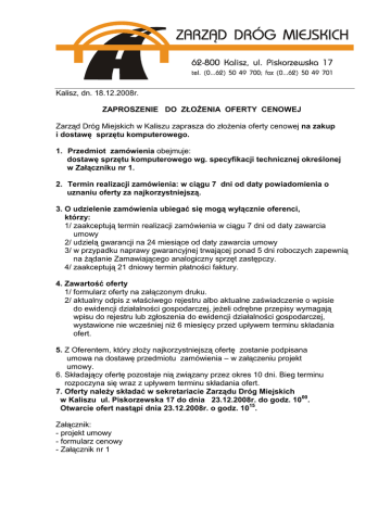 Kalisz, dn. 18.12.2008r. ZAPROSZENIE DO ZŁOśENIA OFERTY CENOWEJ Zarząd Dróg Miejskich w Kaliszu zaprasza do złoŜenia oferty cenowej na zakup i dostawę sprzętu komputerowego. 1. Przedmiot zamówienia obejmuje: dostawę sprzętu komputerowego wg. specyfikacji technicznej określonej w Załączniku nr 1. 2. Termin realizacji zamówienia: w ciągu 7 dni od daty powiadomienia o uznaniu oferty za najkorzystniejszą. 3. O udzielenie zamówienia ubiegać się mogą wyłącznie oferenci, którzy: 1/ zaakceptują termin realizacji zamówienia w ciągu 7 dni od daty zawarcia umowy 2/ udzielą gwarancji na 24 miesiące od daty zawarcia umowy 3/ w przypadku naprawy gwarancyjnej trwającej ponad 5 dni roboczych zapewnią na Ŝądanie Zamawiającego analogiczny sprzęt zastępczy. 4/ zaakceptują 21 dniowy termin płatności faktury. 4. Zawartość oferty 1/ formularz oferty na załączonym druku. 2/ aktualny odpis z właściwego rejestru albo aktualne zaświadczenie o wpisie do ewidencji działalności gospodarczej, jeŜeli odrębne przepisy wymagają wpisu do rejestru lub zgłoszenia do ewidencji działalności gospodarczej, wystawione nie wcześniej niŜ 6 miesięcy przed upływem terminu składania ofert. 5. Z Oferentem, który złoŜy najkorzystniejszą ofertę zostanie podpisana umowa na dostawę przedmiotu zamówienia – w załączeniu projekt umowy. 6. Składający ofertę pozostaje nią związany przez okres 10 dni. Bieg terminu rozpoczyna się wraz z upływem terminu składania ofert. 7. Oferty naleŜy składać w sekretariacie Zarządu Dróg Miejskich w Kaliszu ul. Piskorzewska 17 do dnia 23.12.2008r. do godz. 1000. Otwarcie ofert nastąpi dnia 23.12.2008r. o godz. 1015. Załącznik: - projekt umowy - formularz cenowy - Załącznik nr 1 PROJEKT UMOWY zawarta w dniu ………………. r. w Kaliszu pomiędzy Zarządem Dróg Miejskich w Kaliszu ul. Piskorzewska 17, reprezentowanym przez: ……………………………………………………. zwanym w dalszej treści „Zamawiającym ” a ………………………………………………….. mającym swą siedzibę: ………………………… zwanym w dalszej treści umowy „Wykonawcą” o treści następującej: §1 1. Zamawiający zleca a Wykonawca przyjmuje do realizacji dostawę sprzętu komputerowego wg. specyfikacji technicznej określonej w Załączniku nr 1 do Zaproszenia z dnia 18 grudnia 2008r.. 2. Miejscem dostawy jest siedziba Zamawiającego : ul. Piskorzewska 17, 62-800 Kalisz. §2 Termin wykonania zamówienia : w ciągu 7 dni od daty zawarcia umowy. §3 Integralną część niniejszej umowy stanowią: 1/ oferta Wykonawcy, 2/ zaproszenie do złoŜenia oferty cenowej, §4 1. Strony ustalają wynagrodzenie za przedmiot umowy w kwocie: ……………………………… zł (słownie złotych: …………………………………….). 2. Wynagrodzenie zawiera podatek VAT. §5 1. Przedstawicielem Wykonawcy jest: 2. Koordynatorem z ramienia Zamawiającego jest: §6 1.Wynagrodzenie Wykonawcy płatne będzie fakturą końcową po dostarczeniu Zamawiającemu przedmiotu umowy. 2.Termin płatności faktur ustala się na 21 dni od daty doręczenia faktury. 3. Wynagrodzenie płatne będzie poleceniem przelewu na konto Wykonawcy. 4. Za datę zapłaty przyjmuje się datę obciąŜenia rachunku Zamawiającego. §7 1. Zakazuje się zmian postanowień zawartej umowy w stosunku do treści oferty, na podstawie której dokonano wyboru wykonawcy, chyba Ŝe zamawiający przewidział moŜliwość dokonania takiej zmiany w ogłoszeniu o zamówieniu lub w specyfikacji istotnych warunków zamówienia oraz określił warunki takiej zmiany. 2. Zmiana umowy dokonana z naruszeniem przepisu ust. 1 jest niewaŜna. §8 Wszelkie spory wynikłe na tle realizacji niniejszej umowy Strony poddają rozstrzygnięciu właściwych ze względu na siedzibę Zamawiającego sądów powszechnych. §9 W sprawach nie uregulowanych niniejszą umową stosuje się odpowiednio przepisy ustawy Prawo zamówień publicznych, przepisy kodeksu cywilnego oraz w sprawach procesowych przepisy kodeksu postępowania cywilnego. § 10 Umowę sporządza się w 3 jednobrzmiących egz., w tym 2 egz. dla Zamawiającego, 1 egz. dla Wykonawcy. Zamawiający: Wykonawca: FORMULARZ OFERTY ___________________________________________________ nazwa oferenta siedziba oferenta Do Zarząd Dróg Miejskich ul.Piskorzewska 17 62-800 Kalisz Nawiązując do Waszego pisma z dnia 18 grudnia 2008 składam ofertę cenową na: „ Dostawę sprzętu komputerowego.” 1. Oferujemy wykonanie robót objętych zaproszeniem za cenę brutto .............................................................zł (słownie złotych: ...........................................................................................................) 2. Oświadczamy, Ŝe akceptujemy zawarty w zaproszeniu: - termin realizacji zamówienia: w ciągu 7 dni od daty zawarcia umowy - warunek udzielenia gwarancji na 24 miesiące od daty zawarcia umowy -warunek w przypadku naprawy gwarancyjnej trwającej ponad 5 dni roboczych zapewnienia na Ŝądanie Zamawiającego analogicznego sprzętu zastępczego. - 21 dniowy termin płatności faktur. 3. Oświadczamy, Ŝe zawarty w zaproszeniu projekt umowy został przez nas zaakceptowany i zobowiązujemy się w przypadku wyboru naszej oferty do zawarcia umowy na wyŜej wymienionych warunkach w miejscu i terminie wyznaczonym przez Zamawiającego. Załącznikami do niniejszej oferty są: 1) ............................................................. 2) ............................................................. Podpisano: ............................................................. (upowaŜniony przedstawiciel) dnia, ................................................... (specyfikacja techniczna i ilościowa) szt. UWAGI 2 Zestaw komputerowy złoŜony z preinstalowanym oprogramowaniem Załącznik nr 1 Podzespół Procesor Płyta główna Obudowa Pamięć Dysk twardy Stacja dysków Kl