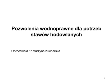 Pozwolenia wodnoprawne dla potrzeb stawów hodowlanych Opracowała : Katarzyna Kucharska 1 Pozwolenia wodnoprawne wydawane są na podstawie ustawy Prawo wodne z dnia 18 lipca 2001 r. tekst jednolity z 10 stycznia 2012 r. (Dz.U. z 2012 r., poz. 145 ze zm.) 2 KORZYSTANIE Z WÓD Korzystanie z wód dla potrzeb stawów jest szczególnym korzystaniem z wód i obejmuje w szczególności: - pobór oraz odprowadzanie wód powierzchniowych; - piętrzenie oraz retencjonowanie śródlądowych wód powierzchniowych; 3 ZAGADNIENIA OGÓLNE W myśl ustawy Prawo wodne stawy rybne są urządzeniami wodnymi. Przez urządzenia wodne - rozumie się urządzenia służące kształtowaniu zasobów wodnych oraz korzystaniu z nich, a w szczególności: • budowle: piętrzące, upustowe, a także kanały i rowy, • zbiorniki, obiekty zbiorników i stopni wodnych, • stawy rybne oraz stawy przeznaczone do oczyszczania ścieków, rekreacji lub innych celów, • obiekty służące do ujmowania wód powierzchniowych, • stałe urządzenia służące do połowu ryb lub do pozyskiwania innych organizmów wodnych, • pomosty, przystanie, kąpieliska Na wykonanie urządzeń wodnych wymagane jest pozwolenie wodnoprawne. 4 BUDOWNICTWO WODNE • Generalnie budownictwo wodne polega na wykonywaniu oraz utrzymywaniu urządzeń wodnych. • Utrzymywanie urządzeń wodnych polega na ich eksploatacji, konserwacji oraz remontach w celu zachowania ich funkcji. • W kosztach utrzymywania urządzeń wodnych uczestniczy ten, kto odnosi z nich korzyści; ustalenia i podziału kosztów dokonuje na wniosek właściciela urządzenia wodnego, w drodze decyzji, organ właściwy do wydania pozwolenia wodnoprawnego. 5 POZWOLENIA WODNOPRAWNE zasady ogólne Pozwolenie wodnoprawne nie rodzi praw do nieruchomości i urządzeń wodnych koniecznych do jego realizacji oraz nie narusza prawa własności i uprawnień osób trzecich przysługujących wobec tych nieruchomości i urządzeń. 6 Czego nie może naruszać pozwolenie wodnoprawne • Pozwolenie wodnoprawne nie może naruszać: 1) ustaleń planu gospodarowania wodami na obszarze dorzecza, lub ustaleń warunków korzystania z wód regionu wodnego lub warunków korzystania z wód zlewni; 2) ustaleń miejscowych planów zagospodarowania przestrzennego, decyzji o ustaleniu lokalizacji inwestycji celu publicznego oraz decyzji o warunkach zabudowy; 3) wymagań ochrony zdrowia ludzi, środowiska i dóbr kultury wpisanych do rejestru zabytków oraz wynikających z odrębnych przepisów. • Jeżeli projektowany sposób korzystania z wody narusza ustalenia dokumentów, o których mowa wyżej lub nie spełnia powyższych wymagań wydania pozwolenia wodnoprawnego odmawia się. 7 WNIOSEK O WYDANIE POZWOLENIA WODNOPRAWNEGO • Pozwolenie wodnoprawne wydaje się na wniosek, do którego dołącza się: 1) operat wodnoprawny, 2) decyzję o lokalizacji inwestycji celu publicznego lub decyzję o warunkach zabudowy, jeżeli jest ona wymagana - w przypadku wniosku o wydanie pozwolenia wodnoprawnego na wykonanie urządzenia wodnego; 3) opis prowadzenia zamierzonej działalności sporządzony w języku nietechnicznym. • • • Do wniosku o wydanie pozwolenia wodnoprawnego na piętrzenie wód powierzchniowych lub na zależne od siebie korzystanie z wód przez kilka zakładów dołącza się projekt instrukcji gospodarowania wodą, zawierający opis sposobu gospodarowania wodą i zaspokojenia potrzeb wszystkich użytkowników odnoszących korzyści z urządzenia wodnego, którego dotyczy instrukcja. Decyzję środowiskową – jeżeli jest ona wymagana. Pozwolenie wodnoprawne na wykonanie urządzeń wodnych może być wydane na podstawie projektu tych urządzeń, jeżeli projekt ten odpowiada wymaganiom operatu. 8 WYMAGANIA DLA OPERATU WODNOPRAWNEGO • Operat sporządza się w formie opisowej i graficznej. • Operat sporządza się także na elektronicznych nośnikach danych jako dokument tekstowy, zaś część graficzną operatu w postaci plików typu wektorowego lub rastrowego. • Część opisowa operatu zawiera: 1) oznaczenie zakładu ubiegającego się o wydanie pozwolenia, jego siedziby i adresu; 2) wyszczególnienie: a) celu i zakresu zamierzonego korzystania z wód, b) rodzaju urządzeń pomiarowych oraz znaków żeglugowych, c) stanu prawnego nieruchomości usytuowanych w zasięgu oddziaływania zamierzonego korzystania z wód lub planowanych do wykonania urządzeń wodnych, z podaniem siedzib i adresów ich właścicieli, d) obowiązków ubiegającego się o wydanie pozwolenia w stosunku do osób trzecich; 9 WYMAGANIA DLA OPERATU WODNOPRAWNEGO CD 3) opis urządzenia wodnego, w tym położenie za pomocą współrzędnych geograficznych oraz podstawowe parametry charakteryzujące to urządzenie i warunki jego wykonania; 4) charakterystykę wód objętych pozwoleniem wodnoprawnym; 5) ustalenia wynikające z planu gospodarowania wodami na obszarze dorzecza i warunków korzystania z wód regionu wodnego; 6) określenie wpływu gospodarki wodnej zakładu na wody powierzchniowe oraz podziemne, w szczególności na stan tych wód i realizację celów środowiskowych dla nich określonych; 7) planowany okres rozruchu i sposób postępowania w przypadku rozruchu, zatrzymania działalności bądź wystąpienia awarii lub uszkodzenia urządzeń pomiarowych oraz rozmiar, warunki korzystania z wód i urządzeń wodnych w tych sytuacjach; 8) informację o formach ochrony przyrody utworzonych lub ustanowionych na podstawie ustawy z dnia 16 kwietnia 2004 r. o ochronie przyrody, występujących w zasięgu oddziaływania zamierzonego korzystania z wód lub planowanych do wykonania urządzeń wodnych. 10 WYMAGANIA DLA OPERATU WODNOPRAWNEGO CD 3. Część graficzna operatu zawiera: 1) plan urządzeń wodnych i zasięg oddziaływania zamierzonego korzystania z wód lub planowanych do wykonania urządzeń wodnych, z oznaczeniem nieruchomości wraz z ich powierzchnią, naniesiony na mapę sytuacyjno-wysokościową ter