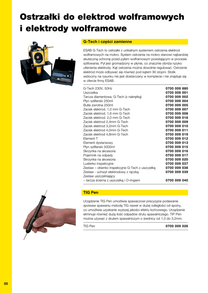 Ostrzałki do elektrod wolframowych i elektrody wolframowe G-Tech i części zamienne ESAB G-Tech to ostrzałki z unikalnym systemem ostrzenia elektrod wolframowych na mokro. System ostrzenia na mokro stanowi najbardziej skuteczną ochronę przed pyłem wolframowym powstającym w procesie szlifowania. Pył jest gromadzony w płynie, co znacznie obniża ryzyko utlenienia elektrody. Kąt ostrzenia można dowolnie regulować. Ostrzenie elektrod może odbywać się również pod kątem 90 stopni. Stolik widoczny na rysunku nie jest dostarczany w komplecie i nie znajduje się w ofercie firmy ESAB. G-Tech 230V, 50Hz Uszczelka Tarcza diamentowa, G-Tech (z nakrętką) Płyn szlifierski 250ml Butla zwrotna 250ml Zacisk elektrod. 1,0 mm G-Tech Zacisk elektrod. 1,6 mm G-Tech Zacisk elektrod. 2,0 mm G-Tech Zacisk elektrod 2,4mm G-Tech Zacisk elektrod 3,2mm G-Tech Zacisk elektrod 4,0mm G-Tech Zacisk elektrod 4,8mm G-Tech Element T Element dystansowy Płyn szlifierski 5000ml Skrzynka na akcesoria Pojemnik na odpady Skrzynka na akcesoria Lusterko inspekcyjne Zestaw – okienko inspekcyjne G-Tech z uszczelką Zestaw - uchwyt elektrodowy z rączką Zestaw uszczelniający – tarcza ścierna z uszczelką i O-ringiem 0700 0700 0700 0700 0700 0700 0700 0700 0700 0700 0700 0700 0700 0700 0700 0700 0700 0700 0700 0700 0700 009 009 009 009 009 009 009 009 009 009 009 009 009 009 009 009 009 009 009 009 009 880 001 002 004 005 007 008 018 009 010 011 019 012 013 015 016 017 020 037 038 039 0700 009 040 TIG Pen Urządzenie TIG Pen umożliwia spawaczowi precyzyjne podawanie spoiwaw spawaniu metodą TIG nawet w dużej odległości od spoiny, co umożliwia uzyskanie wyższej jakości efektu końcowego. Urządzenie eliminuje również dużą ilość odpadów drutu spawalniczego. TIP Pen można używać z drutem spawalniczym o średnicy od 1,0 do 3,2mm. TIG Pen 88 0700 009 026 Elektrody wolframowe Elektrody wolframowe Te wysokiej jakości elektrody wolframowe oferowane są w postaci czystej lub ze stopem zawierającym tor, cer lub lantan (Gold Plus). Elektrody wolframowe ESAB dają doskonałe właściwości spawalnicze i zajarzenia łuku. Dostarczane są w pojemnikach z tworzywa sztucznego, po dziesięć sztuk w opakowaniu. Dostępne są elektrody o długości 150 i 175mm. WT20 WT20 WT20 WT20 WT20 W W W W W 1,0 1,6 2,4 3,2 4,0 Pure Pure Pure Pure Pure x x x x x 1,0 1,6 2,4 3,2 4,0 175mm 175mm 175mm 175mm 175mm x x x x x (Wolfram (Wolfram (Wolfram (Wolfram (Wolfram 175mm 175mm 175mm 175mm 175mm (Wolfram) (Wolfram) (Wolfram) (Wolfram) (Wolfram) WC20 WC20 WC20 WC20 WC20 1,0 1,6 2,4 3,2 4,0 x x x x x 175mm 175mm 175mm 175mm 175mm (wolfram (wolfram (wolfram (wolfram (wolfram WL15 WL15 WL15 WL15 WL15 WL15 1,0 1,6 2,4 3,2 4,0 4,8 x x x x x x 175mm 175mm 175mm 175mm 175mm 175mm Gold Gold Gold Gold Gold Gold WT20 WT20 WT20 WT20 WT20 WT20 1,0 1,6 2,0 2,4 3,2 4,0 x x x x x x 150mm 150mm 150mm 150mm 150mm 150mm (Wolfram (Wolfram (Wolfram (Wolfram (Wolfram (Wolfram W W W W W W Pure Pure Pure Pure Pure Pure WC20 WC20 WC20 WC20 WC20 WC20 1,0 1,6 2,0 2,4 3,2 4,0 1,0 1,6 2,0 2,4 3,2 4,0 x x x x x x x x x x x x 150mm 150mm 150mm 150mm 150mm 150mm 150mm 150mm 150mm 150mm 150mm 150mm + + + + + + + + + + Plus Plus Plus Plus Plus Plus 574 574 574 574 574 001 002 003 004 005 zielona zielona zielona zielona zielona 0151 0151 0151 0151 0151 574 574 574 574 574 008 009 010 011 012 cer) cer) cer) cer) cer) 0151 0151 0151 0151 0151 574 574 574 574 574 036 037 038 039 040 0151 0151 0151 0151 0151 0151 574 574 574 574 574 574 050 051 052 053 054 055 0151 0151 0151 0151 0151 0151 574 574 574 574 574 574 201 202 244 203 204 205 zielona zielona zielona zielona zielona zielona 0151 0151 0151 0151 0151 0151 574 574 574 574 574 574 208 209 245 210 211 212 cer) cer) cer) cer) cer) cer) 0151 0151 0151 0151 0151 0151 574 574 574 574 574 574 236 237 242 238 239 240 czerwone czerwone czerwone czerwone czerwone szara szara szara szara szara (Wolfram + lantan) złote (Wolfram + lantan) złote (Wolfram + lantan) złote (Wolfram + lantan) złote (Wolfram + lantan) złote ((Wolfram + lantan) złote + + + + + + (Wolfram) (Wolfram) (Wolfram) (Wolfram) (Wolfram) (Wolfram) (Wolfram (Wolfram (Wolfram (Wolfram (Wolfram (Wolfram 0151 0151 0151 0151 0151 tor) tor) tor) tor) tor) + + + + + + tor) tor) tor) tor) tor) tor) czerwone czerwone czerwone czerwone czerwone czerwone szare szare szare szare szare szare 89