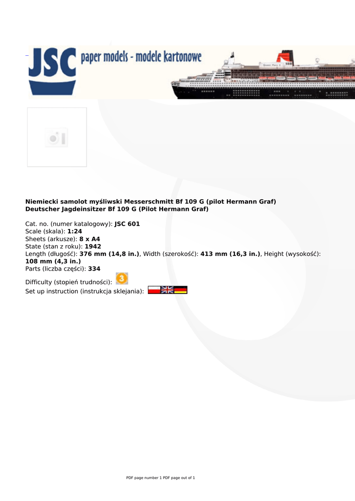 Niemiecki samolot myśliwski Messerschmitt Bf 109 G (pilot Hermann Graf) Deutscher Jagdeinsitzer Bf 109 G (Pilot Hermann Graf) Cat. no. (numer katalogowy): JSC 601 Scale (skala): 1:24 Sheets (arkusze): 8 x A4 State (stan z roku): 1942 Length (długość): 376 mm (14,8 in.), Width (szerokość): 413 mm (16,3 in.), Height (wysokość): 108 mm (4,3 in.) Parts (liczba części): 334 Difficulty (stopień trudności): Set up instruction (instrukcja sklejania): PDF page number 1 PDF page out of 1