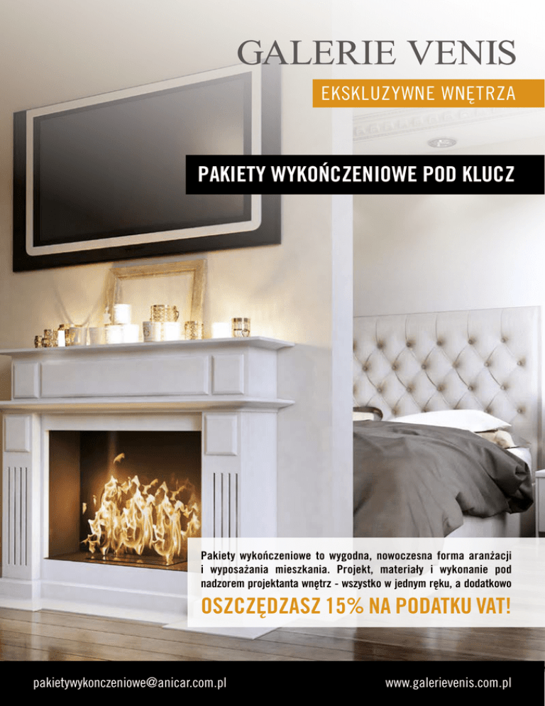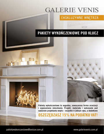 EKSKLUZYWNE WNĘTRZA PAKIETY WYKOŃCZENIOWE POD KLUCZ Pakiety wykończeniowe to wygodna, nowoczesna forma aranżacji i wyposażania mieszkania. Projekt, materiały i wykonanie pod nadzorem projektanta wnętrz - wszystko w jednym ręku, a dodatkowo OSZCZĘDZASZ 15% NA PODATKU VAT! [email protected] www.galerievenis.com.pl Pakiety wykończeniowe GALERIE VENIS uważane są za najlepsze pakiety na rynku pod względem jakości materiałów i zakresu prac. DLACZEGO WARTO? • oszczędność 15% – pakiety wykończeniowe są obciążone jedynie 8% stawką VAT, • z góry uzgodniona cena za m2 wykończenia, • selekcja wysokiej jakości materiałów ze specjalnie stworzonych katalogów wykończeniowych dla poszczególnych pakietów, • możliwość indywidualnej modyfikacji pakietów, • opracowanie indywidualnego projektu przez projektanta i nadzór autorski nad realizacją prac wykończeniowych, • brak kłopotów związanych z poszukiwaniem ekip budowlanych, koordynowaniem dostaw i nadzorem, • możliwość pokrycia kosztów wykańczania i projektów wnętrz jednym kredytem mieszkaniowym, • sprzątanie po zakończonych pracach, • gwarancja 36 miesięcy. PRZYKŁADOWY ZAKRES PRAC WRAZ Z MATERIAŁAMI LP. ILOŚĆ 1 Drzwi Wg projektu 2 Klamki Wg projektu 3 Płytki gresowe Wg projektu 4 Płytki ścienne (łazienki, wc) Wg projektu 5 Panele podłogowe Wg projektu 6 Cokół Wg projektu 7 Dekoracje (dekory, elementy marmurowe) Dodatkowo płatne 8 WC kompakt z deską Wg projektu 9 Umywalki (z syfonem) 1 szt/ łazienka 10 Wanna lub kabina z brodzikiem (z syfonem) 1 element/ łazienka 11 Bateria wannowa lub prysznicowa Wg projektu 12 Bateria umywalkowa Wg projektu 13 Farby - pełna kolorystyka NCS, malowanie x 2 Wg projektu 14 Farba biała - sufity, malowanie x 2 Wg projektu 15 Klej elastyczny Wg zapotrzebowania 16 Fugowanie Wg zapotrzebowania 17 Akrylowanie Wg zapotrzebowania 18 Silikony Wg zapotrzebowania O szczegóły dotyczące pakietów wykończeniowych zapytaj swojego dewelopera lub skontaktuj się z nami: [email protected], tel. 602 244 352. Zapraszamy również do zapoznania się z unikatową na rynku ofertą pakietu obejmującego aranżację i wyposażenie kuchni (bez sprzętów AGD) już od 699 zł/m2. [email protected] www.galerievenis.com.pl EKSKLUZYWNE WNĘTRZA PAKIETY WYKOŃCZENIOWE GALERIE VENIS TO ŚWIETNY DESIGN I NIEOGRANICZONY WYBÓR MATERIAŁÓW! GALERIE VENIS są marką należąca do firmy Anicar Sp. z o.o., działającej w branży aranżacji i wyposażania wnętrz od ponad 20 lat. GALERIE VENIS to ekskluzywne salony sprzedaży z wyposażeniem wnętrz oraz biuro architektury wnętrz. Połączenie dwóch czynników – doskonałej jakości materiałów od najlepszych hiszpańskich, włoskich i niemieckich producentów oraz kreatywności i zaangażowania zespołu projektantów wnętrz – zadowala gusta nawet najbardziej wymagających klientów. Salony sprzedaży GALERIE VENIS w Warszawie: • SALON TARGÓWEK: Park Handlowy Targówek, ul. Malborska 37, lok. B6, tel. 22 676 73 07 • SALON ALEJE JEROZOLIMSKIE: TTW Home, Al. Jerozolimskie 185, lok. 23, tel. 22 658 08 05 • SALON BARTYCKA, ul. Bartycka 26, pawilon 16A, lok. 852, 853, tel. 22 891 13 01 GALERIE VENIS DESIGN STUDIO, ul. Grochowska 168, tel. 602 244 352, 22 673 03 70, [email protected] [email protected] www.galerievenis.com.pl