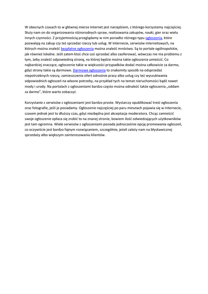 W obecnych czasach to w głównej mierze Internet jest narzędziem, z którego korzystamy najczęściej. Służy nam on do organizowania różnorodnych spraw, realizowania zakupów, nauki, gier oraz wielu innych czynności. Z przyjemnością przeglądamy w nim ponadto różnego typu ogłoszenia, które pozwalają na zakup czy też sprzedaż rzeczy lub usług. W Internecie, serwisów internetowych, na których można znaleźć bezpłatne ogłoszenia można znaleźć mnóstwo. Są to portale ogólnopolskie, jak również lokalne. Jeśli zatem ktoś chce coś sprzedać albo zaoferować, wówczas nie ma problemu z tym, żeby znaleźć odpowiednią stronę, na której będzie można takie ogłoszenia umieścić. Co najbardziej znaczące, ogłoszenie takie w większości przypadków dodać można całkowicie za darmo, gdyż strony takie są darmowe. Darmowe ogłoszenia to znakomity sposób na odsprzedaż niepotrzebnych rzeczy, zamieszczenie ofert odnośnie pracy albo usług czy też wyszukiwania odpowiednich ogłoszeń na własne potrzeby, na przykład tych na temat nieruchomości bądź nawet mody i urody. Na portalach z ogłoszeniami bardzo często można odnaleźć także ogłoszenia „oddam za darmo”, które warto zobaczyć. Korzystanie z serwisów z ogłoszeniami jest bardzo proste. Wystarczy opublikować treść ogłoszenia oraz fotografie, jeśli je posiadamy. Ogłoszenie najczęściej po paru minutach pojawia się w Internecie, czasem jednak jest to dłuższy czas, gdyż niezbędna jest akceptacja moderatora. Chcąc zamieścić swoje ogłoszenie opłaca się zrobić to na znanej stronie, bowiem ilość odwiedzających użytkowników jest tam ogromna. Wiele serwisów z ogłoszeniami posiada jednocześnie opcję promowania ogłoszeń, co oczywiście jest bardzo fajnym rozwiązaniem, szczególnie, jeżeli zależy nam na błyskawicznej sprzedaży albo większym zainteresowaniu klientów.