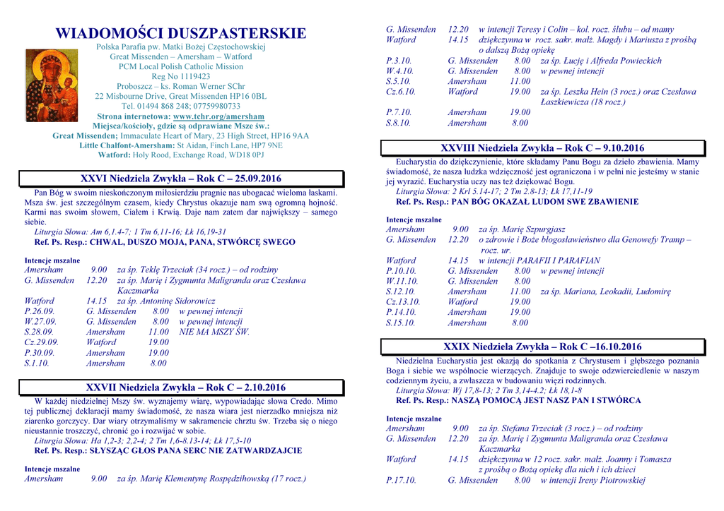 WIADOMOŚCI DUSZPASTERSKIE Polska Parafia pw. Matki Bożej Częstochowskiej Great Missenden – Amersham – Watford PCM Local Polish Catholic Mission Reg No 1119423 Proboszcz – ks. Roman Werner SChr 22 Misbourne Drive, Great Missenden HP16 0BL Tel. 01494 868 248; 07759980733 Strona internetowa: www.tchr.org/amersham Miejsca/kościoły, gdzie są odprawiane Msze św.: Great Missenden; Immaculate Heart of Mary, 23 High Street, HP16 9AA Little Chalfont-Amersham: St Aidan, Finch Lane, HP7 9NE Watford: Holy Rood, Exchange Road, WD18 0PJ XXVI Niedziela Zwykła – Rok C – 25.09.2016 Pan Bóg w swoim nieskończonym miłosierdziu pragnie nas ubogacać wieloma łaskami. Msza św. jest szczególnym czasem, kiedy Chrystus okazuje nam swą ogromną hojność. Karmi nas swoim słowem, Ciałem i Krwią. Daje nam zatem dar największy – samego siebie. Liturgia Słowa: Am 6,1.4-7; 1 Tm 6,11-16; Łk 16,19-31 Ref. Ps. Resp.: CHWAL, DUSZO MOJA, PANA, STWÓRCĘ SWEGO Intencje mszalne Amersham G. Missenden Watford P.26.09. W.27.09. S.28.09. Cz.29.09. P.30.09. S.1.10. 9.00 12.20 za śp. Teklę Trzeciak (34 rocz.) – od rodziny za śp. Marię i Zygmunta Maligranda oraz Czesława Kaczmarka 14.15 za śp. Antoninę Sidorowicz G. Missenden 8.00 w pewnej intencji G. Missenden 8.00 w pewnej intencji Amersham 11.00 NIE MA MSZY ŚW. Watford 19.00 Amersham 19.00 Amersham 8.00 XXVII Niedziela Zwykła – Rok C – 2.10.2016 W każdej niedzielnej Mszy św. wyznajemy wiarę, wypowiadając słowa Credo. Mimo tej publicznej deklaracji mamy świadomość, że nasza wiara jest nierzadko mniejsza niż ziarenko gorczycy. Dar wiary otrzymaliśmy w sakramencie chrztu św. Trzeba się o niego nieustannie troszczyć, chronić go i rozwijać w sobie. Liturgia Słowa: Ha 1,2-3; 2,2-4; 2 Tm 1,6-8.13-14; Łk 17,5-10 Ref. Ps. Resp.: SŁYSZĄC GŁOS PANA SERC NIE ZATWARDZAJCIE G. Missenden Watford 9.00 za śp. Marię Klementynę Rospędzihowską (17 rocz.) w intencji Teresy i Colin – kol. rocz. ślubu – od mamy dziękczynna w rocz. sakr. małż. Magdy i Mariusza z prośbą o dalszą Bożą opiekę G. Missenden 8.00 za śp. Łucję i Alfreda Powieckich G. Missenden 8.00 w pewnej intencji Amersham 11.00 Watford 19.00 za śp. Leszka Hein (3 rocz.) oraz Czesława Łaszkiewicza (18 rocz.) Amersham 19.00 Amersham 8.00 P.3.10. W.4.10. S.5.10. Cz.6.10. P.7.10. S.8.10. XXVIII Niedziela Zwykła – Rok C – 9.10.2016 Eucharystia do dziękczynienie, które składamy Panu Bogu za dzieło zbawienia. Mamy świadomość, że nasza ludzka wdzięczność jest ograniczona i w pełni nie jesteśmy w stanie jej wyrazić. Eucharystia uczy nas też dziękować Bogu. Liturgia Słowa: 2 Krl 5.14-17; 2 Tm 2.8-13; Łk 17,11-19 Ref. Ps. Resp.: PAN BÓG OKAZAŁ LUDOM SWE ZBAWIENIE Intencje mszalne Amersham G. Missenden Watford P.10.10. W.11.10. S.12.10. Cz.13.10. P.14.10. S.15.10. 9.00 12.20 za śp. Marię Szpurgjasz o zdrowie i Boże błogosławieństwo dla Genowefy Tramp – rocz. ur. 14.15 w intencji PARAFII I PARAFIAN G. Missenden 8.00 w pewnej intencji G. Missenden 8.00 Amersham 11.00 za śp. Mariana, Leokadii, Ludomirę Watford 19.00 Amersham 19.00 Amersham 8.00 XXIX Niedziela Zwykła – Rok C –16.10.2016 Niedzielna Eucharystia jest okazją do spotkania z Chrystusem i głębszego poznania Boga i siebie we wspólnocie wierzących. Znajduje to swoje odzwierciedlenie w naszym codziennym życiu, a zwłaszcza w budowaniu więzi rodzinnych. Liturgia Słowa: Wj 17,8-13; 2 Tm 3,14-4.2; Łk 18,1-8 Ref. Ps. Resp.: NASZĄ POMOCĄ JEST NASZ PAN I STWÓRCA Intencje mszalne Amersham G. Missenden Watford Intencje mszalne Amersham 12.20 14.15 P.17.10. 9.00 12.20 za śp. Stefana Trzeciak (3 rocz.) – od rodziny za śp. Marię i Zygmunta Maligranda oraz Czesława Kaczmarka 14.15 dziękczynna w 12 rocz. sakr. małż. Joanny i Tomasza z prośbą o Bożą opiekę dla nich i ich dzieci G. Missenden 8.00 w intencji Ireny Piotrowskiej W.18.10. S.19.10. Cz.20.10. P.21.10. S.22.10. G. Missenden Amersham Watford Amersham Amersham 8.00 11.00 19.00 19.00 8.00 NIE MA MSZY ŚW. NIE MA MSZY ŚW. • w pewnej intencji • XXX Niedziela Zwykła – Rok C – 23.10.2016 Obchodzona dzisiaj niedziela misyjna ropoczyna czas tygodniowej intensywnej modlitwy w intencji misyjnej działalności Kościoła. Nakaz misyjny: „Idźcie więc i nauczajcie wszystkie narody, udzielając im chrztu w imię Ojca i Syna, i Ducha Świętego” to ostatnie polecenie, jakie przed swoim powrotem do domu Ojca wydał Jezus Apostołom. Jego realizacja spoczywa na wszystkich, którzy przez chrzest stali się uczniami Chrystusa. Liturgia Słowa: Syr 35,12-14.16-18; 2 Tm 4,6-9.16-18; Łk 18,9-14 Ref. Ps. Resp.: BIEDAK ZAWOŁAŁ I PAN GO WYSŁUCHAŁ • • Intencje mszalne Amersham G. Missenden Watford P.24.10. W.25.10. S.26.10. Cz.27.10. P.28.10. S.29.10. 9.00 12.20 za śp. Marię Lentowicz (dz. ur.) za śp. Antoniego Kołodyńskiego i Zbigniewa Gąsiorowskiego 14.15 w intencji PARAFII I PARAFIAN G. Missenden 8.00 w pewnej intencji G. Missenden 8.00 Amersham 11.00 za śp. Edwarda Mleczko (25 rocz.) Watford 19.00 Amersham 19.00 za śp.ks. Tadeusza Perlika i ks. Tadeusza Myszczyńskiego Amersham 9.00 • • KRONIKA PARAFIALNA CHRZTY: W naszej Wspólnocie Parafialnej 11.09.2016 r. została ochrzczona BARTOSIEWICZ, c. Jeremiego i Pauliny. Niech wzrasta w łasce u Boga i ludzi! Amy Elizabeth OGŁOSZENIA PARAFIALNE • • INTENCJE MSZALNE – tradycją jest, że ludzie proszą o odprawienie Mszy św. w polecanych przez siebie intencjach za żyjących lub zmarłych. Są przekonani, że w czasie sprawowania Najświętszej Ofiary sam Chrystus ofiaruje się Bogu Ojcu za nimi i wstawia się w ich intencjach. Zechciejmy i my otoczyć sami siebie czy też naszych bliskich tą najdoskonalszą z modlitw, prosząc duszpasterza o odprawienie Mszy św. w naszej Parfialnej Wspólnocie. LISTA PARAFIAN – Polskie Wspólnoty Rzymsko-Katolickie, działające w ramach Polskiej Misji Katolickiej w Anglii i Walii nie są para
