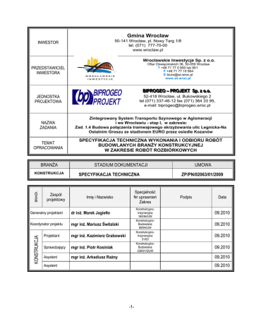 Gmina Wrocław 50-141 Wrocław, pl. Nowy Targ 1/8 tel. (071) 777-70-00 www.wroclaw.pl INWESTOR Wrocławskie Inwestycje Sp. z o.o. Ofiar Oświęcimskich 36, 50-059 Wrocław T +48 71 77 0 900 lub 901 F +48 71 77 10 904 E [email protected] www.wi.wroc.pl PRZEDSTAWICIEL INWESTORA BBIIPPRROOGGEEOO –– PPRROOJJEEKKTT SSpp.. zz oo..oo.. 52-418 Wrocław, ul. Bukowskiego 2 tel (071) 337-46-12 fax (071) 364 33 95, e-mail: [email protected] JEDNOSTKA PROJEKTOWA NAZWA ZADANIA Zintegrowany System Transportu Szynowego w Aglomeracji i we Wrocławiu - etap I, w zakresie: Zad. 1.4 Budowa połączenia tramwajowego skrzyŜowania ulic Legnicka-Na Ostatnim Groszu ze stadionem EURO przez osiedle Kozanów TEMAT OPRACOWANIA SPECYFIKACJA TECHNICZNA WYKONANIA I ODBIORU ROBÓT BUDOWLANYCH BRANśY KONSTRUKCYJNEJ W ZAKRESIE ROBÓT ROZBIÓRKOWYCH BRANśA BRANśA KONSTRUKCJA Zespół projektowy STADIUM DOKUMENTACJI SPECYFIKACJA TECHNICZNA Imię i Nazwisko dr inŜ. Marek Jagiełło Koordynator projektu mgr inŜ. Mariusz Świtalski KONSTRUKCJA Generalny projektant Projektant mgr inŜ. Kazimierz Grabowski Sprawdzający mgr inŜ. Piotr Kosiniak Asystent mgr inŜ. Arkadiusz Raźny Specjalność Nr uprawnień Zakres KonstrukcyjnoInŜynieryjna 165/94/UW KonstrukcyjnoBudowlana 89/94/UW KonstrukcyjnoInŜynieryjna 31/63 KonstrukcyjnoBudowlana 339/01/DUW UMOWA ZP/PN/02063/01/2009 Podpis Data 09.2010 09.2010 09.2010 09.2010 09.2010 09.2010 Asystent -1- FT-10.06.01 Roboty związane z wykonaniem robót betonowych elementów torowiska Zinegrowany System Transportu Szynowego w Aglomeracji i we Wrocławiu – etap I: Zad. 1.4 Budowa połączenia tramwajowego skrzyŜowania ulic Legnicka – Na Ostatnim Groszu ze Stadionem EURO przez Osiedle Kozanów. str. 2 FT-10.06.01 Roboty związane z wykonaniem robót betonowych elementów torowiska BranŜa wiodąca: Kod CPV 45234121-0 Roboty w zakresie kolei tramwajowej Kod CPV 45233120-6 Roboty w zakresie budowy dróg lp Nr specyfikacji Nazwa specyfikacji Strona GRUPA 45100000-8 Przygotowanie terenu pod budowę 1 FR-10.06.01 Roboty związane z rozbiórkami 5 Zinegrowany System Transportu Szynowego w Aglomeracji i we Wrocławiu – etap I: Zad. 1.4 Budowa połączenia tramwajowego skrzyŜowania ulic Legnicka – Na Ostatnim Groszu ze Stadionem EURO przez Osiedle Kozanów. str. 3 FT-10.06.01 Roboty związane z wykonaniem robót betonowych elementów torowiska Zinegrowany System Transportu Szynowego w Aglomeracji i we Wrocławiu – etap I: Zad. 1.4 Budowa połączenia tramwajowego skrzyŜowania ulic Legnicka – Na Ostatnim Groszu ze Stadionem EURO przez Osiedle Kozanów. str. 4 FT-10.06.01 Roboty związane z wykonaniem robót betonowych elementów torowiska SPECYFIKACJA TECHNICZNA WYKONANIA I ODBIORU ROBÓT BUDOWLANYCH FR - 10.06.01 • Roboty związane z rozbiórkami Zinegrowany System Transportu Szynowego w Aglomeracji i we Wrocławiu – etap I: Zad. 1.4 Budowa połączenia tramwajowego skrzyŜowania ulic Legnicka – Na Ostatnim Groszu ze Stadionem EURO przez Osiedle Kozanów. str. 5 FR-10.06.01 Roboty związane z rozbiórkami Ilekroć w tekście będzie mowa o specyfikacji technicznej (ST) bądź o Szczegółowej Specyfikacji technicznej (SST) bądź o ogólnej specyfikacji technicznej (OST) naleŜy przez to rozumieć specyfikacje techniczną wykonania i odbioru robót budowlanych. 1. WSTĘP. 1.1. Przedmiot i zakres specyfikacji Niniejsza specyfikacja obejmuje wymagania dotyczące wykonania i odbioru robót rozbiórkowych obiektów i budynków wymienionych poniŜej dla budowy połączenia tramwajowego skrzyŜowania ulic Legnicka-Na Ostatnim Groszu ze stadionem EURO przez osiedle Kozanów we Wrocławiu: - wiata przystankowa przy ul. Pilczyckiej - kiosk handlowy "OWOCE WARZYWA" przy ul. Pilczyckiej - fragment ściany oporowej Ŝelbetowej przy wjeździe do garaŜu w budynku mieszkalnym przy ul. Dokerskiej 3 - stacja redukcyjno-pomiarowa gazu przy ul. Pilczyckiej - schody na gruncie przy ul. Pilczyckiej - pawilon - Usługi pogrzebowe OMEGA przy ul. Gwareckiej - garaŜ samochodowy przy ul. Gwareckiej - komórki gospodarcze przy ul. Gwareckiej - komórka gospodarcza i studnia przy komórce przy ul. Gwareckiej - zespół garaŜy z altaną przy ul. Pilczyckiej - pawilon kwiatowy przy ul. Dworskiej - kiosk ochrony kwiaciarni z wiatą przy ul. Dworskiej - wiata przystankowa przy ul. Dokerskiej - pomieszczenia kontenerowe warsztatu ostrzenia narzędzi przy ul. Wejherowskiej - wiata stalowa przy ul. Wejherowskiej - śmietnik betonowy i trzepak stalowy przy ul. Pilczyckiej - ogrodzenie siatką przy ul. Wejherowskiej - ogrodzenie murowane przy ul. Wejherowskiej - budynek gospodarczy przyległy do budynku mieszkalnego przy ul. Pilczyckiej 159 - budynek mieszkalny ze sklepem przy ul. Pilczyckiej 159 - budynek mieszkalny z klubem ANIMA przy ul. Pilczyckiej 39 - budynek mieszkalny przy ul. Pilczyckiej 27 - budynek garaŜu i komórki gospodarczej przy ul. Pilczyckiej 27 - siedem kiosków handlowych przy ul. Dokerskiej Roboty obejmują: - odłączenie zasilania elektrycznego, telefonicznego, wody i kanalizacji, - tymczasowe zabezpieczenie terenu rozbiórki, - rozbiórkę obiektów wraz z fundamentami, - wywiezienie materiałów z rozbiórki, - rozbiórka tymczasowego zabezpieczenia terenu rozbiórki . 1.2. Klasyfikacja robót wg Wspólnego Słownika Zamówień (CPV). Roboty rozbiórkowe obiektów pomimo Ŝe stanowią odrębną grupę CPV (jak podano w tabeli poniŜej), są częścią robót branŜ wiodących: drogowej i torowej sklasyfikowanych jako: Kod CPV 45234121-0 Roboty w zakresie kolei tramwajowej Kod CPV 45233120-6 Roboty w zakresie budowy dróg Grupy Klasy 45100000-8 Kategorie Opis Przygotowanie terenu pod budowę 45110000-1 Roboty w zakresu burzenia i rozbiórki Zinegrowany System Transportu Szynowego w Aglomeracji i we Wrocławiu – etap I: Zad. 1.4 Budowa połączenia tramwajowego skrzyŜowania ulic Legnicka – Na Ostatnim Groszu ze Stadionem EURO przez Osiedle Kozanów. str. 6 FR-10.06.01 Robot