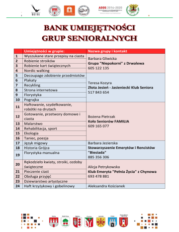 1 2 3 4 5 6 7 8 9 10 11 12 13 14 15 16 17 18 19 20 21 22 23 24 Umiejętności w grupie: Wyszukane stare przepisy na ciasta Robienie stroików Robienie kart świątecznych Nordic walking Decoupage zdobienie przedmiotów Plakaty Recykling Strona internetowa Florystyka Pograjka Haftowanie, szydełkowanie, robótki na drutach Gotowanie, przetwory domowe i ciasta Malarstwo Rehabilitacja, sport Ekologia Taniec, poezja Język migowy Historia Grójca Florystyka manualna Rękodzieło kwiaty, stroiki, ozdoby świąteczne Pieczenie ciast Obsługa przyjęć Dziewiarstwo artystyczne Haft krzyżykowy i gobelinowy Nazwa grupy i kontakt Barbara Gliwicka Grupa "Niepokorni" z Drwalewa 605 122 135 Teresa Kozyra Złota Jesień - Jasieniecki Klub Seniora 517 843 654 Bożena Pietrzak Koło Seniorów FAMILIA 609 165 077 Barbara Jezierska Stowarzyszenie Emerytów i Rencistów "Biesiada" 885 356 306 Alicja Petrykowska Klub Emeryta "Pełnia Życia" z Chynowa 693 478 881 Aleksandra Kościanek 25 26 27 28 29 30 31 32 33 34 35 36 37 38 39 40 41 42 43 44 45 46 47 48 49 50 51 Gotowanie starych potraw Pisanie pisanek woskiem Pieczenie i dekorowanie tortów Florystyka Pisanki Szydełkowanie Haft richelie Nalewki Haft Śpiew z muzykiem Ozdoby Świąteczne Rozpoznawanie i zbieranie ziół Robienie stroików Bożonarodzeniowych i bombek Rozpoznawanie i zbieranie grzybów Pieczenie ciast Nalewki z różnych owoców Kwiaty z krepiny Wicie wianków z liści, kłosów, kwiatów Kulinaria: pączki z ziemniaków, zupy kremy, kotlety z kapusty, torty bezowe, dżemy owocowe, warzywne Mikstury z ziół: maść nagietkowa, maść z żywokostu, olej dziurawcowy Chodzenie z kijkami Kulinaria: wypieki, przetwory Nalewki Robienie ozdób świątecznych Nordic walking Pisanie pism Pieczenie ciast Grupa Seniora "Aktywne Piaseczno" 782 692 002 Krystyna Pączek, Grażyna Jagiełło Uniwersytet Trzeciego Wieku w Warce (48) 667 26 25, 500 230 717 Klub Złotego Wieku w Warce (48) 667 13 78 Jadwiga Jakubowska Zofia Szymaniak Michałowskie Poziomki 504 740 231 Zofia Duch Grupa Seniora SPA - Seniorzy Preferują Aktywność Bończa (48) 667 14 33 Krystyna Barszcz Grupa Seniora „Złota Reneta” 880 603 802 Małgorzata Stańczyk Grupa „Krobowianka” 697 213 522 52 53 54 55 Doradztwo pielęgniarskie Kulinaria - przygotowanie przyjęć i doradztwo jak zrobić Porady pedagogiczne- dla dziadków jak postępować z wnukami w tym zajęcia plastyczne Tradycyjne, zielarskie wykorzystanie ziół i inne sposoby naturalne Joanna Sadowska Klub Seniora „Relaks” w Belsku Dużym 601 054 147
