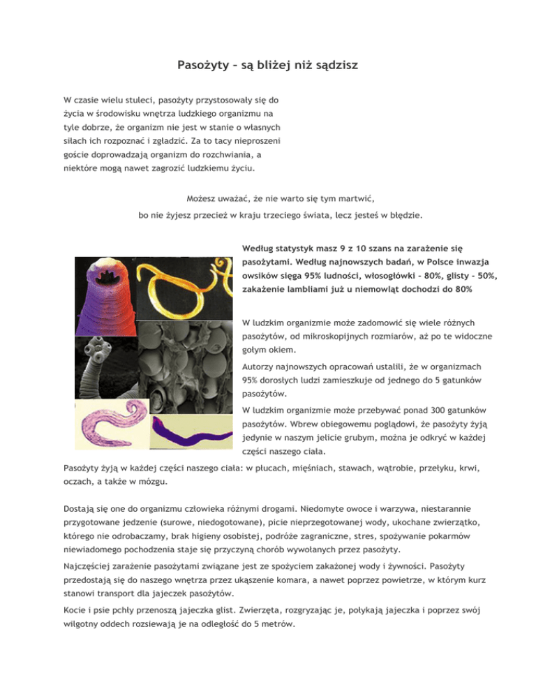 Pasożyty – są bliżej niż sądzisz W czasie wielu stuleci, pasożyty przystosowały się do życia w środowisku wnętrza ludzkiego organizmu na tyle dobrze, że organizm nie jest w stanie o własnych siłach ich rozpoznać i zgładzić. Za to tacy nieproszeni goście doprowadzają organizm do rozchwiania, a niektóre mogą nawet zagrozić ludzkiemu życiu. Możesz uważać, że nie warto się tym martwić, bo nie żyjesz przecież w kraju trzeciego świata, lecz jesteś w błędzie. Według statystyk masz 9 z 10 szans na zarażenie się pasożytami. Według najnowszych badań, w Polsce inwazja owsików sięga 95% ludności, włosogłówki - 80%, glisty - 50%, zakażenie lambliami już u niemowląt dochodzi do 80% W ludzkim organizmie może zadomowić się wiele różnych pasożytów, od mikroskopijnych rozmiarów, aż po te widoczne gołym okiem. Autorzy najnowszych opracowań ustalili, że w organizmach 95% dorosłych ludzi zamieszkuje od jednego do 5 gatunków pasożytów. W ludzkim organizmie może przebywać ponad 300 gatunków pasożytów. Wbrew obiegowemu poglądowi, że pasożyty żyją jedynie w naszym jelicie grubym, można je odkryć w każdej części naszego ciała. Pasożyty żyją w każdej części naszego ciała: w płucach, mięśniach, stawach, wątrobie, przełyku, krwi, oczach, a także w mózgu. Dostają się one do organizmu człowieka różnymi drogami. Niedomyte owoce i warzywa, niestarannie przygotowane jedzenie (surowe, niedogotowane), picie nieprzegotowanej wody, ukochane zwierzątko, którego nie odrobaczamy, brak higieny osobistej, podróże zagraniczne, stres, spożywanie pokarmów niewiadomego pochodzenia staje się przyczyną chorób wywołanych przez pasożyty. Najczęściej zarażenie pasożytami związane jest ze spożyciem zakażonej wody i żywności. Pasożyty przedostają się do naszego wnętrza przez ukąszenie komara, a nawet poprzez powietrze, w którym kurz stanowi transport dla jajeczek pasożytów. Kocie i psie pchły przenoszą jajeczka glist. Zwierzęta, rozgryzając je, połykają jajeczka i poprzez swój wilgotny oddech rozsiewają je na odległość do 5 metrów. Często zarażenie ma miejsce podczas kąpieli w zbiornikach słodkowodnych. Coraz częstsze są również zarażenia noworodków jeszcze w łonie matki. Jajeczka owsików zachowują żywotność do 6 miesięcy i przez bieliznę osobistą, pościel, maskotki i ręce dostają się do ust dzieci. Jajeczka glist trafiają do nas przez źle umyte truskawki, pietruszkę, koperek, jabłka, winogrona, gruszki, śliwki itp. Szaszłyki lub domowa słonina to 95% gwarancja zarażenia włośnicą. Solona i suszona ryba oraz kawior są przyczyną zarażenia tasiemcem, który osiąga długość 14 metrów i który może przeżyć w Waszych organizmach do 25 lat. Zarazić można się przez brudne ręce i to nie tylko swoje, ale i sprzedawców, kucharzy, kelnerów… Jajeczka pasożytów podróżują na pieniądzach i poręczach środków transportu publicznego. Wysokie stężenie pasożytów obserwuje się w takich produktach żywnościowych jak bekon, wędzona kiełbasa, szynka, parówki, wieprzowina w każdej formie, wołowina, baranina, drób. Również jaja kurze są często nimi zarażone. Epidemiolodzy całego świata próbują walczyć z tym zagrożeniem. W USA na przykład w tym celu podczas testu na okoliczność pasożytów niszczy się jedną tuszę wieprzową na tysiąc. Prowadzi to do wielomilionowych strat, ale jest to konieczne. Nie ma całkowicie pewnych metod likwidacji zarażenia w mięsie, a zwykła obróbka kuchenna nie zabija larw pasożytów. Nie jesteście w stanie zapewnić sobie bezpiecznego pożywienia gotując lub smażąc mięso. I tak ogromna ilość larw przenika do waszego organizmu. Pozostaje nam jedynie polegać na odporności. Istnieją szczególne relacje między organizmem gospodarza a pasożytem. Gospodarz niezbędny jest pasożytowi do przeżycia, a pasożyt potrzebny jest gospodarzowi, aby podtrzymać jego siły obronne. I jest to naturalny rytm życia. Nienaturalnym staje się on tylko wówczas, kiedy zostaje zakłócona równowaga między odpornością a pasożytami. W takim przypadku powstaje choroba pasożytnicza. Coraz więcej jest przypadków zachorowań na choroby pasożytnicze wśród naszych najmłodszych jak alarmują lekarze gabinetów specjalistycznych. Praktycznie wszystkie pasożyty lubią witaminy, mikroelementy, a szczególnie żelazo, hormony, białko, bogato – węglowodanowe produkty, cukier. One zjadają to wszystko i wydzielają toksyny, połykają erytrocyty, osłabiają układ immunologiczny, ale to jeszcze nie wszystko – osiągając określone stadium rozwojowe po prostu blokują układ obronny, niszcząc tym samym tkanki. Narządy wewnętrzne nie mogą wtedy normalnie pracować, tworzy się „błędne koło”: pasożyty obniżają odporność, a to doprowadza do nasilonego rozmnażania pasożytów, wskutek czego aktywują się i zaczynają intensywnie się rozmnażać. Na przykład samica przywry może złożyć jednorazowo od 20 do 25 tysięcy jajeczek. A glista może wyrosnąć do długości 45 cm i złożyć 245 tysięcy jajeczek w ciągu doby. Najdłuższym pasożytem można zarazić się spożywając rybę. Dorosły tasiemiec rybi może urosnąć do 15 m długości i złożyć jednorazowo do 100 tysięcy jajeczek. Jeden osobnik tasiemca nieuzbrojonego może w ciągu doby złożyć do 4 milionów 900 tysięcy jajeczek. A w ciągu roku do 440 milionów. Najgorsze jest to, że pasożyty mogą zamieszkiwać Was przez lata a nawet dziesiątki lat w żaden sposób nie dając o sobie znać. Obecność tych stworzeń w swoim organizmie poczujecie dopiero wówczas, gdy będzie ich już bardzo dużo. Najczęściej obecność pasożytów określano za pomocą badania kału. Stosując tę metodę można odkryć obecność pasożytów jedynie w przypadku, jeśli laborant zauważy jajeczka pod mikroskopem. Jednak należy wzią