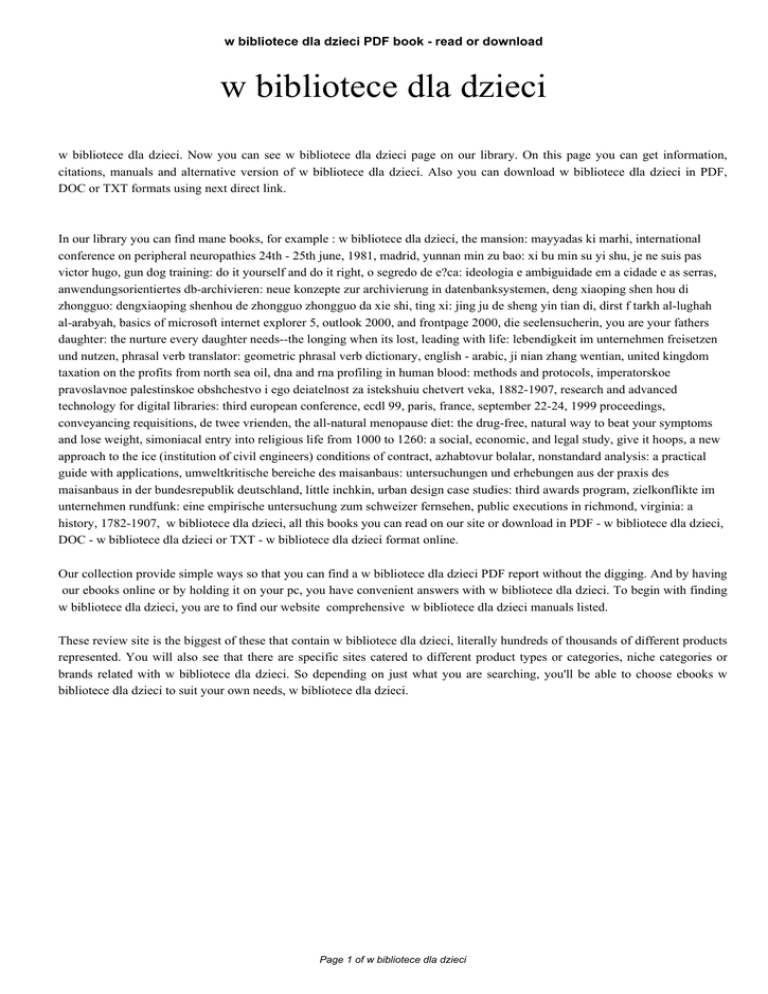 w bibliotece dla dzieci PDF book - read or download w bibliotece dla dzieci w bibliotece dla dzieci. Now you can see w bibliotece dla dzieci page on our library. On this page you can get information, citations, manuals and alternative version of w bibliotece dla dzieci. Also you can download w bibliotece dla dzieci in PDF, DOC or TXT formats using next direct link. In our library you can find mane books, for example : w bibliotece dla dzieci, the mansion: mayyadas ki marhi, international conference on peripheral neuropathies 24th - 25th june, 1981, madrid, yunnan min zu bao: xi bu min su yi shu, je ne suis pas victor hugo, gun dog training: do it yourself and do it right, o segredo de e?ca: ideologia e ambiguidade em a cidade e as serras, anwendungsorientiertes db-archivieren: neue konzepte zur archivierung in datenbanksystemen, deng xiaoping shen hou di zhongguo: dengxiaoping shenhou de zhongguo zhongguo da xie shi, ting xi: jing ju de sheng yin tian di, dirst f tarkh al-lughah al-arabyah, basics of microsoft internet explorer 5, outlook 2000, and frontpage 2000, die seelensucherin, you are your fathers daughter: the nurture every daughter needs--the longing when its lost, leading with life: lebendigkeit im unternehmen freisetzen und nutzen, phrasal verb translator: geometric phrasal verb dictionary, english - arabic, ji nian zhang wentian, united kingdom taxation on the profits from north sea oil, dna and rna profiling in human blood: methods and protocols, imperatorskoe pravoslavnoe palestinskoe obshchestvo i ego deiatelnost za istekshuiu chetvert veka, 1882-1907, research and advanced technology for digital libraries: third european conference, ecdl 99, paris, france, september 22-24, 1999 proceedings, conveyancing requisitions, de twee vrienden, the all-natural menopause diet: the drug-free, natural way to beat your symptoms and lose weight, simoniacal entry into religious life from 1000 to 1260: a social, economic, and legal study, give it hoops, a new approach to the ice (institution of civil engineers) conditions of contract, azhabtovur bolalar, nonstandard analysis: a practical guide with applications, umweltkritische bereiche des maisanbaus: untersuchungen und erhebungen aus der praxis des maisanbaus in der bundesrepublik deutschland, little inchkin, urban design case studies: third awards program, zielkonflikte im unternehmen rundfunk: eine empirische untersuchung zum schweizer fernsehen, public executions in richmond, virginia: a history, 1782-1907, w bibliotece dla dzieci, all this books you can read on our site or download in PDF - w bibliotece dla dzieci, DOC - w bibliotece dla dzieci or TXT - w bibliotece dla dzieci format online. Our collection provide simple ways so that you can find a w bibliotece dla dzieci PDF report without the digging. And by having our ebooks online or by holding it on your pc, you have convenient answers with w bibliotece dla dzieci. To begin with finding w bibliotece dla dzieci, you are to find our website comprehensive w bibliotece dla dzieci manuals listed. These review site is the biggest of these that contain w bibliotece dla dzieci, literally hundreds of thousands of different products represented. You will also see that there are specific sites catered to different product types or categories, niche categories or brands related with w bibliotece dla dzieci. So depending on just what you are searching, you'll be able to choose ebooks w bibliotece dla dzieci to suit your own needs, w bibliotece dla dzieci. Page 1 of w bibliotece dla dzieci