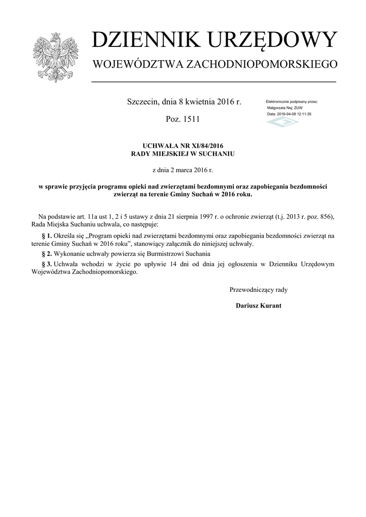 DZIENNIK URZĘDOWY WOJEWÓDZTWA ZACHODNIOPOMORSKIEGO Szczecin, dnia 8 kwietnia 2016 r. Elektronicznie podpisany przez: Małgorzata Nej; ZUW Data: 2016-04-08 12:11:35 Poz. 1511 UCHWAŁA NR XI/84/2016 RADY MIEJSKIEJ W SUCHANIU z dnia 2 marca 2016 r. w sprawie przyjęcia programu opieki nad zwierzętami bezdomnymi oraz zapobiegania bezdomności zwierząt na terenie Gminy Suchań w 2016 roku. Na podstawie art. 11a ust 1, 2 i 5 ustawy z dnia 21 sierpnia 1997 r. o ochronie zwierząt (t.j. 2013 r. poz. 856), Rada Miejska Suchaniu uchwala, co następuje: § 1. Określa się „Program opieki nad zwierzętami bezdomnymi oraz zapobiegania bezdomności zwierząt na terenie Gminy Suchań w 2016 roku”, stanowiący załącznik do niniejszej uchwały. § 2. Wykonanie uchwały powierza się Burmistrzowi Suchania § 3. Uchwała wchodzi w życie po upływie 14 dni od dnia jej ogłoszenia w Dzienniku Urzędowym Województwa Zachodniopomorskiego. Przewodniczący rady Dariusz Kurant Dziennik Urzędowy Województwa Zachodniopomorskiego –2– Poz. 1511 Załącznik do uchwały Nr XI/84/2016 Rady Miejskiej w Suchaniu z dnia 2 marca 2016 r. Program opieki nad zwierzętami bezdomnymi oraz zapobiegania bezdomności zwierząt na terenie Gminy Suchań w 2016 roku Rozdział 1 POSTANOWIENIA OGÓLNE § 1. Program opieki nad zwierzętami bezdomnymi oraz zapobiegania bezdomności zwierząt na terenie Gminy Suchań w 2016 roku ma zastosowanie do wszystkich zwierząt domowych, w szczególności psów i kotów, w tym kotów wolno żyjących, oraz zwierząt gospodarskich przebywających na terenie Gminy Suchań. § 2. Ilekroć w programie jest mowa o: 1) programie, należy przez to rozumieć Program opieki nad zwierzętami bezdomnymi oraz zapobiegania bezdomności zwierząt na terenie Gminy Suchań w 2016 r. 2) schronisku dla zwierząt, należy przez to rozumieć miejsce przeznaczone do opieki nad zwierzętami domowymi spełniające warunki określone w ustawie z dnia 11 marca 2004 r. o ochronie zwierząt oraz zwalczaniu chorób zakaźnych zwierząt (Dz. U. z 2014 r., poz. 1539). § 3. Celem Programu jest: 1) zapewnienie opieki nad zwierzętami bezdomnymi na terenu Gminy Suchań, w tym ich odławianie oraz poszukiwanie nowych właścicieli, 2) ograniczenie populacji bezdomnych zwierząt przez sterylizację i kastrację zwierząt domowych, w szczególności psów i kotów oraz usypianie ślepych miotów, 3) poprawienie bezpieczeństwa i porządku publicznego. § 4. Wykonawcami Programu są: 1) Burmistrz Suchania, 2) podmiot gospodarczy świadczący usługi polegające na odławianiu i transporcie bezdomnych zwierząt, 3) organizacje pozarządowe, których statutowym celem jest przeciwdziałanie bezdomności zwierząt, w sposób nie stwarzający zagrożenie dla zdrowia i życia zwierząt oraz nie zadający im cierpienia. § 5. Koordynatorem działań podejmowanych w ramach Programu jest pracownik zatrudniany na stanowisku d/s ochrony środowiska u Urzędzie Miejskim w Suchaniu, który współpracuje w tym zakresie również z organami Inspekcji Weterynaryjnej, Policją oraz Strażą Miejską. Rozdział 2 REALIZACJA ZADAŃ ZAPEWNIENIE BEZDOMNYM ZWIERZĘTOM MIEJSCA W SCHRONISKU DLA ZWIERZĄT § 6. Zapewnienie opieki nad bezdomnymi zwierzętami z terenu Gminy Suchań jest realizowane przez: 1) zgłoszenie bezdomnych zwierząt do odławiania i umieszczenia w Schronisku dla bezdomnych zwierząt w Choszcznie, ul. Dąbrowszczaków, 73-200 Choszczno prowadzonym przez firmę VET-ZOO SERWIS lek. wet. Zenon Jażdżewski z siedzibą przy ul. M. Konopnickiej 62 64-980 Trzcianka, 2) poszukiwanie nowych właścicieli dla bezdomnych zwierząt, 3) podanie do publicznej wiadomości adresu i numeru telefonu, pod którym można zgłaszać konieczność odłowienia bezdomnego zwierzęcia. OPIEKA NAD WOLNO ŻYJĄCYMI KOTAMI § 7. Opieka nad wolno żyjącymi kotami jest realizowana przez: 1) przyjmowanie zgłoszeń o miejscu pobytu dużej ilości tychże zwierząt, 2) pomoc zainteresowanym opiekunom w dokarmianiu zwierząt, Dziennik Urzędowy Województwa Zachodniopomorskiego –3– Poz. 1511 3) finansowanie sterylizacji bezpańskich kotów, w najbliższych dla miejsca występowania zwierząt gabinetach weterynaryjnych, na podstawie jednorazowych zleceń (lista gabinetów weterynaryjnych jest dostępna na stronie www.suchan.pl). ODŁAWIANIE BEZDOMNYCH ZWIERZĄT § 8. Odławianie bezdomnych zwierząt ma charakter stały i odbywa się na zgłoszeń. W pierwszej kolejności odławiane są zwierzęta agresywne. podstawie otrzymanych § 9. Odławianie i odbiór bezdomnych zwierząt jest prowadzone przez uprawniony podmiot tj. VET-ZOO SERWIS lek. wet. Zenon Jażdżewski z siedzibą przy ul. M. Konopnickiej 62 64-980 Trzcianka, przy użyciu specjalistycznego sprzętu przeznaczonego do wyłapywania zwierząt, który nie stwarza zagrożenia dla życia i zdrowia zwierząt, a także nie zadaję im cierpienia. § 10. Transport bezdomnych zwierząt odbywa się środkiem transportu przystosowanym do bezpiecznego i humanitarnego przewozu zwierząt zgodnie z wymaganiami określonymi w odrębnych przepisach. OBLIGATORYJNA STERYLIZACJA ALBO KASTRACJA ZWIERZĄT W SCHRONISKU DLA ZWIERZĄT § 11. Bezdomne zwierzęta odłowione z terenu Gminy Suchań podlegają obowiązkowej sterylizacji albo kastracji wyłącznie przez lekarzy weterynarii. POSZUKIWANIE WŁAŚCICIELI DLA BEZDOMNYCH ZWIERZĄT § 12. Poszukiwanie właścicieli dla bezdomnych zwierząt odbywa się poprzez: 1) schronisko do którego trafią zwierzęta z terenu Gminy Suchań, 2) aktywne poszukiwanie nowych właścicieli dla bezdomnych zwierząt przez Gminę za pośrednictwem strony internetowej www.suchań.pl. USYPIANIE ŚLEPYCH MIOTÓW § 13. Usypianie ślepych miotów wykonuje wyłącznie uprawniony lekarz weterynarii, najbliższy dla miejsca występowania zwierząt (lista gabinetów weterynaryjnych jest dostępna na stronie www.suchan.pl). Zwłoki uśpionych zwierząt muszą być odebrane przez podmiot
