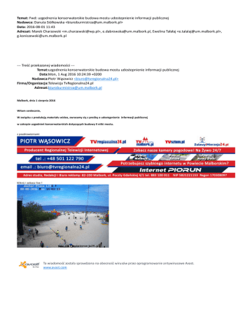 Temat: Fwd: uzgodnenia konserwatorskie budowa mostu udostepnienie informacji publicznej Nadawca: Danuta Siółkowska <[email protected]> Data: 2016-08-01 11:43 Adresat: Marek Charzewski <[email protected]>, [email protected], Ewelina Tałałaj <[email protected]>, [email protected] --- Treść przekazanej wiadomości --Temat:uzgodnenia konserwatorskie budowa mostu udostepnienie informacji publicznej Data:Mon, 1 Aug 2016 10:24:39 +0200 Nadawca:Piotr Wąsowicz <[email protected]> Firma/Organizacja:Telewizja TvRegionalna24.pl Adresat:[email protected] Malbork, dnia 1 sierpnia 2016 Witam serdecznie, W związku z produkcją materiału wideo, zwracamy się z prośbą o udostępnienie informacji publicznej w zakręcie uzgodnień konserwatorskich dotyczących budowy II nitki mostu. z pozdrowieniami kliknij i zobacz live ! Ta wiadomość została sprawdzona na obecność wirusów przez oprogramowanie antywirusowe Avast. www.avast.com