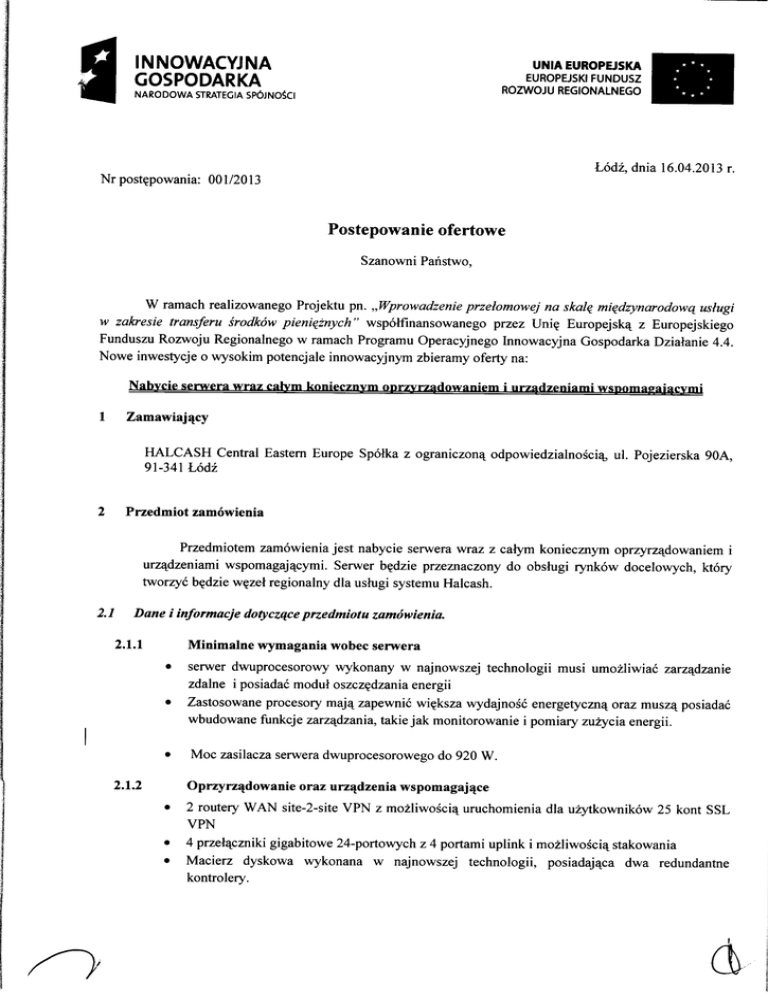 Oświadczenie 1 do Zapytania Ofertowego nr 001/2013 1. ZAMAWIAJĄCY: 2. ORGANIZATOR / KOORDYNATOR POSTĘPOWANIA HALCASH Central Eastern Europe Spółka z ograniczoną odpowiedzialnością ul. Pojezierska 90a, Łódź 91-341 Manuela Frischke e-mail: [email protected] 3. Dane firmy uczestniczącej w postępowaniu ofertowym nazwa (pełna) ulica nr domu/lokalu kod pocztowy miejscowość województwo NIP REGON nr rejestrowy organizacji oraz organ rejestrowy telefon fax. e-mail adres strony WWW Oświadczenie W związku z udziałem naszej firmy w postępowaniu ofertowym nr 001/2013 oświadczamy, że firma nasza spełnia niżej wymienione warunki : 1. posiadam uprawnienia do wykonywania działalności lub czynności objętych przedmiotem zamówienia, jeżeli przepisy nakładają obowiązek posiadania takich uprawnień, 2. posiadam niezbędną wiedzę i doświadczenie w wykonywaniu podobnych prac: 3. dysponuję potencjałem technicznym i osobami zdolnymi do wykonania przedmiotu zamówienia; 4. znajduję się w sytuacji ekonomicznej i finansowej zapewniającej wykonanie przedmiotu zamówienia; 5. posiadam dokumenty potwierdzające, że producent dostarczanego sprzętu stosuje standardy normy ISO 14001 .................................................................. DATA i PODPIS Załącznik nr 2 do Zapytania Ofertowego nr 001/2013 ..................................................... miejscowość, data 1. Dane o firmie 1. ZAMAWIAJĄCY: 2. ORGANIZATOR / KOORDYNATOR POSTĘPOWANIA HALCASH Central Eastern Europe Spółka z ograniczoną odpowiedzialnością ul. Pojezierska 90a, Łódź 91-341 Manuela Frischke e-mail: [email protected] 3. Dane firmy uczestniczącej w postępowaniu ofertowym nazwa (pełna) ulica nr domu/lokalu kod pocztowy miejscowość województwo NIP REGON nr rejestrowy organizacji oraz organ rejestrowy telefon fax. e-mail adres strony WWW 2. Kryteria wyboru Kryterium nr I – Cena: Lp. Cena Iloś jedn. PLN ć lub EUR (netto) kpl 1 Opis J. m 1 Wartość PLN lub EUR (netto) Wartość PLN lub EUR (brutto) RAZEM OGÓŁEM Z poważaniem Załącznik 3 do zapytania ofertowego nr 001/2013 Opis szczegółowy przedmiotu zamówienia 1. Opis serwera Serwer ilość: 1 szt. Nazwa producenta i model: …………………………………………………………………………...… Cena jednostkowa netto: …………………………………………………………………………… Cena jednostkowa brutto: …………………………………………………………………………… Lp . Parametr lub warunek Opis wymagań minimalnych 1. Obudowa Serwer w obudowie o wysokości maksymalnie 1U, obudowa dedykowana do instalacji w standardowej szafie typu RACK 19”, wszystkie niezbędne fronty, szyny do montażu w szafie RACK. 2. Płyta główna Płyta główna z możliwością zainstalowania dwóch procesorów przynajmniej czterordzeniowych. 3. Procesor Procesor przynajmniej czterordzeniowy zgodny z x86, o wydajności ocenionej na co najmniej 4300 punktów według wyników opublikowanych na stronie: http://www.cpubenchmark.net/ (dot. tylko wydajności procesora bez względu na testowaną konfiguracje komputera). 4. Liczba procesorów 2 5. Pamięć operacyjna Minimum 44 GB DDR3 1333 MHz z technologią Advanced ECC lub równoważną, Memory Mirror. Różnice / Deklaracja Uwagi / zgodności z Oferowany obligatoryjnym sprzęt/param i etry wyższe wymaganiami minimalnymi UWAGA: (TAK / NIE / Należy WYŻSZE) wypełnić Dysk twardy 2 x dysk 300 GB Typu SAS hot plug, = 2,5”; 10 000 obr./min. Kontroler Kontroler macierzowy SAS umożliwiający konfigurację dysków w macierzach RAID 0, 1, 1+0, 9. Karta sieciowa Cztery zintegrowane karty sieciowe Gbit Ethernet 10/100/1000 Mb/s z funkcją Wake-On-LAN, wspierające load balancing, failover, TCP/IP Offload Engine, RJ45. 10. Karta graficzna Zintegrowana karta graficzna z interfejsem VGA. 6. 7. Zintegrowane z przodu obudowy: Min. 2 x USB 2.0, 1x VGA Zintegrowane z tyłu obudowy: 11. Porty Min. 4 x USB 2.0, 1 x VGA, 1 x COM (RS-232) Min. 4 x RJ45 (10/100/1000 Mb/s), 1 x RJ45 (10/100 Mb/s – do obsługi karty zdalnego zarządzania). 12. Zasilacz 2 zasilacze, redundantne, hot-plug, każdy do maksymalnej mocy 600W. 13. Diagnostyka Panel LCD lub składający się z diod LED umieszczony na froncie obudowy, umożliwiający wyświetlenie informacji o stanie procesora, pamięci, dysków, zasilaniu oraz temperaturze. 14. Zarządzanie Moduł zarządzający niezależny od zainstalowanego na serwerze systemu operacyjnego i umożliwiający: zdalny dostęp do graficznego interfejsu Web karty zarządzającej, zdalne monitorowanie i informowanie o statusie serwera, szyfrowane połączenie oraz autentykację i autoryzację użytkownika; SNMP; Telnet, SSH. Dołączone nośniki z oprogramowaniem dla celów serwisowych i diagnostycznych wraz z instrukcją podstawowych czynności podczas instalacji i konfiguracji w języku polskim lub angielskim. System zarządzania energią Oprogramowa 15. nie Wymagane 16. systemy operacyjne 17. 18. Wymagane normy Pozostałe wymagania Oprogramowanie diagnostyczne dostarczane przez producenta serwera, umożliwiające administrowanie systemem oraz współpracę ze zdalnym systemem diagnozowania, Windows Server Datacenter - obejmująca system operacyjny na serwerach: 2x aplikacja, 2x baza danych produkcyjna, 2x kontroler AD, 1x aplikacja testowa, 1x aplikacja developerska, 1x baza testowa, 1x baza developerska. a) Poprawna praca systemu operacyjnego wskazanego w pkt. 16) na oferowanym modelu serwera - (oświadczenie Wykonawcy lub np. Certyfikat zgodności z systemami operacyjnymi Windows Server 2008 oraz Windows Server 2012 w zakresie oświadczenia Wykonawcy -wystarczającym jest wypełnienie pola w kolumnie obok, poprzez np. „tak”, „spełnia”), a) Gwarancja 36 miesięcy, z gwarantowanym czasem naprawy 24h, b) Naprawa w miejscu instalacji. c) Wszystkie niezbędne kable kat.6, wyposażenie do prawidłowej instalacji i 
