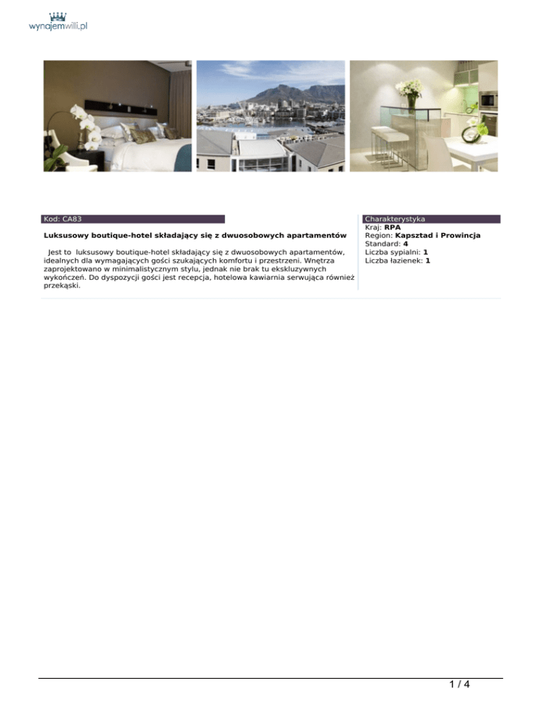 Kod: CA83 Luksusowy boutique-hotel składający się z dwuosobowych apartamentów Jest to luksusowy boutique-hotel składający się z dwuosobowych apartamentów, idealnych dla wymagających gości szukających komfortu i przestrzeni. Wnętrza zaprojektowano w minimalistycznym stylu, jednak nie brak tu ekskluzywnych wykończeń. Do dyspozycji gości jest recepcja, hotelowa kawiarnia serwująca również przekąski. Charakterystyka Kraj: RPA Region: Kapsztad i Prowincja Standard: 4 Liczba sypialni: 1 Liczba łazienek: 1 1/4 Zakwaterowanie: Hotel oferuje trzy rodzaje apartamentów, wszystkie są bardzo stylowe i zarazem nowoczesne, luksusowo wyposażone i komfortowe. Apartamenty składają się z sypialni, łazienki, balkonu oraz salonu z aneksem kuchennym. W łazienkach znajdują się prysznice oraz ekskluzywne wanny, apartamenty są klimatyzowane. Podłogi wyłożono drewnem, a wszystkie meble zostały zrobione na zamówienie. Wyposażenie: Klimatyzacja, Internet bezprzewodowy, telewizor plazmowy, kuchenka mikrofalowa, płyta kuchenna, parking, ochrona. Lokalizacja: Sea Point, Cape Town. Dodatkowe usługi: Apartamenty są codziennie sprzątane. Do dyspozycji gości jest hotelowa recepcja, a na życzenie istnieje możliwość zorganizowania transferów z i na lotnisko. Cena za tydzień wynajmu: Na zapytanie. 2/4 3/4 4/4 Powered by TCPDF (www.tcpdf.org)