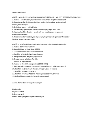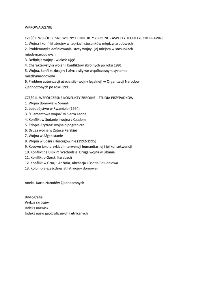 WPROWADZENIE CZĘŚĆ I. WSPÓŁCZESNE WOJNY I KONFLIKTY ZBROJNE - ASPEKTY TEORETYCZNOPRAWNE 1. Wojna i konflikt zbrojny w teoriach stosunków międzynarodowych 2. Problematyka definiowania istoty wojny i jej miejsca w stosunkach międzynarodowych 3. Definicje wojny - wielość ujęć 4. Charakterystyka wojen i konfliktów zbrojnych po roku 1991 5. Wojna, konflikt zbrojny i użycie siły we współczesnym systemie międzynarodowym 6. Problem autoryzacji użycia siły (wojny legalnej) w Organizacji Narodów Zjednoczonych po roku 1991 CZĘŚĆ II. WSPÓŁCZESNE KONFLIKTY ZBROJNE - STUDIA PRZYPADKÓW 1. Wojna domowa w Somalii 2. Ludobójstwo w Rwandzie (1994) 3. "Diamentowa wojna" w Sierra Leone 4. Konflikt w Sudanie i wojna z Czadem 5. Etiopia-Erytrea: wojna o pogranicze 6. Druga wojna w Zatoce Perskiej 7. Wojna w Afganistanie 8. Wojna w Bośni i Hercegowinie (1992-1995) 9. Kosowo jako przykład interwencji humanitarnej i jej konsekwencji 10. Konflikt na Bliskim Wschodzie. Druga wojna w Libanie 11. Konflikt o Górski Karabach 12. Konflikt w Gruzji: Adżaria, Abchazja i Osetia Południowa 13. Kolumbia-sześćdziesiąt lat wojny domowej Aneks. Karta Narodów Zjednoczonych Bibliografia Wykaz skrótów Indeks nazwisk Indeks nazw geograficznych i etnicznych