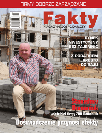 FIRMY DOBRZE ZARZĄDZANE NR INDEKSU 344583 Cena 4.20 zł (w tym 8% VAT) Nr 5 (83) Wrzesień/Październik 2016 RYNEK INWESTYCYJNY BEZ TAJEMNIC str. 68 Z PODATKIEM PROSTO DO RAJU str. 70 Stanisław Romaniuk właściciel firmy ZRB Romaniuk Doświadczenie przynosi efekty str. 74 Kopalnia Wapienia „Morawica” SA ul. Górnicza 42, 26-026 Morawica Sekretariat: tel. 41 36 70 211, fax 41 36 70 299 Dział Handlowy: tel. 41 36 70 222, 223, 227, 228 [email protected], www.kwmorawica.pl Producent: • kruszyw dla budownictwa, drogownictwa, • kamienia przemysłowego dla hutnictwa, cukrowni, energetyki, • wyrobów marmurowych, • nawozów rolniczych. Spis treści FAKTY, LUDZIE, OPINIE 4 DIAGNOZY – PROGNOZY 56 PATRONAT 8 ECHA POLSKIE 58 FORUM PRZEDSIĘBIORCÓW 60 PRAWO 62 Bursztynnictwo do zatopienia Nawet 400 tys. zł kary za nielegalne wydobycie bursztynu i prawie 80-krotny wzrost opłaty eksploatacyjnej za kilogram wydobytego surowca. Jak podaje portal Money.pl, takie zmiany przewiduje nowelizacja Prawa geologicznego i górniczego, przygotowywana właśnie w Ministerstwie Środowiska. DOLNOŚLĄSKIE ORŁY EKSPORTU 9 NAJLEPSZE BANKI 2016 10 FORUM EKONOMICZNE 12 TARGI „CONCOURS LÉPINE” 14 NAUKA I BIZNES 16 SPOSÓB NA SUKCES 18 ENERGETYKA 22 TARGI PLASTPOL 24 TERAZ POLSKA 26 FIRMA DOBRZE ZARZĄDZANA 28 Dobre zarządzanie kluczem do sukcesu 17 czerwca br. w warszawskim Teatrze Sabat odbyło się przyznanie wyróżnień w konkursie Firma Dobrze Zarządzana, organizowanym przez redakcję Magazynu Gospodarczego Fakty. Nagrodzono 28 podmiotów gospodarczych i instytucji. Pozbawić wspólnika udziałów Nierzadko nieporozumienia w spółkach uniemożliwiają wspólnikom współdziałanie i realizowanie długofalowej polityki na rzecz spółki. GOSPODARKA 66 BUDOWNICTWO 72 NIERUCHOMOŚCI 76 Inwestycja w wynajem Czy zdaniem deweloperów liczba osób inwestujących w mieszkania na wynajem rośnie? Czy zdarzają się zakupy pakietowe? Czy chęć kupna powstających mieszkań zgłaszają klienci instytucjonalni? Fot. JW CONSTRUCTION MODERNIZACJA ROKU 79 BUDOWA ROKU 2015 82 POLSKA SAMORZĄDOWA 84 MOTORYZACJA 89 SAMORZĄD DOBRZE ZARZĄDZANY 48 PLACÓWKA MEDYCZNA DOBRZE ZARZĄDZANA 50 Ruch zdominują… latające auta Chce je sprzedawać już kilka firm w Europie i USA – udane prototypy już istnieją. Wydaje się, że świat stoi u progu prawdziwej rewolucji w transporcie. BIZNES 52 NOWE TECHNOLOGIE 94 ZNAKI OSTRZEGAWCZE 54 TARGI 96 www.magazynfakty.pl codzienna porcja nowych informacji Agnieszka Żądło (sekretarz redakcji) e-mail: [email protected] 01-496 Warszawa ul. Korfantego 75 tel. 22 832 42 51, 22 832 42 53 22 832 42 54, fax 22 832 24 99 e-mail: [email protected] www.magazynfakty.pl Jerzy Bojanowicz, Piotr Danilczuk, Cezary Głogowski, Elżbieta Łagowska, Piotr Nowacki, Tomasz Rekowski, Agnieszka Rowicka, Czesław Rychlewski, Magdalena Szczygielska, Michał Tabaka, Zbigniew Wawrzkowicz Redaguje kolegium Mariusz Piotr Gryżewski (redaktor naczelny) e-mail: [email protected] Adiustacja i korekta Agnieszka Żądło, Magdalena Szczygielska Dział marketingu i reklamy 01-496 Warszawa ul. Korfantego 75 tel. 22 832 42 51, 22 832 42 53, 22 832 42 54, fax 22 832 24 99 e-mail: [email protected] Projekt i skład MaxMedia (Daniel Kuciński) Prenumerata KIOSK24.PL; KOLPORTER SA; RUCH SA: Zamówienia na prenumeratę w wersji papierowej i na e-wydania można składać na stronie www.prenumerata.ruch.com.pl. Ewentualne pytania prosimy kierować na adres e-mail: [email protected] lub kontaktując się z Infolinią pod numerem: 22 693 70 00. Druk: MaxMedia Dystrybucja w Polsce EMPIK; INMEDIO Sp. z o.o.; RUCH SA Wydawca MaxMedia 01-932 Warszawa, ul. Estrady 67 NIP 118-088-54-88 Numer oddano do druku: 08.09.2016 r. Za treść ogłoszeń redakcja ponosi odpowiedzialność w granicach wskazanych w ust. 2 art. 42 ustawy Prawo prasowe. Publikowane zdjęcia i materiały są własnością redakcji oraz prezentowanych firm i instytucji. Przedruk tylko za zgodą wydawcy. Redakcja zastrzega sobie prawo do skrótów. PATRONAT MEDIALNY Fakty 3 FAKTY, LUDZIE, OPINIE Innowacyjny skok Według wskaźników najnowszego Globalnego Raportu Innowacyjności 2016 Polska wyraźnie awansowała w porównaniu do poprzedniej edycji. ziewiąta odsłona raportu „The Global Innovation Index 2016”, opublikowanego przez Uniwersytet Cornella we współpracy m.in. z World Intellectual Property Organization (WIPO) – specjalistyczną agendą ONZ, objęła 82 wskaźniki innowacyjności dla 128 gospodarek, które stanowią ok. 98 proc. światowego PKB. W dokumencie dokonano oceny krajów w ramach trzech subindeksów, tj. pod względem rezultatów innowacyjności, działań proinnowacyjnych i efektywności innowacji. Polska w tych ocenach została zestawiona na pozycjach odpowiednio: 46, 39 i 66. Nasz kraj został wyprzedzony przez 24 państwa Unii Europejskiej, za nami pojawiły się jedynie Grecja, Chorwacja i Rumunia. D Fot. KLAUS POST / FREEIMAGES.COM 1. pozycję w całym rankingu zajęła Szwajcaria, a na kolejnych miejscach uplasowały się Szwecja i Wielka Brytania. Stany Zjednoczone znalazły się na 4. miejscu. – Pod względem potencjału intelektualnego jako kraj jesteśmy w absolutnej czołówce Europy, zaraz po Niemcach i Brytyjczykach. Odpowiednie wykorzystanie możliwości w dużej mierze jest związane z wytworzeniem przyjaznego i bezpiecznego środowiska rozwoju, wspierania oraz finansowania innowacyjności. Widać, iż różnice wyników gospodarczych osiągane przez poszczególne państwa można tłumaczyć wysokością odpowiednich inwestycji w przedsięwzięcia innowacyjne – tak wyniki raportu komentował Krzysztof Szubert, ekspert BCC, minister ds. cyfryzacji w Gospodarczym Gabinecie Cieni BCC. I Rzecznicy konsumentów z nową szefową Małgorzata Rothert, miejski rzecznik konsumentów w Warszawie, została nową przewodniczącą Krajowej Rady Rzeczników Konsumentów, działającej przy prezesie Urzędu Ochrony Kon