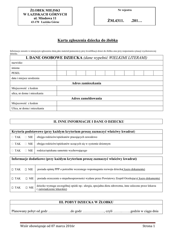 ŻŁOBEK MIEJSKI W ŁAZISKACH GÓRNYCH ul. Miodowa 11 Nr rejestru ŻM.4311. 43-170 Łaziska Górne ul. K .201… Karta zgłoszenia dziecka do żłobka Informacje zawarte w niniejszym zgłoszeniu służą jako materiał pomocniczy przy kwalifikacji dzieci do żłobka oraz przy rozpoznaniu sytuacji wychowawczej dziecka. I. DANE OSOBOWE DZIECKA (dane wypełnić WIELKIMI LITERAMI) nazwisko imiona PESEL data i miejsce urodzenia Adres zamieszkania Miejscowość z kodem ulica, nr domu i mieszkania Adres zameldowania Miejscowość z kodem Ulica, nr domu i mieszkania II. INNE INFORMACJE I DANE O DZIECKU Kryteria podstawowe (przy każdym kryterium proszę zaznaczyć właściwy kwadrat) TAK NIE obojga rodziców/opiekunów pracujących zawodowo TAK NIE obojga rodziców/opiekunów uczących się w systemie dziennym TAK NIE rodzica/opiekuna samotnie wychowującego Informacje dodatkowe (przy każdym kryterium proszę zaznaczyć właściwy kwadrat) TAK NIE posiada opinię PPP o potrzebie wczesnego wspomagania rozwoju dziecka( ksero dokumentu) TAK NIE posiada orzeczenie o niepełnosprawności wydane przez Powiatowy Zespół Orzekający( ksero dokumentu) TAK NIE dziecko wymaga szczególnej opieki np.: alergia, specjalna dieta zdrowotna, inne zalecone przez lekarza ( zaświadczenie lekarskie) III. POBYT DZIECKA W ŻŁOBKU Planowany pobyt od godz .……………….do godz ………………., czyli ……..……..godzin w ciągu dnia Wzór obowiązuje od 07 marca 2016r Strona 1 IV. DANE OSOBOWE RODZICÓW / OPIEKUNÓW PRAWNYCH Matka/opiekun prawny Ojciec/opiekun prawny Adres zamieszkania Adres zamieszkania Informacja o zatrudnieniu Informacja o zatrudnieniu Numery telefonów kontaktowych Numery telefonów kontaktowych imię nazwisko miejscowość z kodem ulica, nr domu i mieszkania zakład pracy miejscowość zakładu pracy godziny pracy zakład pracy komórka domowy V. Oświadczenia dotyczące treści zgłoszenia i ochrony danych osobowych Uprzedzeni o odpowiedzialności karnej z art. 233 k.k. oświadczamy, że podane powyżej dane są zgodne ze stanem faktycznym (za podanie nieprawdziwych danych mogą być wyciągnięte odpowiednie konsekwencje włącznie ze skreśleniem dziecka z listy żłobkowej). Zgodnie z art. 23 Ustawy z dnia 29 sierpnia 1997 r. o ochronie danych osobowych (Dz.U. z 2002 r. Nr 101, poz. 926 ze zm.) wyrażamy zgodę na zbieranie, przetwarzanie i wykorzystanie ww. danych osobowych przez Żłobek Miejski w Łaziskach Górnych dla potrzeb prowadzenia zajęć opiekuńczo- wychowawczych i edukacyjnych. Niniejsze złożenie karty zapisu nie jest równoznaczne z przyjęciem mojego dziecka do żłobka. Data i podpis matki/prawnej opiekunki Data i podpis ojca/prawnego opiekuna Przyjęcie karty zgłoszenia data wpływu Wzór obowiązuje od 07 marca 2016r podpis przyjmującego Strona 2