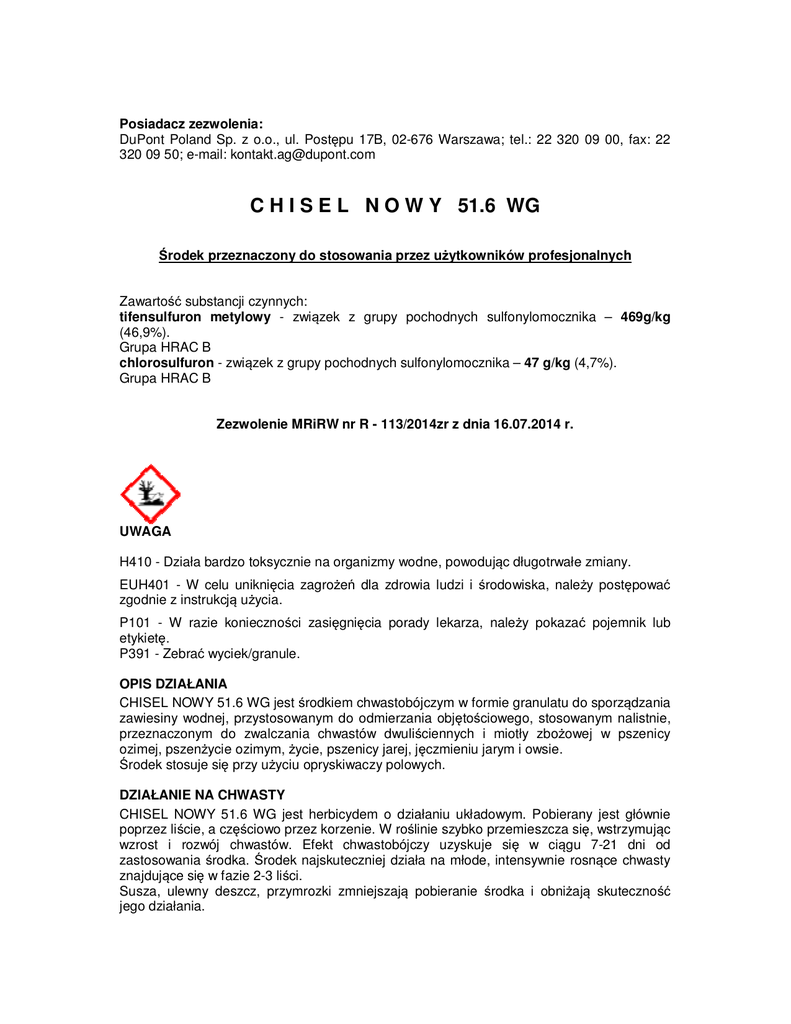 Posiadacz zezwolenia: DuPont Poland Sp. z o.o., ul. Postępu 17B, 02-676 Warszawa; tel.: 22 320 09 00, fax: 22 320 09 50; e-mail: [email protected] C H I S E L N O W Y 51.6 WG Środek przeznaczony do stosowania przez użytkowników profesjonalnych Zawartość substancji czynnych: tifensulfuron metylowy - związek z grupy pochodnych sulfonylomocznika – 469g/kg (46,9%). Grupa HRAC B chlorosulfuron - związek z grupy pochodnych sulfonylomocznika – 47 g/kg (4,7%). Grupa HRAC B Zezwolenie MRiRW nr R - 113/2014zr z dnia 16.07.2014 r. UWAGA H410 - Działa bardzo toksycznie na organizmy wodne, powodując długotrwałe zmiany. EUH401 - W celu uniknięcia zagrożeń dla zdrowia ludzi i środowiska, należy postępować zgodnie z instrukcją użycia. P101 - W razie konieczności zasięgnięcia porady lekarza, należy pokazać pojemnik lub etykietę. P391 - Zebrać wyciek/granule. OPIS DZIAŁANIA CHISEL NOWY 51.6 WG jest środkiem chwastobójczym w formie granulatu do sporządzania zawiesiny wodnej, przystosowanym do odmierzania objętościowego, stosowanym nalistnie, przeznaczonym do zwalczania chwastów dwuliściennych i miotły zbożowej w pszenicy ozimej, pszenżycie ozimym, życie, pszenicy jarej, jęczmieniu jarym i owsie. Środek stosuje się przy użyciu opryskiwaczy polowych. DZIAŁANIE NA CHWASTY CHISEL NOWY 51.6 WG jest herbicydem o działaniu układowym. Pobierany jest głównie poprzez liście, a częściowo przez korzenie. W roślinie szybko przemieszcza się, wstrzymując wzrost i rozwój chwastów. Efekt chwastobójczy uzyskuje się w ciągu 7-21 dni od zastosowania środka. Środek najskuteczniej działa na młode, intensywnie rosnące chwasty znajdujące się w fazie 2-3 liści. Susza, ulewny deszcz, przymrozki zmniejszają pobieranie środka i obniżają skuteczność jego działania. Chisel Nowy 51.6 WG wykazuje selektywność czynną, tzn. że rośliny chronione posiadają zdolność rozkładu środka do związków nieaktywnych. Środek w zalecanych dawkach jest selektywny dla zbóż: od fazy dwóch liści do końca fazy strzelania w źdźbło. Środek można stosować na wszystkich glebach, na których uprawia się zboża. Chwasty wrażliwe: bodziszek drobny, fiołek polny, gwiazdnica pospolita, jasnota purpurowa, jasnota różowa, komosa biała, mak polny, maruna bezwonna, maruna nadmorska, miotła zbożowa, niezapominajka polna, poziewnik szorstki, przetacznik polny, przetacznik perski, przytulia czepna, rdest ptasi, rdestówka powojowata, rdest szczawiolistny, samosiewy rzepaku, tasznik pospolity, tobołki polne. Chwasty średnio wrażliwe: ostrożeń polny, przetacznik rolny, psianka czarna. Chwasty odporne: owies głuchy, powój polny, perz właściwy, skrzypy, stokłosy, włośnice. STOSOWANIE ŚRODKA PSZENICA OZIMA, PSZENŻYTO OZIME, ŻYTO OZIME Maksymalna dawka dla jednorazowego zastosowania: 90 g/ha. Zalecana dawka dla jednorazowego zastosowania: 90 g/ha. Termin stosowania: Środek stosować wiosną po rozpoczęciu wegetacji zbóż od fazy dwóch liści do fazy pierwszego kolanka (BBCH 12-31) na młode, szybko rosnące chwasty w fazie 2-6 liści. Chisel Nowy 51.6 WG powinien być zawsze stosowany z dodatkiem adiuwanta (środek wspomagający) Trend 90 EC w stężeniu 0,1% (100 ml adiuwanta na 100 l wody). Zalecana ilość wody: 200-300 l/ha. Zalecane opryskiwanie: średniokropliste. Maksymalna liczba zabiegów w sezonie wegetacyjnym: 1. PSZENICA JARA, JĘCZMIEŃ JARY, OWIES Maksymalna dawka dla jednorazowego zastosowania: 60 g/ha. Zalecana dawka dla jednorazowego zastosowania: 60 g/ha. Maksymalna liczba zabiegów w sezonie wegetacyjnym: 1. Termin stosowania: Środek stosować wiosną po rozpoczęciu wegetacji zbóż od fazy dwóch liści do fazy pierwszego kolanka (BBCH 12-31) na młode, szybko rosnące chwasty w fazie 2-6 liści. Chisel Nowy 51.6 WG powinien być zawsze stosowany z dodatkiem adiuwanta (środek wspomagający) Trend 90 EC w stężeniu 0,05% (50 ml adiuwanta na 100 l wody). Zalecana ilość wody: 200-300 l/ha. Zalecane opryskiwanie: średniokropliste. Maksymalna liczba zabiegów w sezonie wegetacyjnym: 1. UWAGA: Środek zwalcza chwasty z rodziny kapustowatych będące wektorami sprawcy kiły kapusty. NASTĘPSTWO ROŚLIN Jesienią, po zbiorze roślin traktowanych wiosną środkiem Chisel Nowy 51.6 WG, uprawiać można wyłącznie zboża ozime i rzepak ozimy. Wiosną następnego roku uprawiać można wszystkie rośliny. W przypadku konieczności wcześniejszej likwidacji plantacji potraktowanej na wiosnę środkiem Chisel Nowy 51.6 WG po wykonaniu orki można uprawiać tylko zboża jare. ŚRODKI OSTROŻNOŚCI I ZALECENIA STOSOWANIA ZWIĄZANE Z DOBRĄ PRAKTYKĄ ROLNICZĄ 1. Środka nie stosować: − gdy amplituda temperatur między dniem, a nocą jest wyższa niż 17oC, − w zbożach, w których przewidziane są wsiewki roślin pastewnych, − przed i w trakcie przymrozku, − na rośliny mokre od deszczu lub rosy, − na zamarzniętą lub pokrytą śniegiem powierzchnię pola, − na plantacjach roślin chorych, osłabionych przez szkodniki, mróz, nadmiar wilgoci, suszę, niedobór składników mineralnych lub inne czynniki powodujące osłabienie wzrostu. Stosowanie na glebach bardzo lekkich zwiększa negatywny wpływ w/w czynników. 2. Podczas stosowania środka nie dopuścić do: − znoszenia cieczy użytkowej na sąsiednie pola oraz nakładania jej na stykach pasów i uwrociach, − wylewania resztek cieczy użytkowej oraz wody użytej do mycia sprzętu w miejscach zasięgu korzeni roślin. 3. W warunkach sprzyjających silnemu pobieraniu i/lub stresu niektóre odmiany roślin chronionych mogą reagować przejściową zmianą koloru, która nie ma wpływu na plon. 4. Silna rosa w czasie zabiegu lub opady deszczu wcześniej niż w 3 godziny po zabiegu mogą obniżyć skuteczność działania środka. Strategia zarządzania odpornością Środek Chisel Nowy 51.6 WG zawiera substancje czynne należące do herbicydów z grupy inhibitorów ALS. Stoso