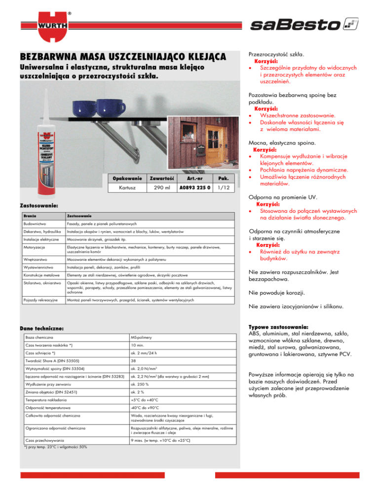 BEZBARWNA MASA USZCZELNIAJĄCO KLEJĄCA Uniwersalna i elastyczna, strukturalna masa klejąco uszczelniająca o przezroczystości szkła. Przezroczystość szkła. Korzyści: Szczególnie przydatny do widocznych i przezroczystych elementów oraz uszczelnień. Pozostawia bezbarwną spoinę bez podkładu. Korzyści: Wszechstronne zastosowanie. Doskonałe własności łączenia się z wieloma materiałami. Opakowanie Zawartość Art.-nr Pak. Kartusz 290 ml A0893 225 0 1/12 Mocna, elastyczna spoina. Korzyści: Kompensuje wydłużanie i wibracje klejonych elementów. Pochłania naprężenia dynamiczne. Umożliwia łączenie różnorodnych materiałów. Odporna na promienie UV. Korzyści: Stosowana do połączeń wystawionych na działanie światła słonecznego. Zastosowanie: Branża Zastosowanie Budownictwo Fasady, panele z pianek poliuretanowych Dekarstwo, hydraulika Instalacja okapów i rynien, wzmocnień z blachy, luków, wentylatorów Instalacje elektryczne Mocowanie skrzynek, gniazdek itp. Motoryzacja Elastyczne łączenia w blacharstwie, mechanice, kontenery, burty naczep, panele drzwiowe, uszczelnienia komór Wnętrzarstwo Mocowanie elementów dekoracji wykonanych z polistyrenu Wystawiennictwo Instalacja paneli, dekoracji, zamków, profili Konstrukcje metalowe Elementy ze stali nierdzewnej, oświetlenie ogrodowe, skrzynki pocztowe Stolarstwo, okniarstwo Opaski okienne, listwy przypodłogowe, szklane paski, odbojniki na szklanych drzwiach, wsporniki, parapety, schody, przeszklone pomieszczenia, elementy ze stali galwanizowanej, listwy ochronne Pojazdy rekreacyjne Montaż paneli tworzywowych, przegród, ścianek, systemów wentylacyjnych Odporna na czynniki atmosferyczne i starzenie się. Korzyści: Również do użytku na zewnątrz budynków. Nie zawiera rozpuszczalników. Jest bezzapachowa. Nie powoduje korozji. Nie zawiera izocyjanianów i silikonu. Dane techniczne: Baza chemiczna MS-polimery Czas tworzenia naskórka *) 10 min. Czas schnięcia *) ok. 2 mm/24 h Twardość Shore A (DIN 53505) 38 Wytrzymałość spoiny (DIN 53504) ok. 2,0 N/mm2 Łączona odporność na rozciąganie i ścinanie (DIN 53283) ok. 2,2 N/mm2 (dla warstwy o grubości 2 mm) Wydłużenie przy zerwaniu ok. 250 % Zmiana objętości (DIN 52451) ok. 2 % Temperatura nakładania +5°C do +40°C Odporność temperaturowa -40°C do +90°C Całkowita odporność chemiczna Woda, rozcieńczone kwasy nieorganiczne i ługi, rozwodnione środki czyszczące Ograniczona odporność chemiczna Rozpuszczalniki alifatyczne, paliwa, oleje mineralne, roślinne i zwierzęce tłuszcze i oleje Czas przechowywania 9 mies. (w temp. +10°C do +25°C) *) przy temp. 23°C i wilgotności 50% Typowe zastosowania: ABS, aluminium, stal nierdzewna, szkło, wzmocnione włókna szklane, drewno, miedź, stal surowa, galwanizowana, gruntowana i lakierowana, sztywne PCV. Powyższe informacje opierają się tylko na bazie naszych doświadczeń. Przed użyciem zalecane jest przeprowadzenie własnych prób.