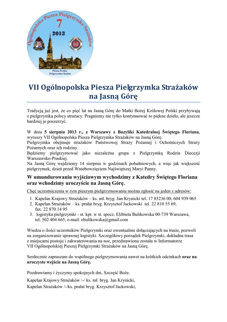 VII Ogólnopolska Piesza Pielgrzymka Strażaków na Jasną Górę Tradycją już jest, że co pięć lat na Jasną Górę do Matki Bożej Królowej Polski przybywają z pielgrzymką polscy strażacy. Pragniemy nie tylko kontynuować to piękne dzieło, ale jeszcze bardziej je poszerzyć. W dniu 5 sierpnia 2013 r., z Warszawy z Bazyliki Katedralnej Świętego Floriana, wyruszy VII Ogólnopolska Piesza Pielgrzymka Strażaków na Jasną Górę. Pielgrzymka obejmuje strażaków Państwowej Straży Pożarnej i Ochotniczych Straży Pożarnych oraz ich rodziny. Będziemy pielgrzymować jako niezależna grupa z Pielgrzymką Rodzin Diecezji Warszawsko-Praskiej. Na Jasną Górę wejdziemy 14 sierpnia w godzinach południowych, a więc jak większość pielgrzymek, dzień przed Wniebowzięciem Najświętszej Maryi Panny. W umundurowaniu wyjściowym wychodzimy z Katedry Świętego Floriana oraz wchodzimy uroczyście na Jasną Górę. Chęć uczestniczenia w tym pieszym pielgrzymowaniu można zgłosić na jeden z adresów: 1. Kapelan Krajowy Strażaków – ks. mł. bryg. Jan Krynicki tel. 17 85236 00, 604 939 065 2. Kapelan Strażaków – ks. prałat bryg. Krzysztof Jackowski tel. 22 810 55 69, fax. 22 870 14 95 3. logistyka pielgrzymki - st. kpt. w st. spocz. Elżbieta Bulikowska 00-739 Warszawa, tel. 502 404 665, e-mail: [email protected] Wiedza o ilości uczestników Pielgrzymki oraz ewentualnie dołączających na trasie, pozwoli na zorganizowanie sprawnej logistyki. Szczegółowy porządek Pielgrzymki, dokładna trasa z miejscami postoju i zakwaterowania na noc, przedstawiona została w Informatorze VII Ogólnopolskiej Pieszej Pielgrzymki Strażaków na Jasną Górę. Serdecznie zapraszam do wspólnego pielgrzymowania nawet na krótkich odcinkach oraz na uroczyste wejście na Jasną Górę. Pozdrawiamy i życzymy spokojnych dni, Szczęść Boże. Kapelan Krajowy Strażaków /-/ ks. mł. bryg. Jan Krynicki, Kapelan Strażaków /-/ks. prałat bryg. Krzysztof Jackowski, st. kpt. w st. spocz. Elżbieta Bulikowska. Podstawowe informacje dla pielgrzymów Ogólnopolskiej Pieszej Pielgrzymki Strażaków na Jasną Górę Wpisowe łącznie z bagażem to 160,00 zł + 6 konserw + 2 dżemy ... za całe 9 dni. Studenci, młodzież ucząca, dzieci do lat 12-tu oraz emeryci mają zniżkę. Jeżeli idziesz pierwszy raz na pielgrzymkę lub masz małe doświadczenie w pielgrzymowaniu to znajdziesz tutaj podstawowe informacje na temat tego, co powinieneś zabrać ze sobą na pielgrzymkę, jak się przygotować na pątniczy szlak. Dowiesz się również jak należy się zachować na pielgrzymce. Trasa pielgrzymki wynosi ok. 290 km i wymaga przejścia każdego dnia ok. 35 km w 6 – 7 etapach. Wyruszamy z Warszawy z Bazyliki Katedralnej Świętego Floriana i docieramy do klasztoru Jasnogórskiego w Częstochowie. Trasa biegnie różnymi drogami, bez względu na warunki atmosferyczne i stan dróg. Dzień pielgrzyma zaczyna się wcześnie rano przeważnie ok. 4:30 (ale bywa, że i wcześniej) a kończy się wieczornym apelem o 21:00. Każdego dnia pielgrzymom towarzyszy modlitwa poranna, modlitwa różańcowa, wspólny śpiew, codziennie Msza Św., konferencje. Po każdym etapie organizowany jest półgodzinny odpoczynek i jeden godzinny na obiad. Po dotarciu na nocleg zostaje czas na umycie się, kolację i przygotowanie się na kolejny dzień. Cisza nocna rozpoczyna się o godz. 22:00 w trosce o Twój odpoczynek, innych pielgrzymów.. Nocleg Każdego wieczoru, po całodziennym marszu pielgrzymka dociera do miejsca noclegowego. Nocujemy przeważnie w strażnicach (OSP PSP).Na noclegu zachowujemy czystość. Śmieci i odpadki na noclegu należy zgromadzić w jedno miejsce ,gdzie znajdują się wywieszone worki na śmieci. W miejscu odpoczynki w ciągu dnia służba ekologiczna rozstawia stojaki z workami na śmieci Strój pielgrzyma Od stroju w dużej mierze zależy komfort Twojego pielgrzymowania. Postaw na ubiór luźny, przewiewny, niekrępujący ruchy i – co najważniejsze – odpowiedni do sytuacji, jaką są rekolekcje w drodze, a zatem taki, w którym bez zażenowania możemy wejść do kościoła. Zbyt obcisłe, skąpe i wydekoltowane stroje do tego gatunku nie należą. Nie staraj się zaszokować innych modnym strojem. Buty pielgrzyma Nie ma tutaj jednej słusznej opcji, tak samo jak strój, wpływa na komfort pielgrzymowania to buty są podstawą. Wybór obuwia powinien być ukierunkowany na wygodę oraz dopasowanie do stopy. Nie mylić z rozmiarem buta gdzie stara szkoła pielgrzyma mówi aby but był o jeden rozmiar większy. Przy współczesnych technologiach produkcji obuwia nie jest to konieczne. Jeżeli but nie jest dobrze dopasowany to natychmiast pojawiają się bąble, otarcia, naderwania mięśni lub ścięgien. W zależności od upodobań pielgrzymów spotyka się na nogach buty trekingowe do marszu w górzystym terenie, buty typowo sportowe do biegania lub sandały. Nieodpowiednie są klapki, trampki, buty na obcasie, pantofle. Stopa musi być chroniona przed uderzaniem o twardą nawierzchnię drogi – inaczej gotowe odbicia stopy. Złą praktyką jest kupowanie obuwia dzień przed pielgrzymką. Postaraj się o wybór obuwia sprawdzonego. Natomiast dobrą praktyką jest zakładanie dwóch par skarpetek, jedna para przylegająca do stopy – cienkie skarpetki bawełniane, oddychające. Druga para nieco grubsze np. frote lub wełniane. Nie zakładaj tanich skarpetek z tworzyw sztucznych. Przed założeniem skarpetek i butów dobrze jest posypać stopy pudrem. Jeżeli ułożyły Ci się dobrze buty na stopach to ich nie zdejmuj bez potrzeby na odpoczynkach. Praktyczne okazują się tez wkładki higieniczne dla kobiet, w zastosowaniu jako wkładki do butów. Plecak podręczny. nie powinien być zbyt duży oraz zbyt mały. Powinien posiadać kilka przegródek oraz kieszeni – tak aby ułatwić przechowywanie rzeczy. Do plecaka podręcznego zabieramy : • Dokumenty potwierdzające Twoją tożsam