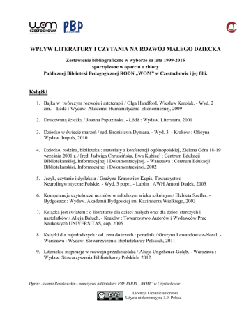 WPŁYW LITERATURY I CZYTANIA NA ROZWÓJ MAŁEGO DZIECKA Zestawienie bibliograficzne w wyborze za lata 1999-2015 sporządzone w oparciu o zbiory Publicznej Biblioteki Pedagogicznej RODN „WOM” w Częstochowie i jej filii. Książki 1. Bajka w twórczym rozwoju i arteterapii / Olga Handford, Wiesław Karolak. - Wyd. 2 zm.. - Łódź : Wydaw. Akademii Humanistyczno-Ekonomicznej, 2009 2. Drukowaną ścieżką / Joanna Papuzińska. - Łódź : Wydaw. Literatura, 2001 3. Dziecko w świecie marzeń / red. Bronisława Dymara. - Wyd. 3. - Kraków : Oficyna Wydaw. Impuls, 2010 4. Dziecko, rodzina, biblioteka : materiały z konferencji ogólnopolskiej, Zielona Góra 18-19 września 2001 r. / [red. Jadwiga Chruścińska, Ewa Kubisz] ; Centrum Edukacji Bibliotekarskiej, Informacyjnej i Dokumentacyjnej. - Warszawa : Centrum Edukacji Bibliotekarskiej, Informacyjnej i Dokumentacyjnej, 2002 5. Język, czytanie i dysleksja / Grażyna Krasowicz-Kupis, Towarzystwo Neurolingwistyczne Polskie. - Wyd. 3 popr.. - Lublin : AWH Antoni Dudek, 2003 6. Kompetencje czytelnicze uczniów w młodszym wieku szkolnym / Elżbieta Szefler. Bydgoszcz : Wydaw. Akademii Bydgoskiej im. Kazimierza Wielkiego, 2003 7. Książka jest światem : o literaturze dla dzieci małych oraz dla dzieci starszych i nastolatków / Alicja Baluch. - Kraków : Towarzystwo Autorów i Wydawców Prac Naukowych UNIVERSITAS, cop. 2005 8. Książki dla najmłodszych : od zera do trzech : poradnik / Grażyna Lewandowicz-Nosal. Warszawa : Wydaw. Stowarzyszenia Bibliotekarzy Polskich, 2011 9. Literackie inspiracje w rozwoju przedszkolaka / Alicja Ungeheuer-Gołąb. - Warszawa : Wydaw. Stowarzyszenia Bibliotekarzy Polskich, 2012 Oprac. Joanna Resakowska – nauczyciel bibliotekarz PBP RODN „WOM” w Częstochowie Licencja Uznanie autorstwa Użycie niekomercyjne 3.0. Polska 10. Literatura dziecięca : funkcje, kategorie, gatunki / Zofia Adamczykowa ; Wyższa Szkoła Pedagogiczna Towarzystwa Wiedzy Powszechnej. - Wyd. 2 rozsz.. - Warszawa : Wydaw. Wyższej Szkoły Pedagogicznej TWP, 2004 11. Literatura i książka dziecięca : słowo, obiegi, konteksty / Grzegorz Leszczyński ; Centrum Edukacji Bibliotekarskiej, Informacyjnej i Dokumentacyjnej. - Warszawa : Centrum Edukacji Bibliotekarskiej, Informacyjnej i Dokumentacyjnej, 2003 12. Literatura, wartość, dziecko / Bogusław Żurakowski. - Kraków : Oficyna Wydaw. Impuls, 1999. - 166 s. ; 24 cm 13. Mam 6 lat i gonię świat : poradnik dla bibliotekarzy i nauczycieli bibliotekarzy pracujących z sześciolatkami / Agata Arkabus. - Warszawa : Wydaw. Stowarzyszenia Bibliotekarzy Polskich, 2014 14. Miś - zabawka - bohater literacki - wzór wychowawczy : poradnik / Justyna Binio. Warszawa : Wydaw. Stowarzyszenia Bibliotekarzy Polskich, 2013 15. O literaturze dla dzieci i młodzieży / Kazimierz Cysewski. - Olsztyn : Wydaw. Uniwersytetu Warmińsko-Mazurskiego, 2001 16. Od czterech do sześciu : książki dla przedszkolaka / Grażyna Lewandowicz-Nosal. Warszawa : Wydaw. Stowarzyszenia Bibliotekarzy Polskich, 2012 17. Od literatury dla dzieci do literatury dziecięcej : (tematy, gatunki, konteksty) / Ryszard Waksmund. - Wrocław : Wydaw. Uniwersytetu Wrocławskiego, 2000 18. Po potopie : dziecko, książka i biblioteka w XXI wieku : diagnozy i postulaty : praca zbiorowa / red. nauk. Danuta Świerczyńska-Jelonek, Grzegorz Leszczyński, Michał Zając. - Warszawa : Wydaw. Stowarzyszenia Bibliotekarzy Polskich, 2008 19. Poczytajmy : jak rozwijać w dziecku pasję czytania : poradnik / Mariella Lunardi ; tł. Stefan Tuszyński. - Kraków : Wydaw. OO. Franciszkanów Bratni Zew, cop. 2011 20. Pozwól, że Ci opowiem... : bajki, które nauczyły mnie, jak żyć / Jorge Bucay ; tłum. Ilona Ziętek-Segura. - Zakrzewo : Wydaw. Replika, cop. 2004 21. Rozwój kontaktów małego dziecka z literaturą : podręcznik / Alicja Ungeheuer-Gołąb. Warszawa : Stowarzyszenie Bibliotekarzy Polskich ; [Rzeszów] : Uniwerystet Rzeszowski, 2011 22. Sezamie, otwórz się! : z nowszych badań nad literaturą dla dzieci i młodzieży w Polsce i za granicą / red. Alicja Baluch, Kazimierz Gajda. - Kraków : Wydaw. Naukowe Akademii Pedagogicznej, 2001 Oprac. Joanna Resakowska – nauczyciel bibliotekarz PBP RODN „WOM” w Częstochowie Licencja Uznanie autorstwa Użycie niekomercyjne 3.0. Polska 23. Wychować miłośnika książki : czyli czytelnictwo i okolice / Justyna Truskolaska. Kraków : Maternus Media, cop. 2007 24. Wychowanie przez czytanie / Irena Koźmińska, Elżbieta Olszewska. - Warszawa : Świat Książki, 2014 Artykuły z czasopism 1. Badania potwierdzają: czytanie daje wyniki! // Biblioteka w Szkole. - 2007, nr 7/8, s. 1-3 2. Bariery w dostępie do lektury i rozrywek umysłowych / Anna Dołęga // Edukacja i Dialog. - 2006, nr 2, s. 67-70 3. Baśnie uczą odpowiedzialności / Danuta Waloszek // Wychowanie w Przedszkolu. 2004, nr 6, s. 9-13 4. Baśnie uczą życiowych ról / Mirosław Huszcz, Małgorzata Cichoń – Piasecka // Wychowanie w Przedszkolu. - 2003, nr 10 5. Biblioteka - dobre miejsce / Iwona Pietrucha // Wychowanie w Przedszkolu. - 2013, nr 5, s. 68-69 6. Biblioteka sojusznikiem nauczyciela / Agata Malinowska // Życie Szkoły. - 2003, nr 5, s. 293-295 7. Być razem poprzez wspólne czytanie / Alicja Baluch // Guliwer. - 2011, nr 1, s. 5-11 8. „Cała Polska czyta dzieciom" - kilka refleksji o głośnym czytaniu / Marzena Kowalczuk // Wychowanie na co Dzień. - 2003, nr 3, s. 9-10 9. Co zrobić, żeby dzieci czytały? : cykl oddziaływań wychowawczych dla uczniów klas początkowych i ich rodziców / Agata Maciejewska // Biblioteka w Szkole. - 2003, nr 1, s. 67 10. Codzienne czytanie / Joanna Rynek // Wychowanie w Przedszkolu. - 2007, nr 10, s. 42-44 11. Czwartkowe poranki z książką : rozwijanie czytelnictwa wśród dzieci z klas młodszych / Joanna Myślińska // Świetlica w Szkole. - 2008, nr 1, s. 14-15 12. Czy rodzice zachęcają dzieci do czytania? / Anna Czochra, Jadwiga Dziuba // Życie Szkoły.