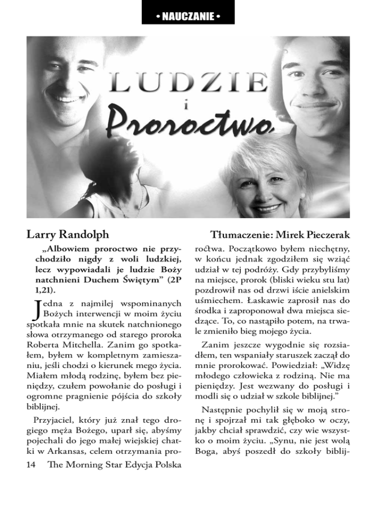 • NAUCZANIE • Larry Randolph „Albowiem proroctwo nie przychodziło nigdy z woli ludzkiej, lecz wypowiadali je ludzie Boży natchnieni Duchem Świętym” (P ,). J edna z najmilej wspominanych Bożych interwencji w moim życiu spotkała mnie na skutek natchnionego słowa otrzymanego od starego proroka Roberta Mitchella. Zanim go spotkałem, byłem w kompletnym zamieszaniu, jeśli chodzi o kierunek mego życia. Miałem młodą rodzinę, byłem bez pieniędzy, czułem powołanie do posługi i ogromne pragnienie pójścia do szkoły biblijnej. Przyjaciel, który już znał tego drogiego męża Bożego, uparł się, abyśmy pojechali do jego małej wiejskiej chatki w Arkansas, celem otrzymania pro The Morning Star Edycja Polska Tłumaczenie: Mirek Pieczerak roct wa. Początkowo byłem niechętny, w końcu jednak zgodziłem się wziąć udział w tej podróży. Gdy przybyliśmy na miejsce, prorok (bliski wieku stu lat) pozdrowił nas od drzwi iście anielskim uśmiechem. Łaskawie zaprosił nas do środka i zaproponował dwa miejsca siedzące. To, co nastąpiło potem, na trwale zmieniło bieg mojego życia. Zanim jeszcze wygodnie się rozsiadłem, ten wspaniały staruszek zaczął do mnie prorokować. Powiedział: „Widzę młodego człowieka z rodziną. Nie ma pieniędzy. Jest wezwany do posługi i modli się o udział w szkole biblijnej.” Następnie pochylił się w moją stronę i spojrzał mi tak głęboko w oczy, jakby chciał sprawdzić, czy wie wszystko o moim życiu. „Synu, nie jest wolą Boga, abyś poszedł do szkoły biblij- Ludzie i proroctwo nej. Wprawdzie jesteś powołany, lecz Bóg chce ciebie przeszkolić indywidualnie. Tego, co On zaplanował nie można się nauczyć w szkolnej klasie. Wkrótce Bóg otworzy drzwi do posługi i sam zobaczysz Jego finansowe zaopatrzenie. Więc pozostań w miejscu, a zobaczysz zbawienie od Pana.” Kwestia tego, czy Bóg mówi dzisiaj, czy nie przez głos proroczy jest jedną z największych kontrowersji wewnątrz chrześcijaństwa. Z błyskiem w oku ciągnął dalej: „Nie bądź rozczarowany. Owszem pójdziesz do szkoły, ale będzie to szkoła Ducha Świętego i zarazem twarda szkoła.” Potem z uśmiechem na twarzy otworzył swoją Biblię i zaczął podawać mi dalsze instrukcje, dotyczące innych dziedzin związanych z mym przeznaczeniem. Gdy skończył wiedziałem, że właśnie mignął mi przed oczyma obraz Bożej woli dla mojego życia. Minęły dwa trudne miesiące, zanim rzeczy zaczęły się wypełniać zgodnie z otrzymanym proroct wem. Stało się niemożliwe, abym uczęszczał do szko- ły biblijnej, a w kościele zaproponowano mi posługę, gdzie przez następnych parę lat uczyłem się prawdziwego znaczenia „szkolenia do pracy”. Doświadczyłem trudu światowej pracy, nocami studiując Biblię i posługując prawie co weekend w kościele. Gdy przeszedłem w służbie na pełny etat, byłem już lepiej wyposażony, aby wypełnić niezwykłą posługę, do której seminarium nie byłoby w stanie mnie przygotować. Dzięki Bogu zamiast słuchać typowej mądrości z głowy, posłuchałem słowa Pana wypowiedzianego przez jednego z Jego sług. Mówienie w imieniu Boga Kwestia tego, czy Bóg mówi dzisiaj, czy nie przez głos proroczy jest jedną z największych kontrowersji wewnątrz chrześcijaństwa. Dla wielu osób w kościele to, że człowiek może mówić w imieniu Boga jest przejawem arogancji, bądź jest zupełnie niemożliwe. Inni wierzą, że jest to możliwe, choć mało prawdopodobne, od kiedy żyjemy w czasie, gdy Bóg mówi tylko przez Słowo Boże. Bez względu na oba punkty widzenia, jestem przekonany, że Bóg zawsze przemawiał przez swoich ludzi i będzie tak aż do czasu Jego powrotu na ziemię. Faktycznie na przestrzeni całej Biblii wyznaczył mnóstwo mężczyzn i kobiet, by mówili w Jego imieniu. Zgodnie z Listem Piotra ,, Boży ludzie mówili w imieniu Pana, gdy poruszał ich Duch Święty. Psalmista Dawid potwierdził tę prawdę w Księdze Samuela , deklarując: „Duch Pana przemawia przeze mnie, a słowo jego jest na The Morning Star Edycja Polska •NAUCZANIE• języku moim.” Również Zachariasz w Ewangelii Łukasza , prorokował, że Bóg przemawiał ustami ludzi od samego początku. Tego samego dotyczą też inne przykłady, jak ten z Księgi Rodzaju ,, gdy Abraham wypowiedział słowo Pana do króla Abimelecha. Podobnie Mojżesz i Aaron byli Bożymi mówcami w Księdze Wyjścia, a Dawid i Samuel zasłynęli ze swych umiejętności dokładnego wyrażania serca Boga. W większej części Stary Testament pełen jest zapisów o ludziach, którym Bóg zlecił mówić w Jego zastępstwie. W erze Nowego Testamentu podobnie, Bóg zlecił apostołom Chrystusa, by mówili w Jego imieniu. W Ewangelii Mateusza , Pan poinstruował ich, aby poszli na cały świat i ogłaszali, że „przybliżyło się królestwo niebieskie.” Po latach napisali oni w kontekście biblijnych czasów ostatecznych, zaznaczając, że to prorocze słowo powinien ogłaszać każdy. Zgodnie z tym w Dz , Piotr opisywał dni ostateczne, jako czas, gdy synowie i córki będą prorokować nastanie królestwa Bożego. Dar Czym jest proroct wo? Istotą słów „proroct wo i prorokować” w języku greckim jest ogłaszać, oznajmiać, przewidywać, przepowiadać lub mówić pod natchnieniem. Proroct wo w swojej istocie oznacza, że Bóg przemawia przez człowieka. Po prostu jest to autorytatywne ogłaszanie Bożej woli dla człowieka i jako takie w Starym Testamencie jest użyte ponad razy, The Morning Star Edycja Polska kiedy Boży ludzie ogłaszali: „Tak mówi Pan.” Nowy Testament także jest pełen zadziwiających przykładów proroctwa w działaniu. Apostoł Paweł w Liście do Koryntian , poucza nas: „Starajcie się też usilnie o dary duchowe, a najbardziej o to, aby prorokować.” Wydaje się, że zrozumiał wartość tego daru, czemu dał wyraz objaśniając go w następnych wersetach rozdziału. Na ws