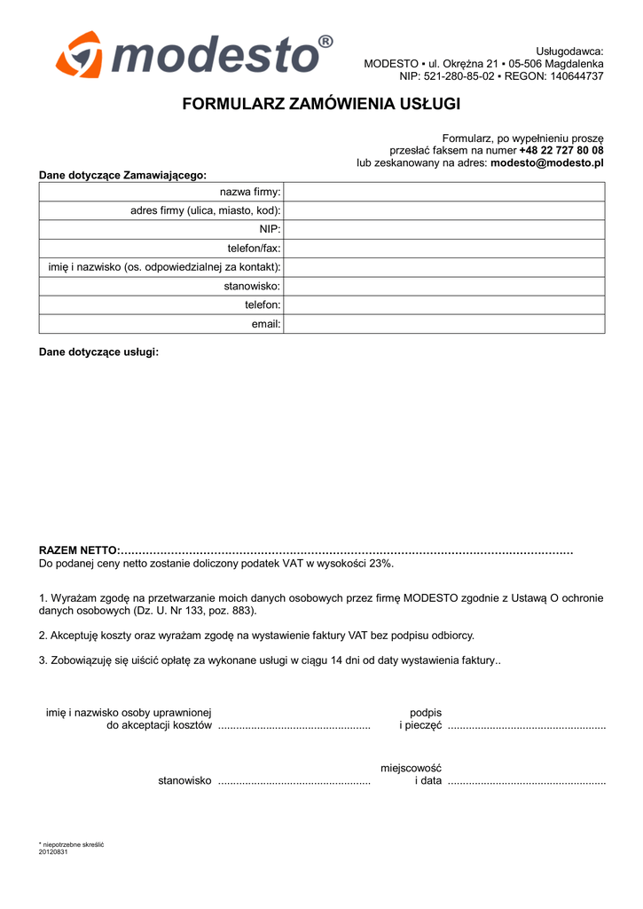 Usługodawca: MODESTO ▪ ul. Okrężna 21 ▪ 05-506 Magdalenka NIP: 521-280-85-02 ▪ REGON: 140644737 FORMULARZ ZAMÓWIENIA USŁUGI Formularz, po wypełnieniu proszę przesłać faksem na numer +48 22 727 80 08 lub zeskanowany na adres: [email protected] Dane dotyczące Zamawiającego: nazwa firmy: adres firmy (ulica, miasto, kod): NIP: telefon/fax: imię i nazwisko (os. odpowiedzialnej za kontakt): stanowisko: telefon: email: Dane dotyczące usługi: RAZEM NETTO:……………………………………………………………………………………………………………… Do podanej ceny netto zostanie doliczony podatek VAT w wysokości 23%. 1. Wyrażam zgodę na przetwarzanie moich danych osobowych przez firmę MODESTO zgodnie z Ustawą O ochronie danych osobowych (Dz. U. Nr 133, poz. 883). 2. Akceptuję koszty oraz wyrażam zgodę na wystawienie faktury VAT bez podpisu odbiorcy. 3. Zobowiązuję się uiścić opłatę za wykonane usługi w ciągu 14 dni od daty wystawienia faktury.. imię i nazwisko osoby uprawnionej do akceptacji kosztów ................................................... podpis i pieczęć ..................................................... stanowisko ................................................... miejscowość i data ..................................................... * niepotrzebne skreślić 20120831